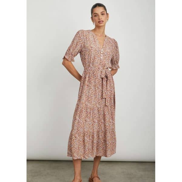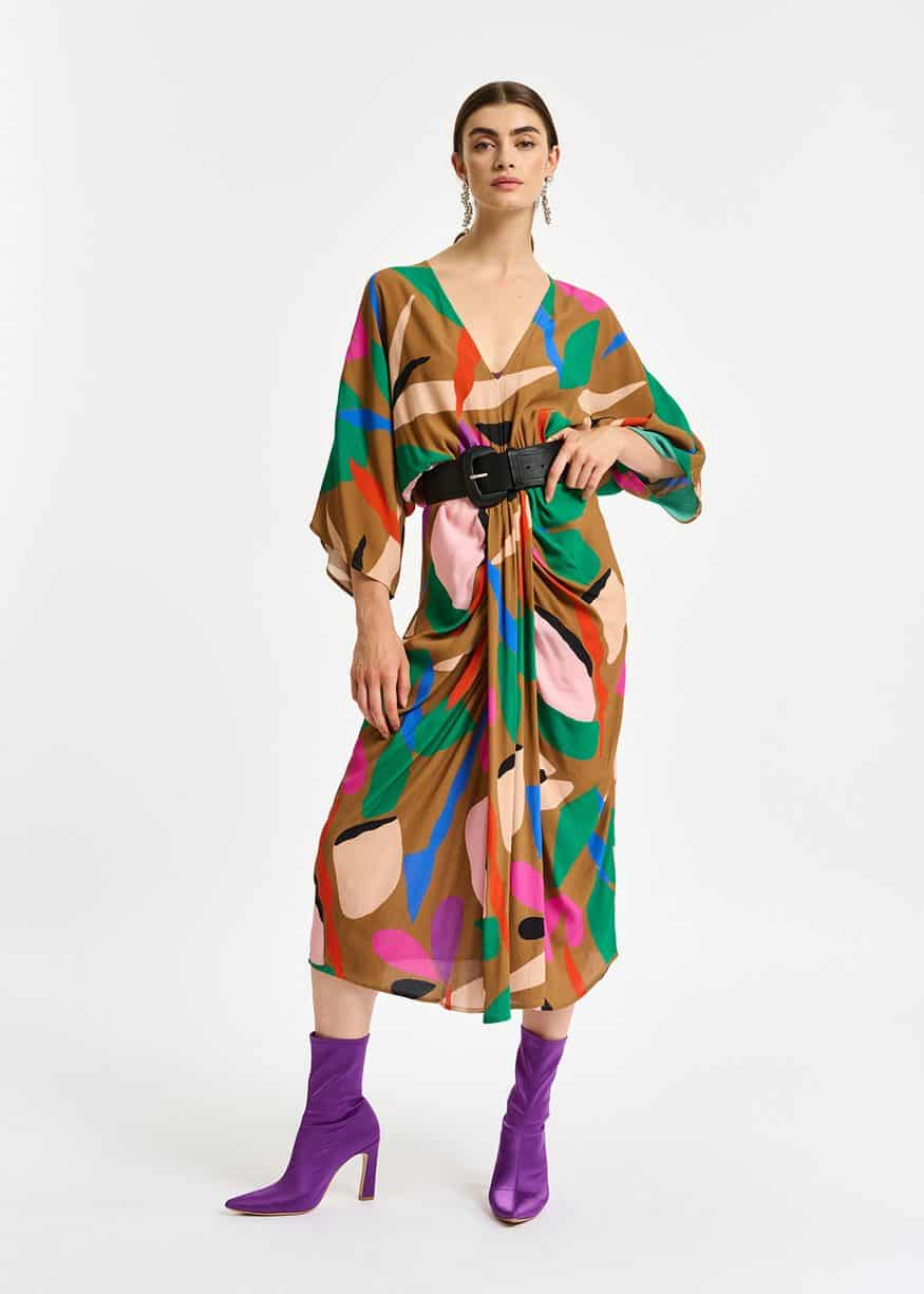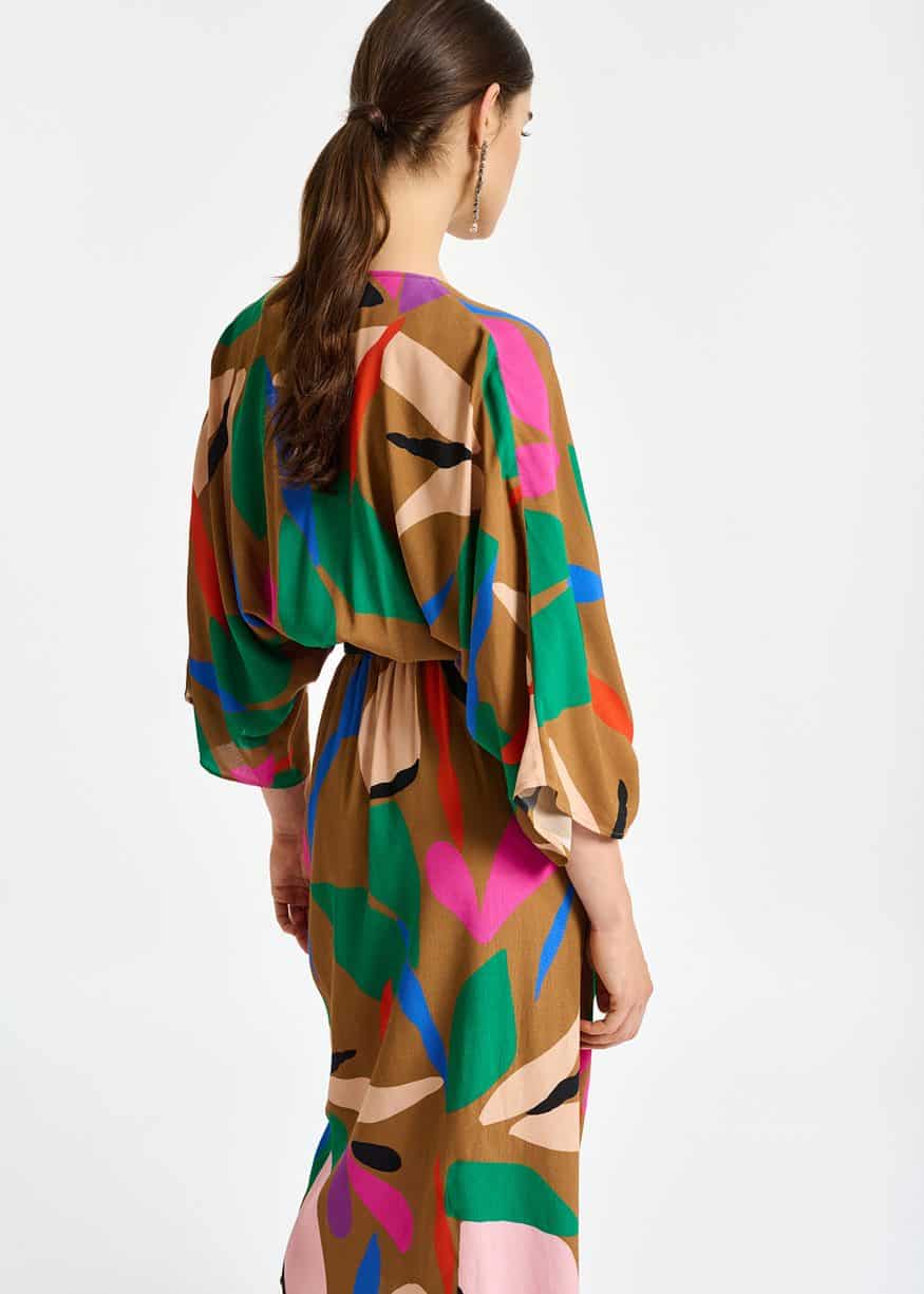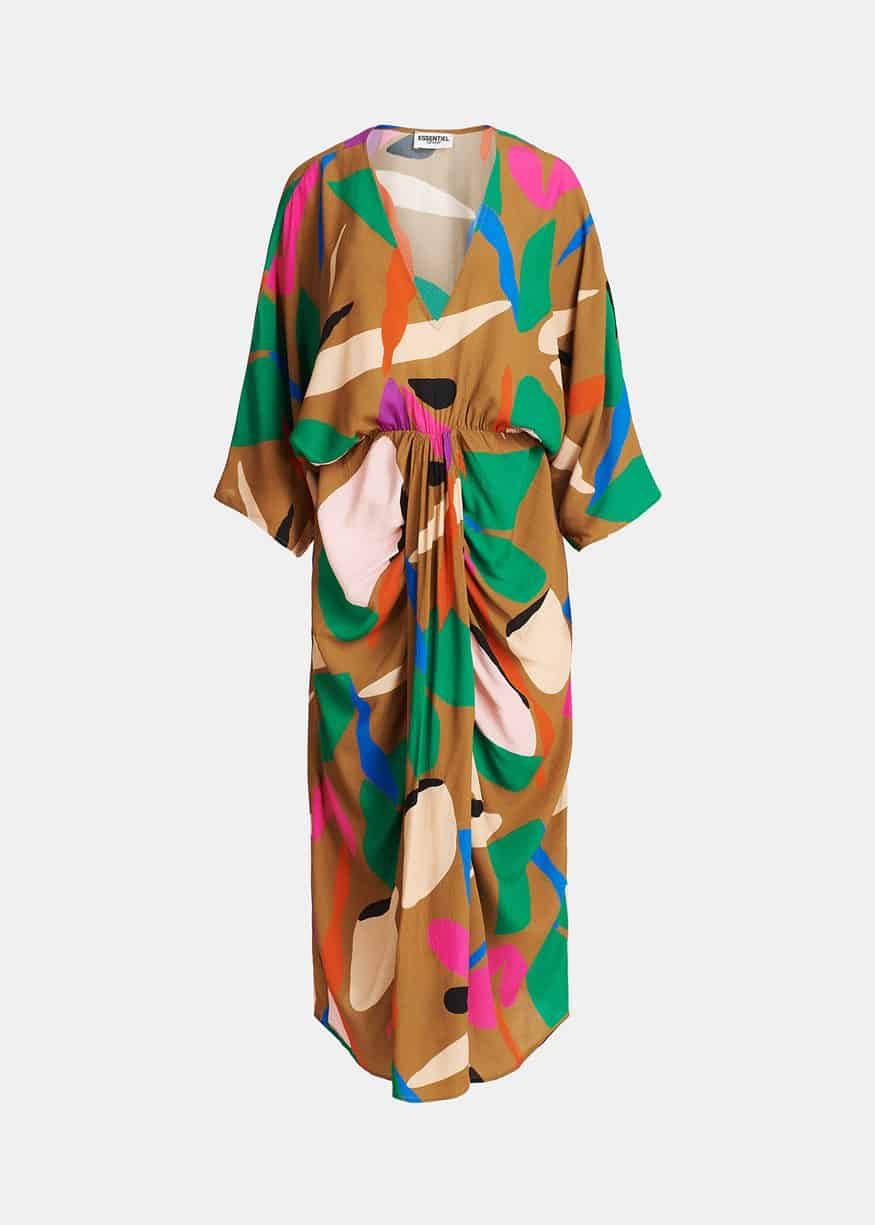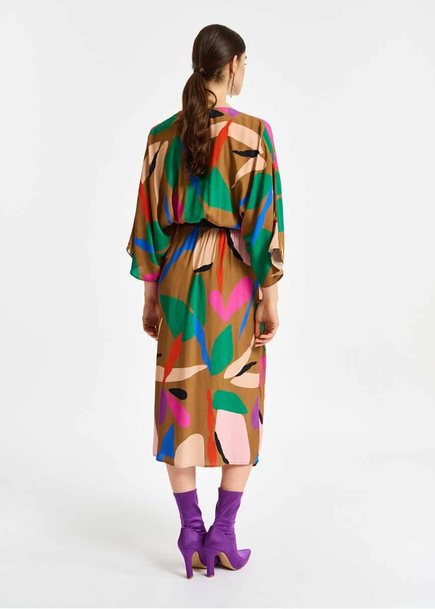 The Essentiel Antwerp Capuccino Kimono Wrap Dress in buckthorn brown is a gorgeous midi dress. The dress features a wrap skirt with box pleat gathering at the front is attached to a mid-length dress with a deep V-neckline and wide T-shirt sleeves. To emphasise the flowing drape, the light fabric with a striking design is kept unlined.