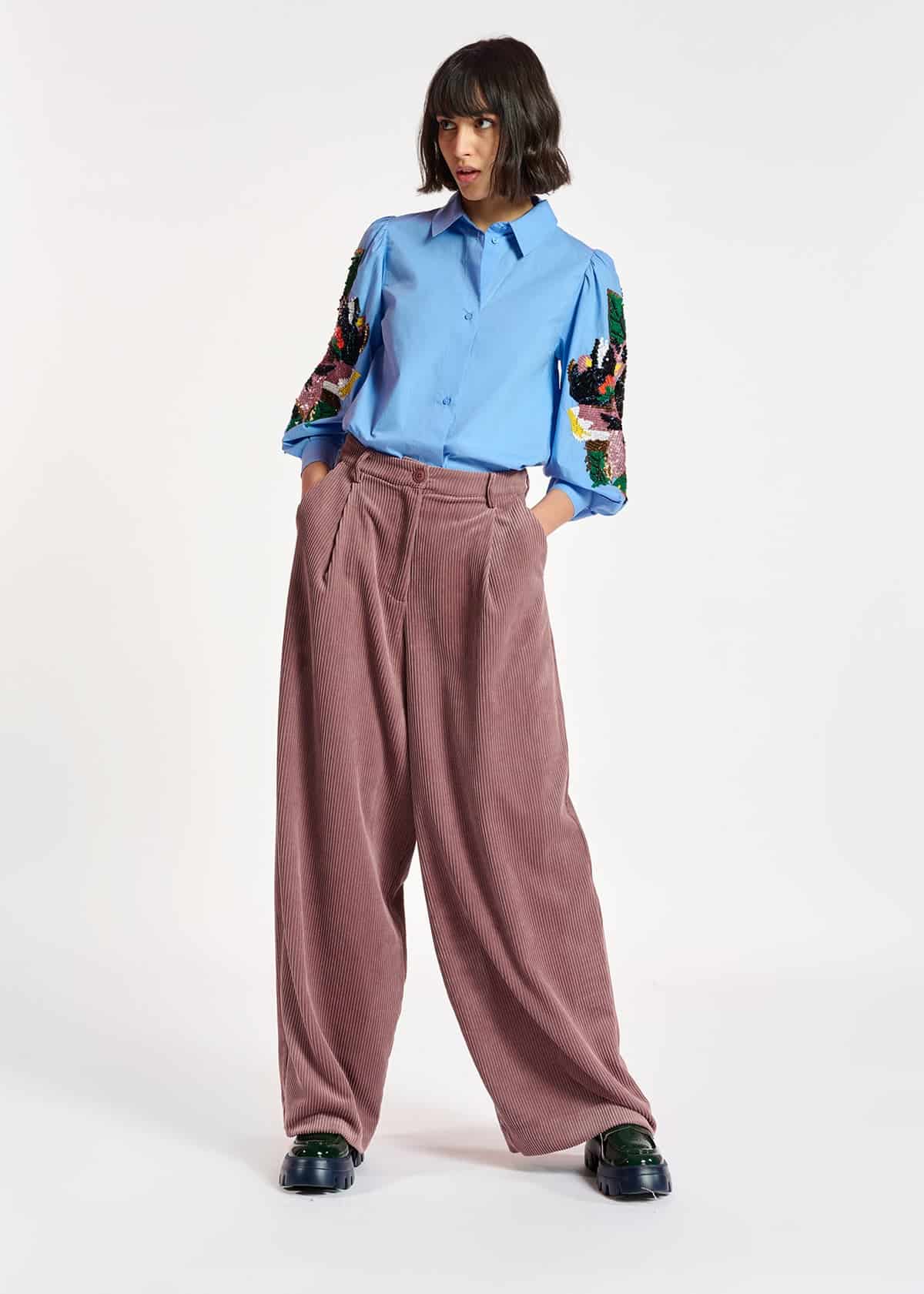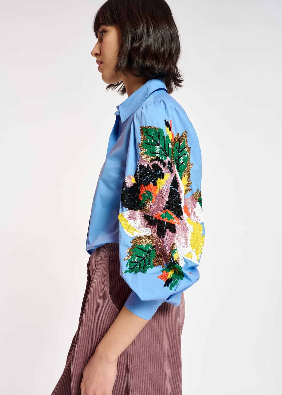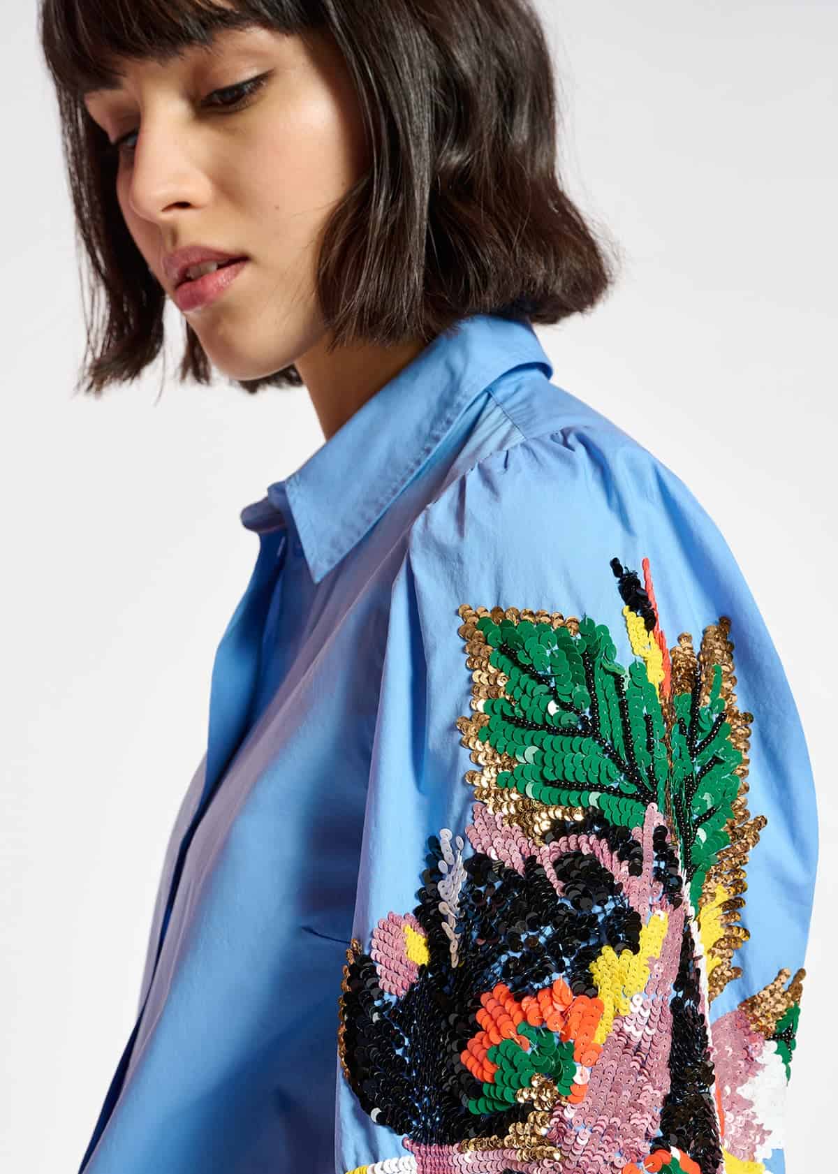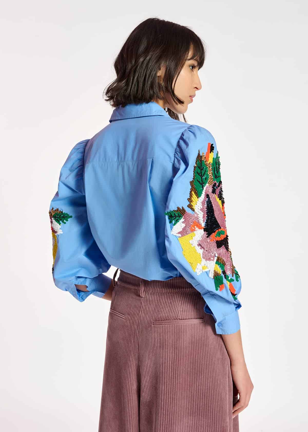 The Essentiel Antwerp Carnet Puff Sleeve Shirt cool blue is a gorgeous blue cotton shirt with a traditional collared neckline and front button closure. Featuring long, voluminous sleeves that are intricately beaded in a rainbow of colours. A statement piece to add to your wardrobe.