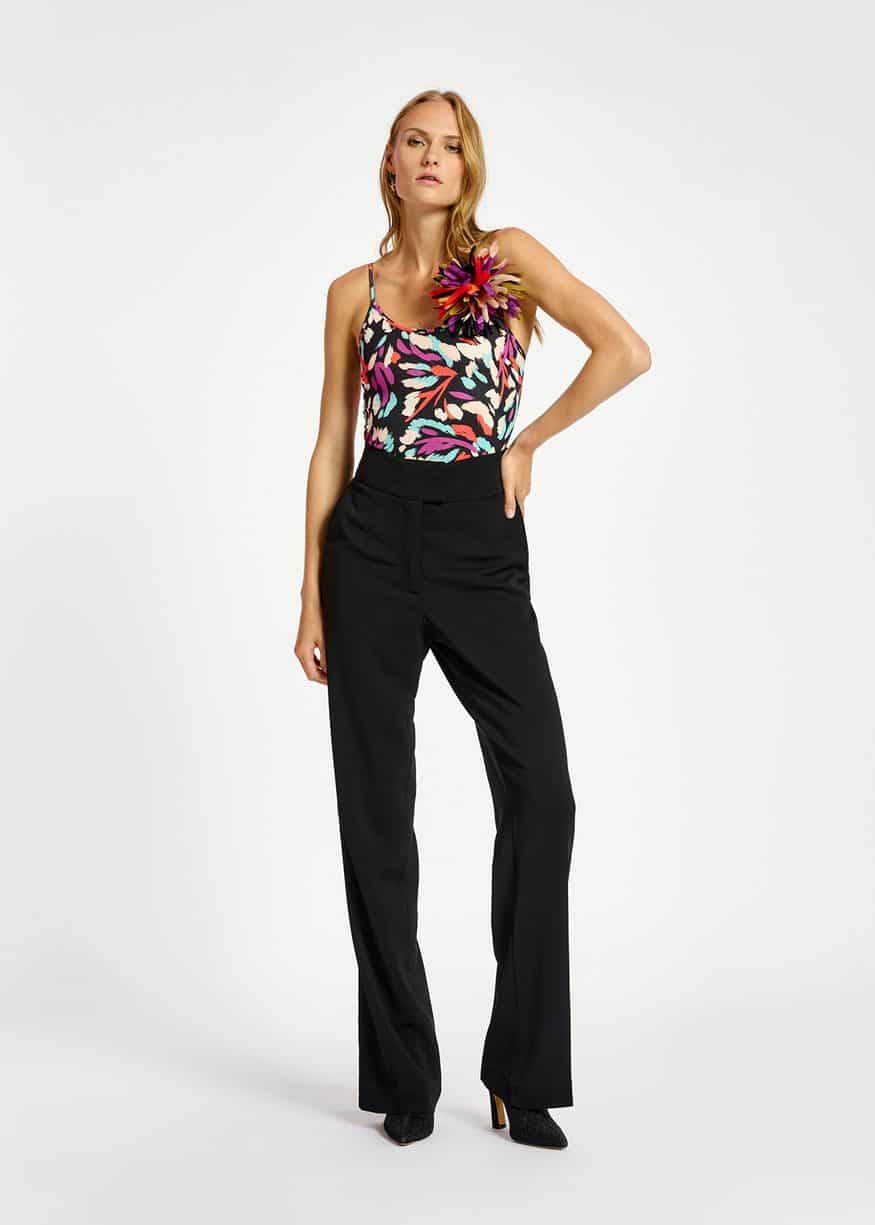 The Essentiel Antwerp Core Straight Leg Pants Black have a high-rise waist, pressed creases front and back, and practical slanted pockets at each side seam. They are tailored in a traditional straight-leg style. They are made of a shiny viscose-satin that may be worn to elegant dinners or to swiftly dress up a simple daily outfit.