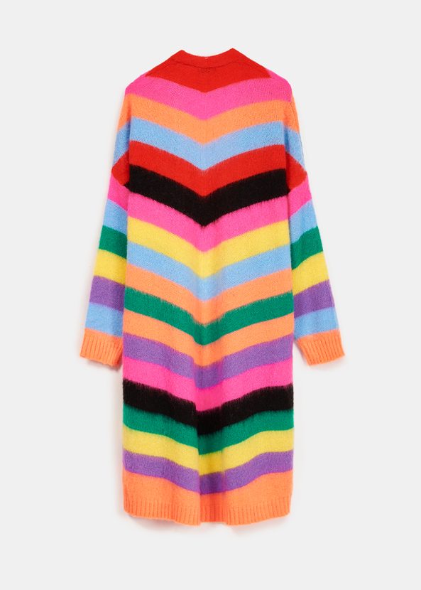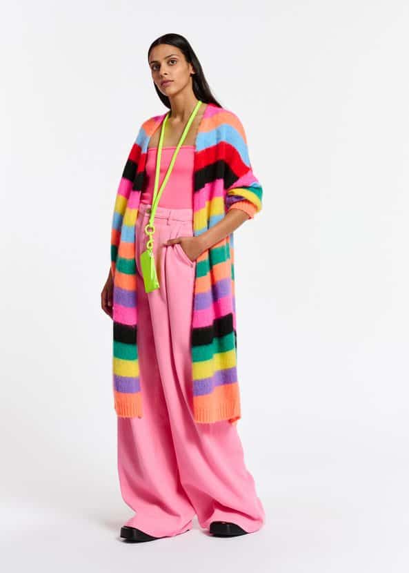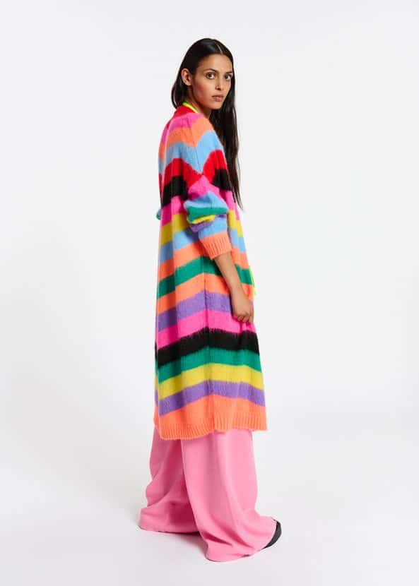 The Essentiel Antwerp Daju Striped Long Cardigan Gelato is the perfect item to refresh to your wardrobe with it's vibrantly coloured stripes. It is designed in a relaxed, longline shape with dropped shoulders that you can easily slip on over a tee and jeans of choice.