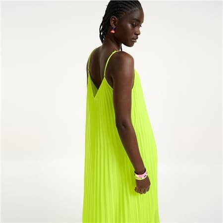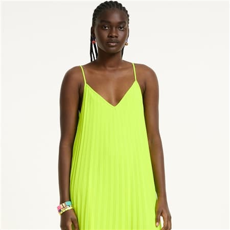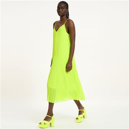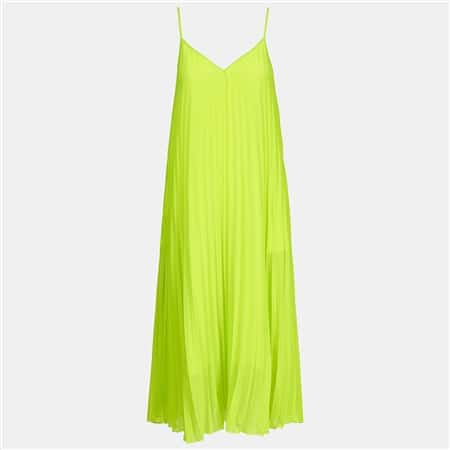 The Essentiel Antwerp Doozy Pleated Slip Dress High Alert High Alert is a vibrant pleated slip dress by Essentiel Antwerp and a stunning, eye-catching piece. It is a slip style dress which is sleeveless with adjustable straps and a v-neck. It is midi in length and features a pleated, floaty design in a stunning neon yellow colour. It is a beautiful dress that can be dressed up and down for any occasion.