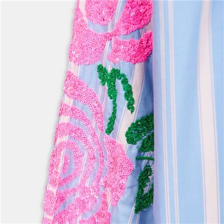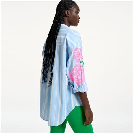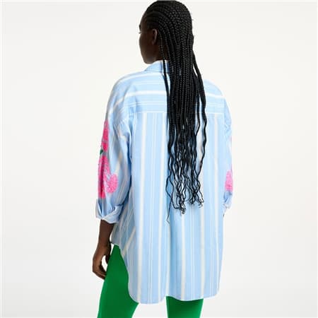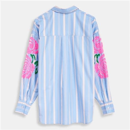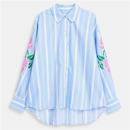 The Essentiel Antwerp Dorothy embellished shirt Nice Blue, designed in a crisp blue and white striped cotton, shirt is finished off in true Essentiel style with beautiful embroidery/beading down the sleeves. This style features: