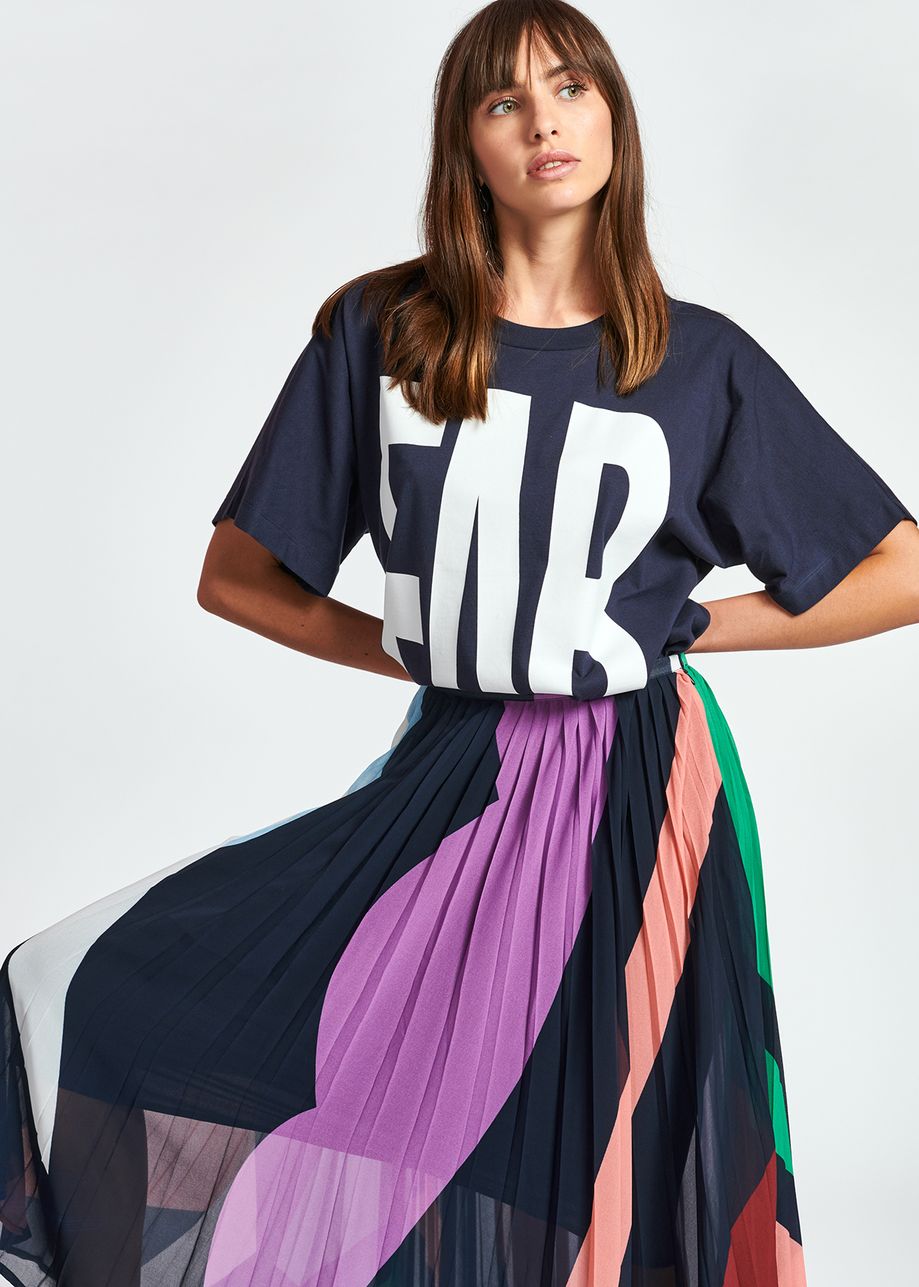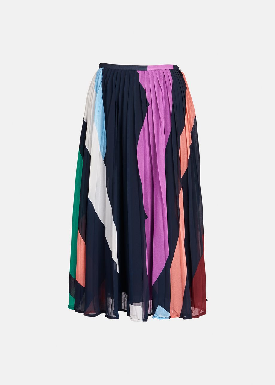 The Essentiel Antwerp Zalerie pleated skirt in dark blue, green and lilac is a midi-length skirt that has an A-line cut that drapes beautifully. The striking coloured pattern looks amazing when teamed with the Essentiel Antwerp Zyad t-shirt, creating the perfect casual outfit when teamed with D.A.T.E. trainers or style with boots or heels for a evening outfit.