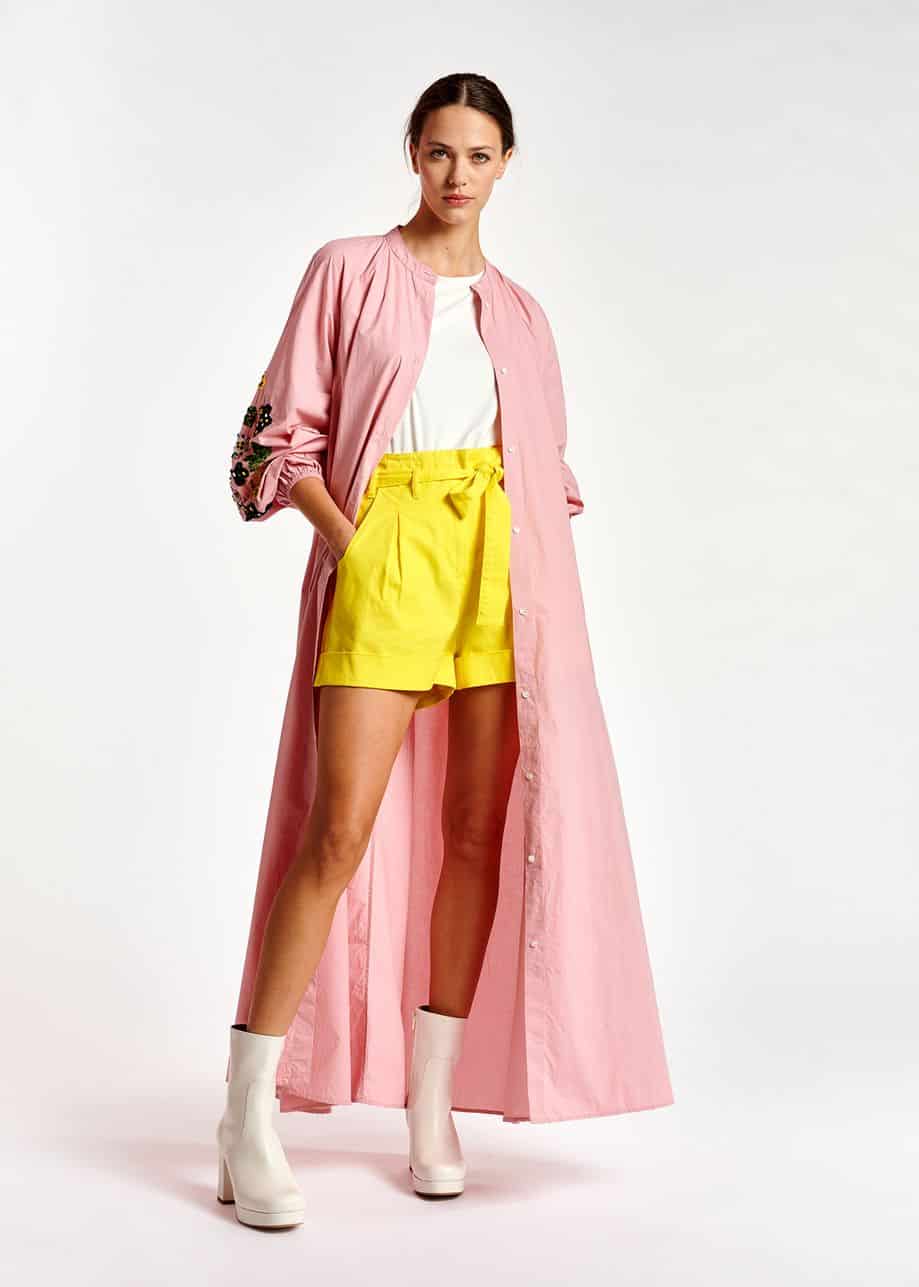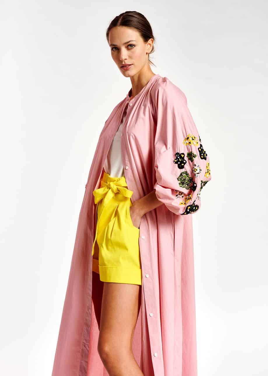 The Essentiel Antwerp Zum belted maxi dress in light pink is a beautiful loose fitting cotton dress which has voluminous sequin-embroidered sleeves and comes with a self-tie belt. The dress can be worn either open over a t-shirt and jeans or shorts as well as being worn as a dress, buttoned down the front and tied at the waist to create shape or worn without the belt for a more relaxed style. This dress will quickly become your favourite and is perfect for day or night.