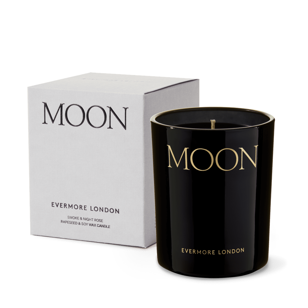 The Evermore London Moon candle is a stylish looking candle with a scent of delicate rose petals and spicy hints of saffron hover over a rich smoky base of vetivert and cade.