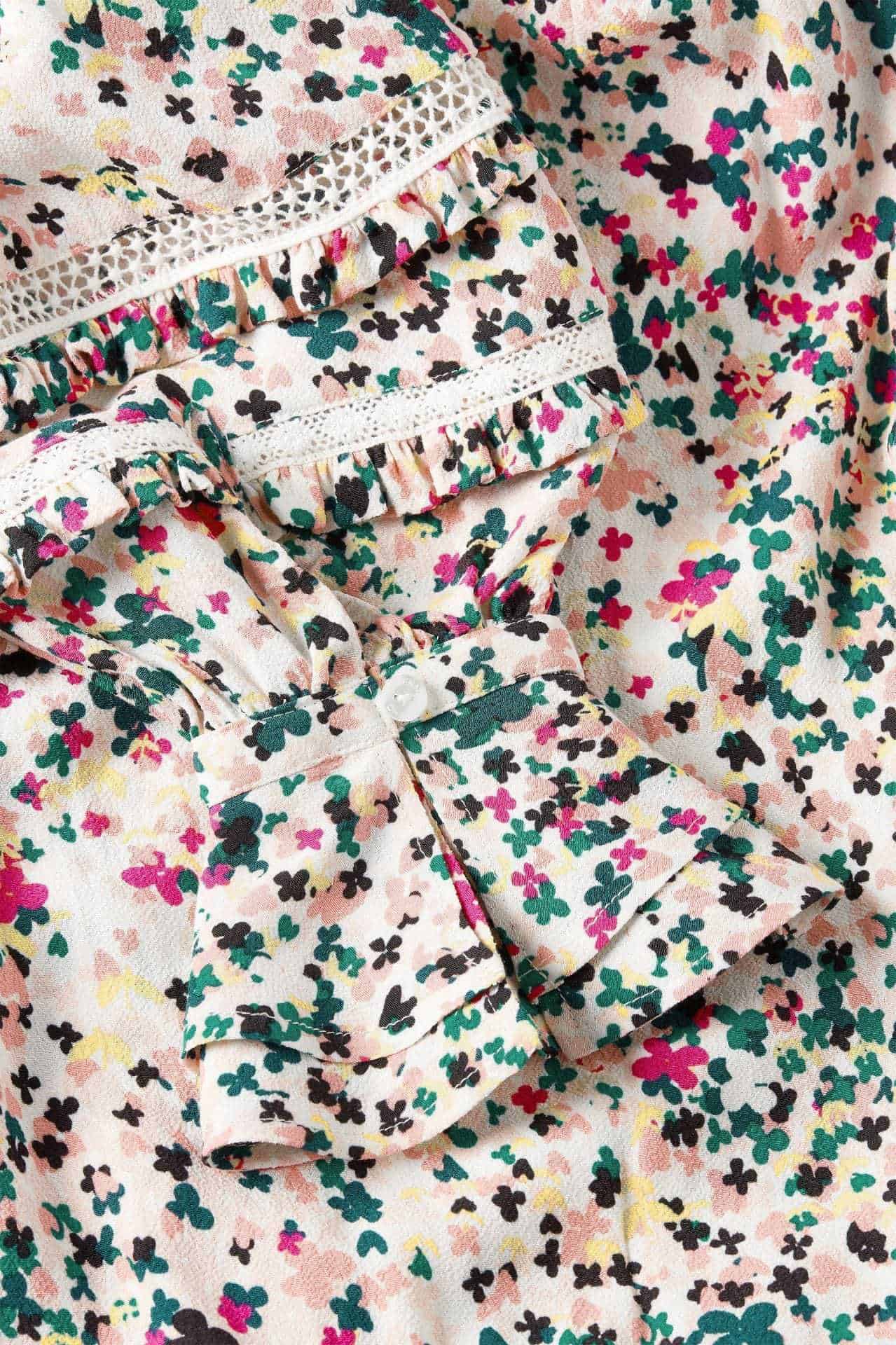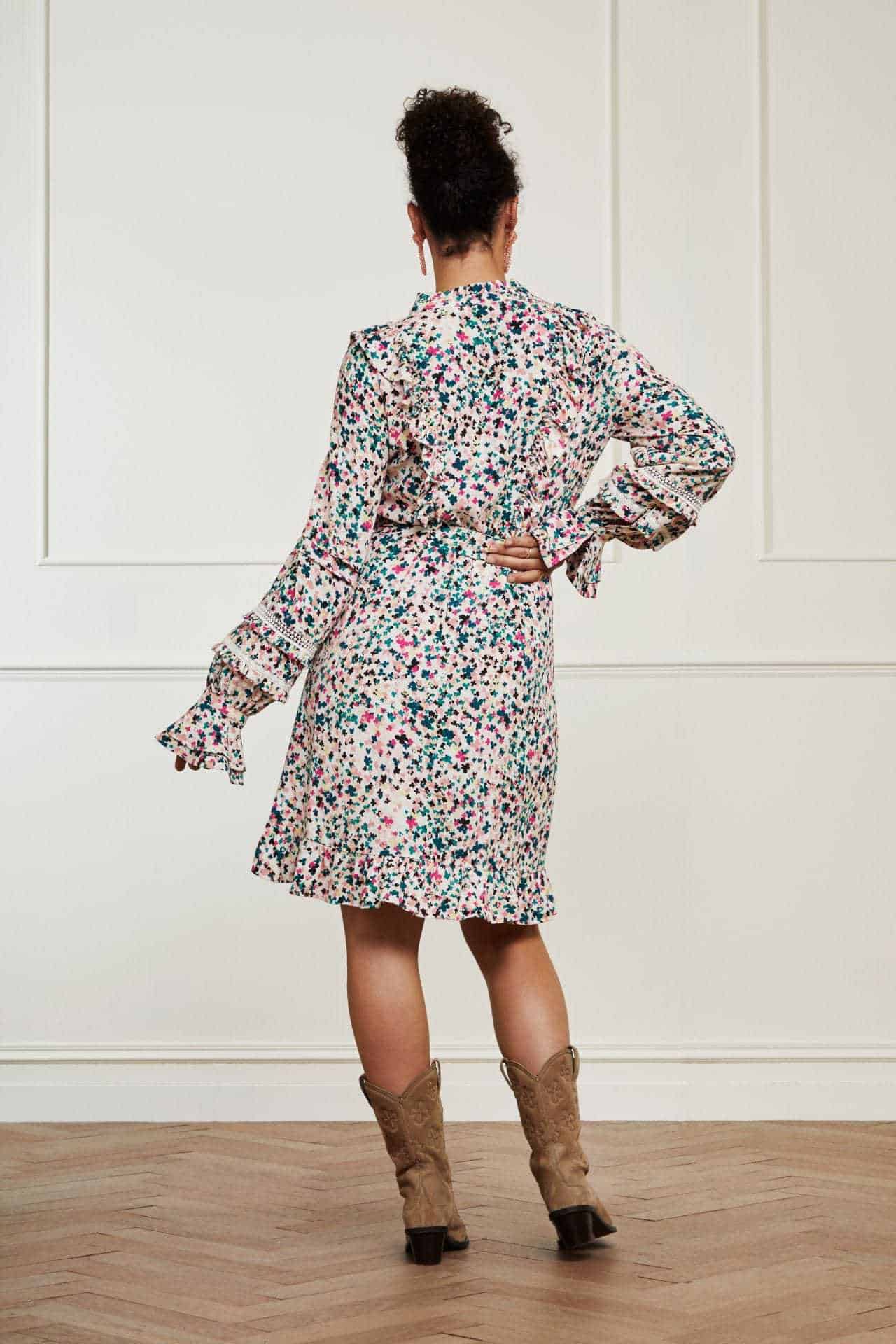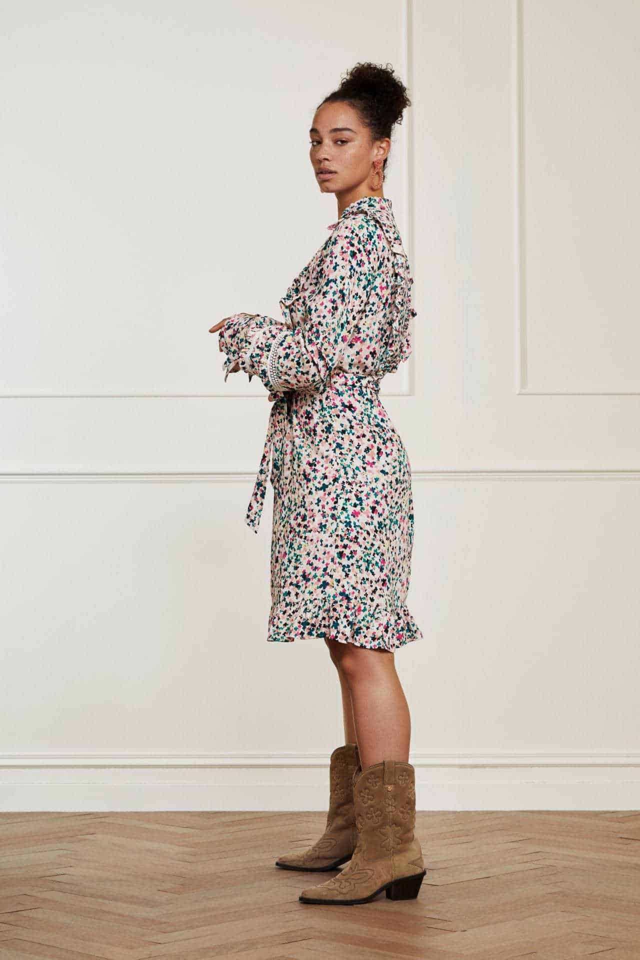 The Fabienne Chapot Cleo dress in love cloud is a lovely slightly fitted short dress that has lace trimmed wide sleeves and a self fabric tie belt. The dress has beautiful feminine ruffle details on the body and along the hem, it can be worn with or without the belt depending on how you want it to look. A perfect dress for wearing with trainers or boots depending on the weather.