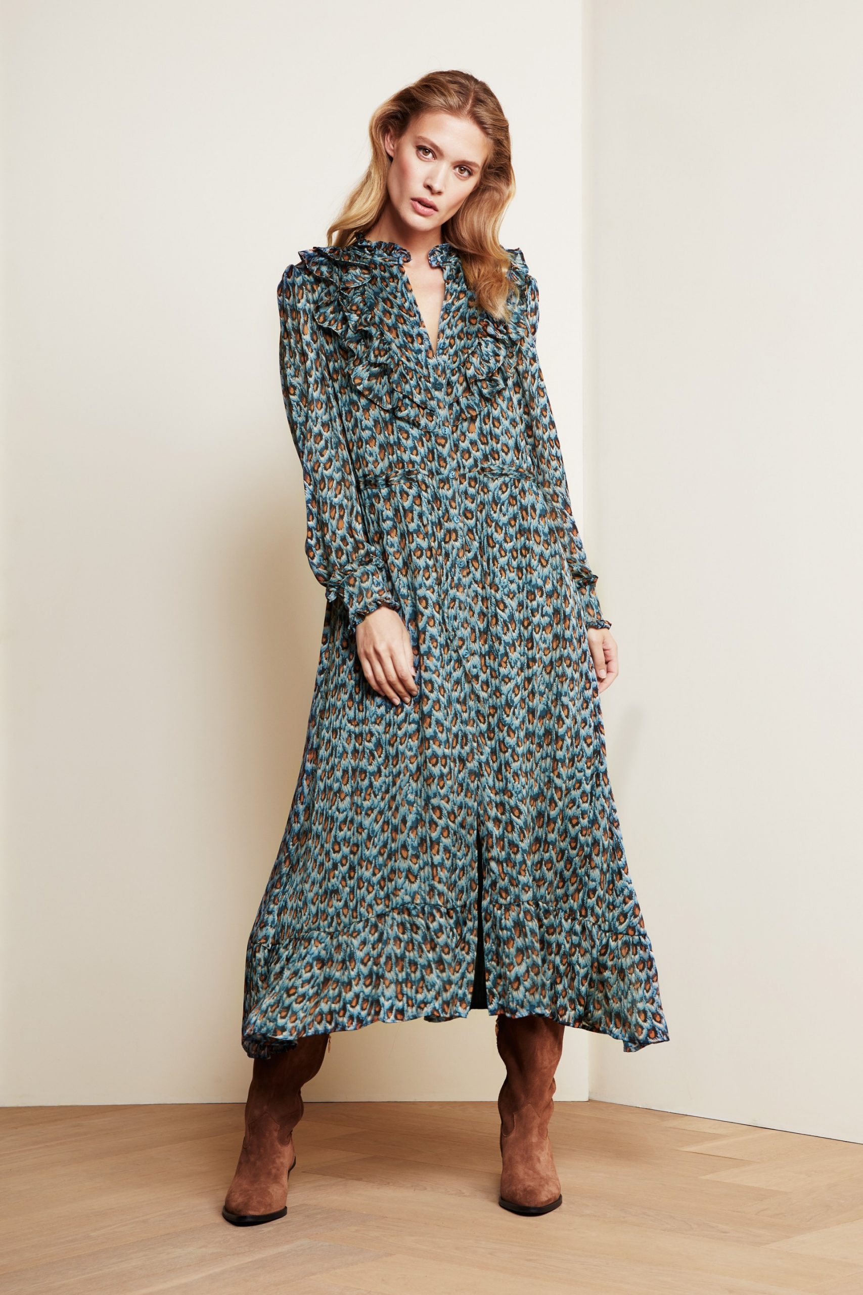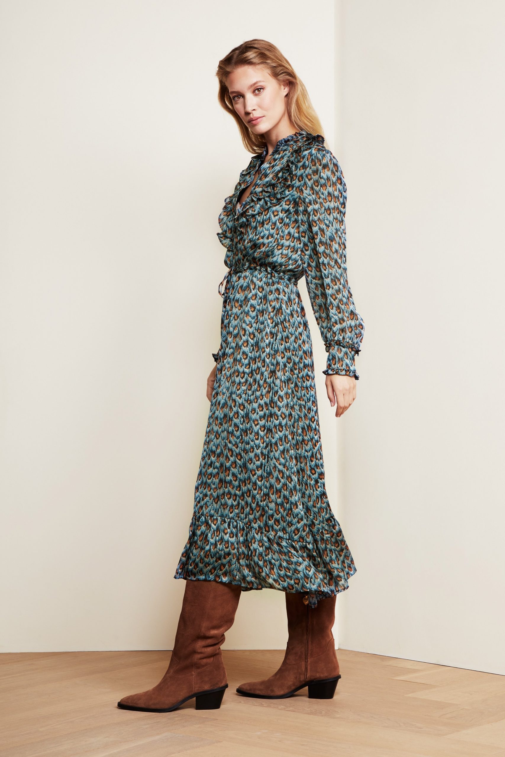 The Fabienne Chapot Fia Dress in Peacock Party is a flowing midi dress with waist belt and ruffle details in a sustainable recycled polyester. The Fia Dress has a button closure down the length of the dress.