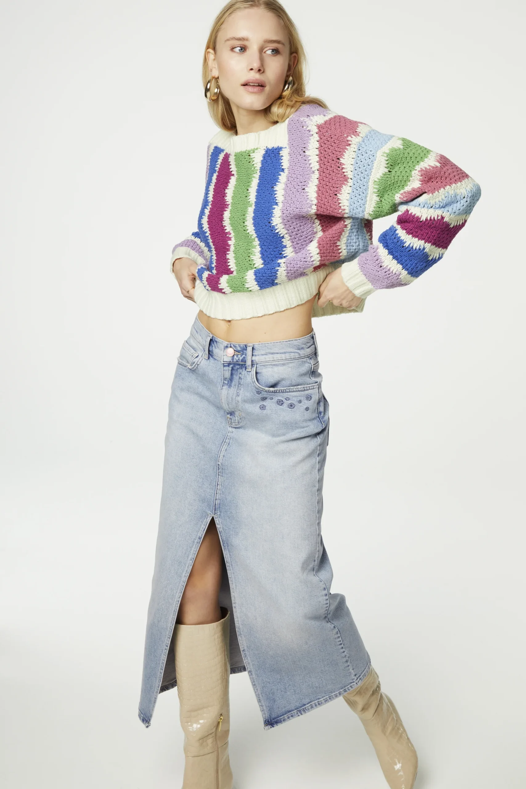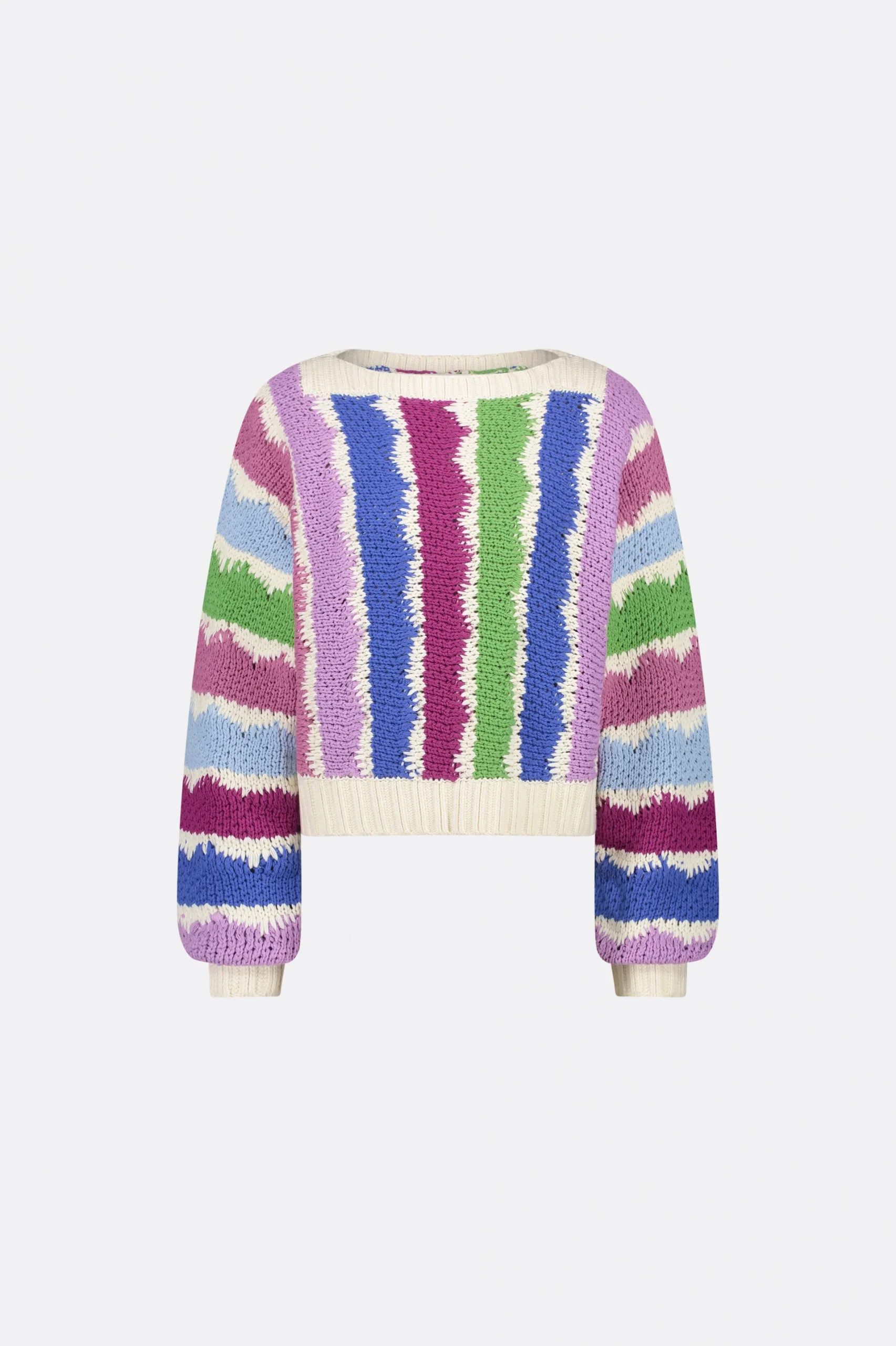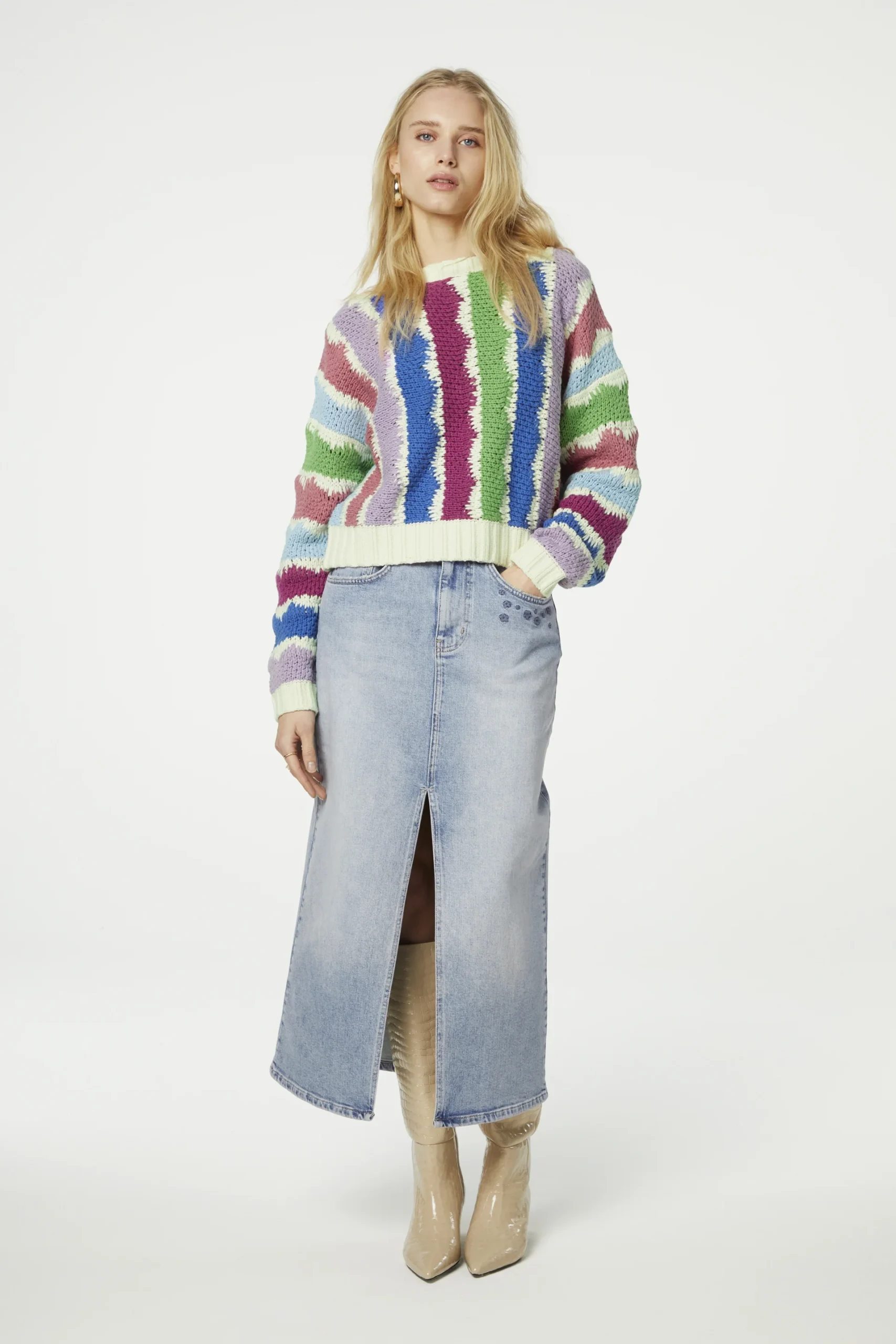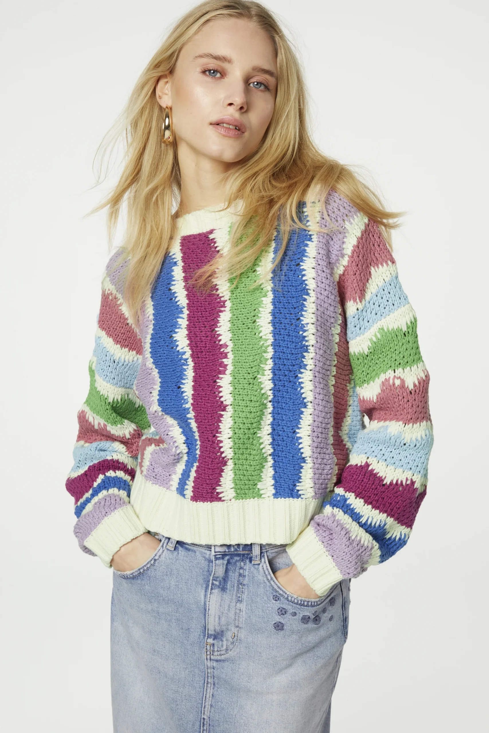 The Fabienne Chapot Heath Pullover Multi is a cosy long-sleeved pullover in white with multicolored stripes is perfect for adding a splash of color to your wardrobe. This pullover is made from a blend of 60% cotton and 40% acrylic, features a round neck and has a wide fit. Pair it with a denim maxi Skirt to complete your look.