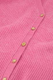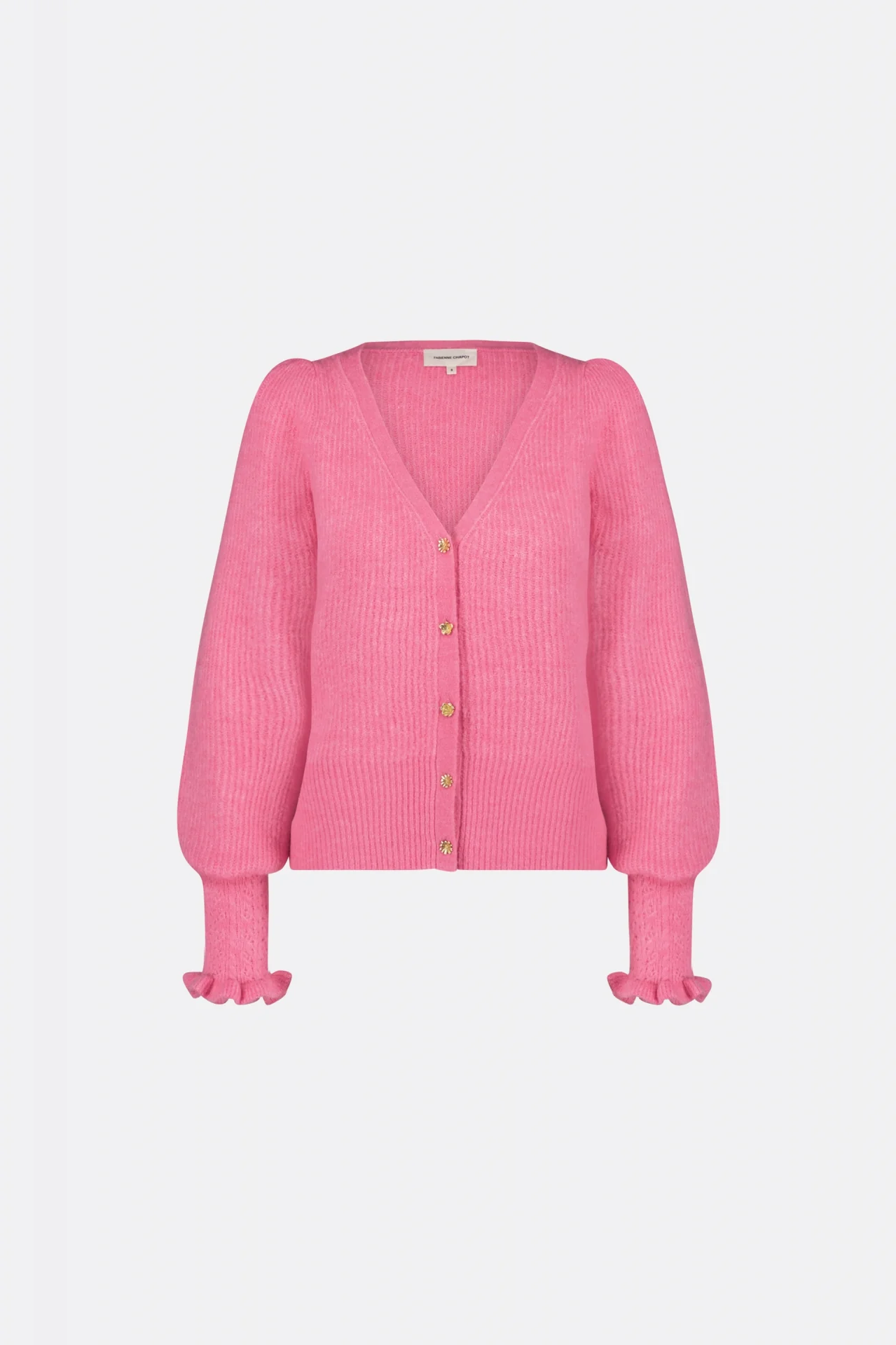 Fabienne Chapot Jessica Cardigan Pink Candy is a fine knitted cardigan with V-neck and button closure. The Jessica Cardigan has golden buttons and a ruffled detail on the cuffs. The perfect pop of colour to your wardrobe in time for spring with a cosy element of soft knit.