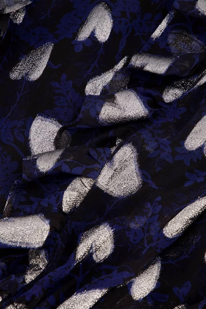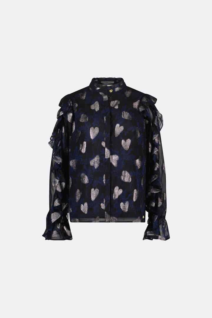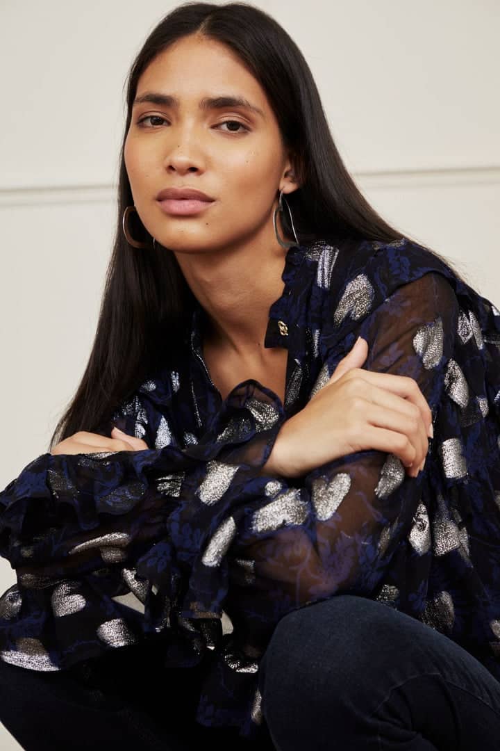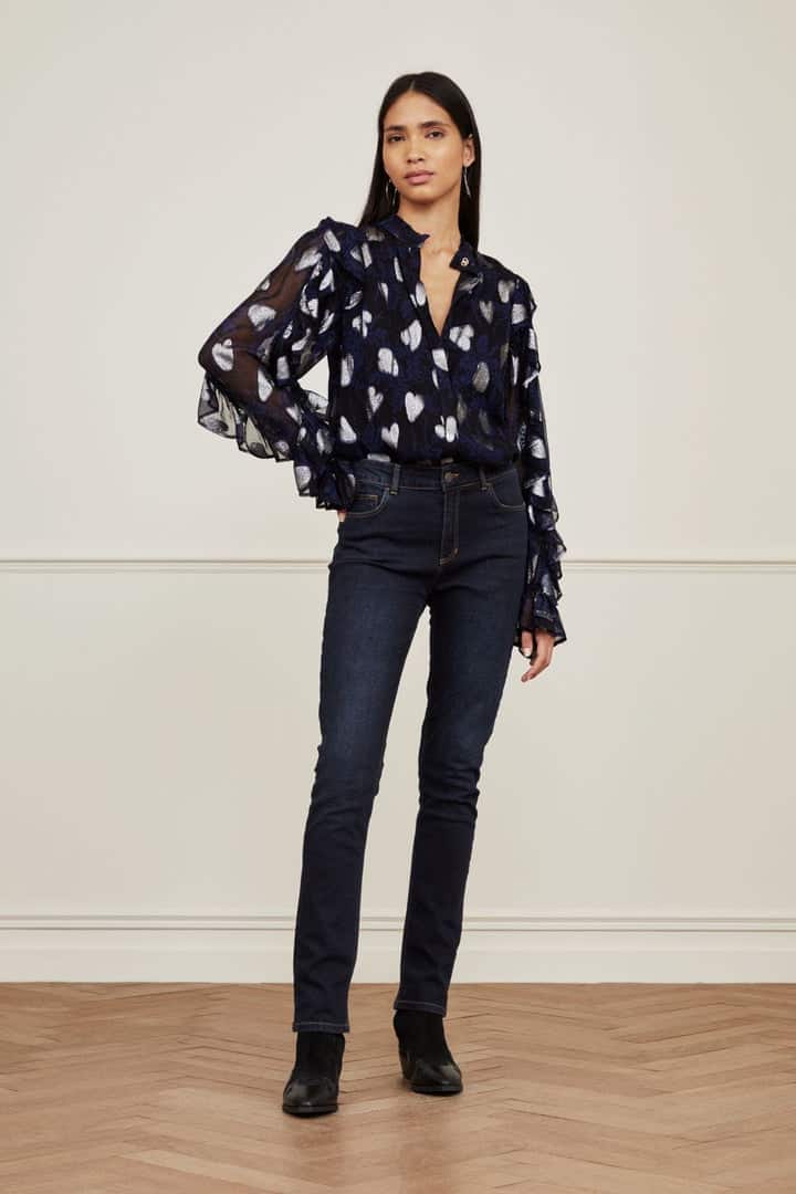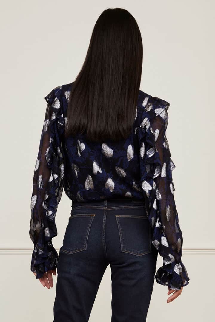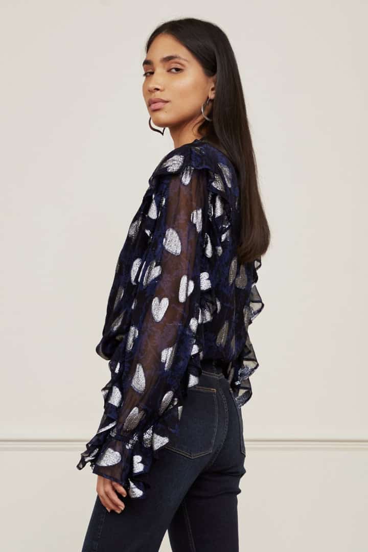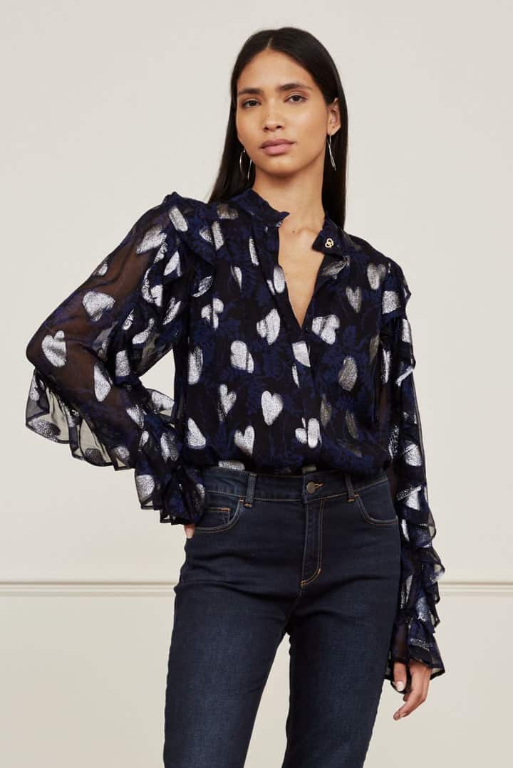 The Fabienne Chapot Josie Indi Blouse in Moonshine is a gorgeous top with balloon sleeves adorned with ruffles in a rich dark blue fabric adorned with silver lurex hearts. The Josie Long Sleeve Blouse has a high collarless neckline with little ruffle trim. This fabulous blouse has ruffles on the shoulders and ruffle fluting all the way down the sleeves that are semi opaque and finish with a deep ruffle cuff.  The Blouse has a concealed front button placket with a golden button on the collar.
