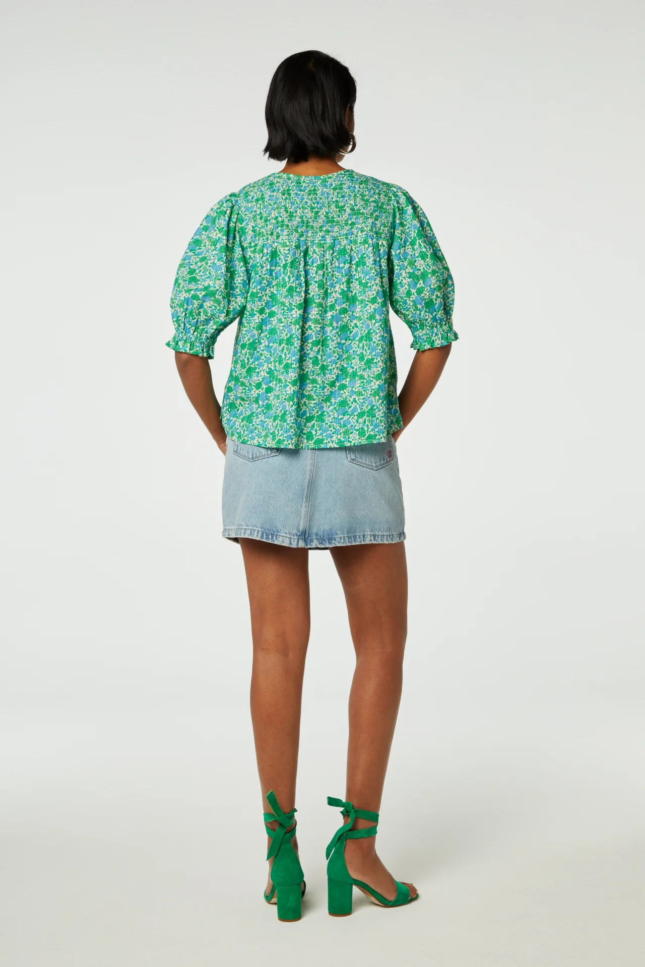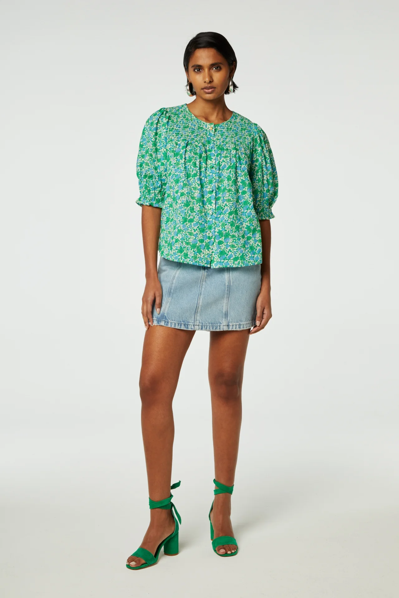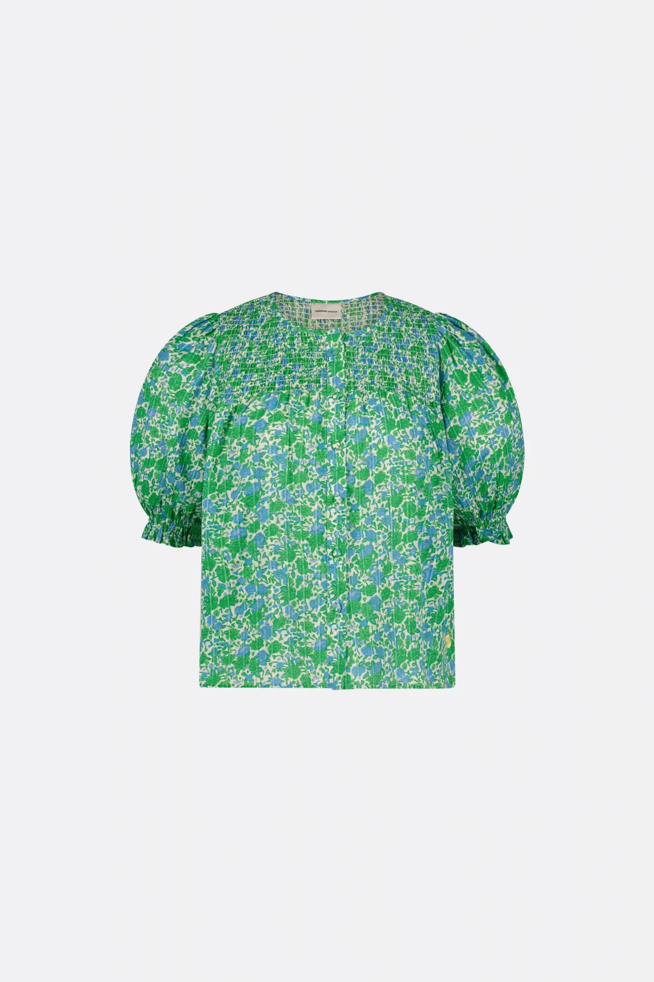 The Fabienne Chapot June Short Sleeve Blouse Green Clueless is a colourful top with round neckline and short balloon sleeves with cuffs. This blouse has an all-over 'Green Clueless' print the perfect addition to your spring summer wardrobe. Pair with your favourite Cocaranti denim and sandals for a go-to look.
