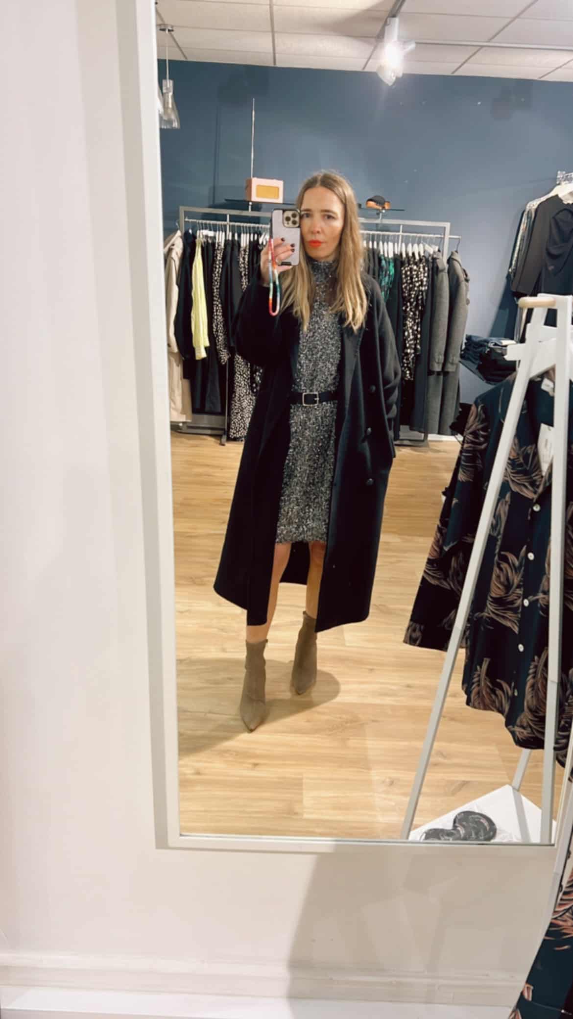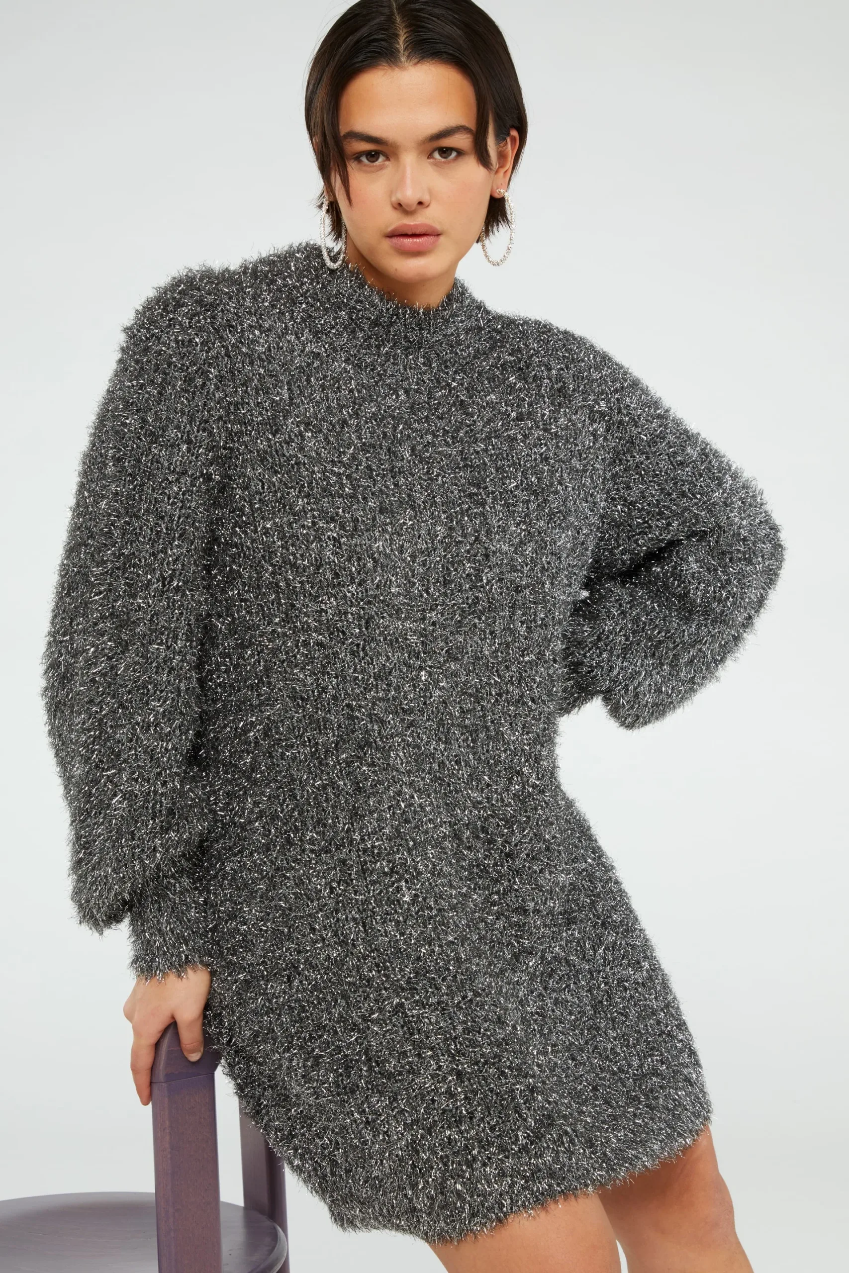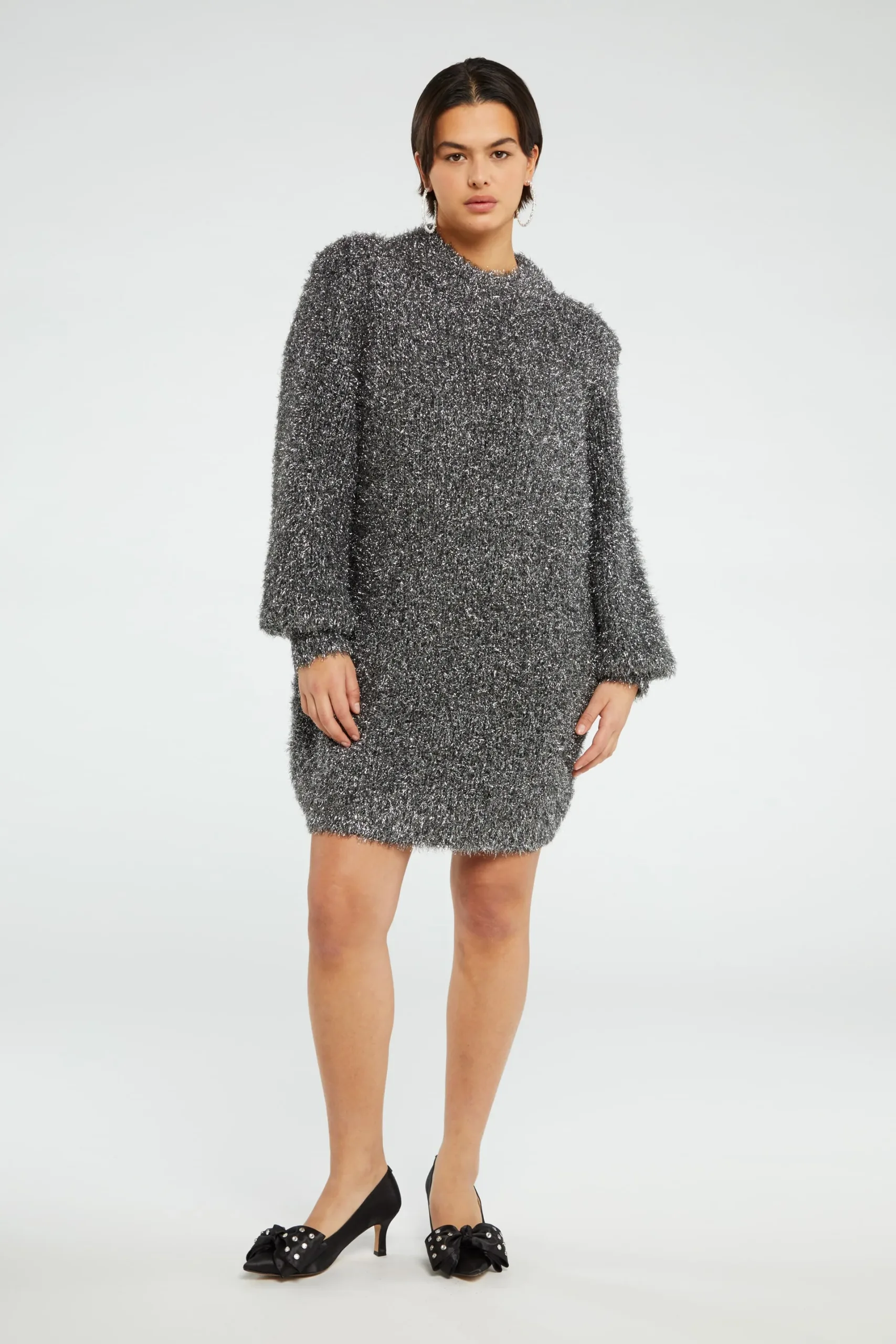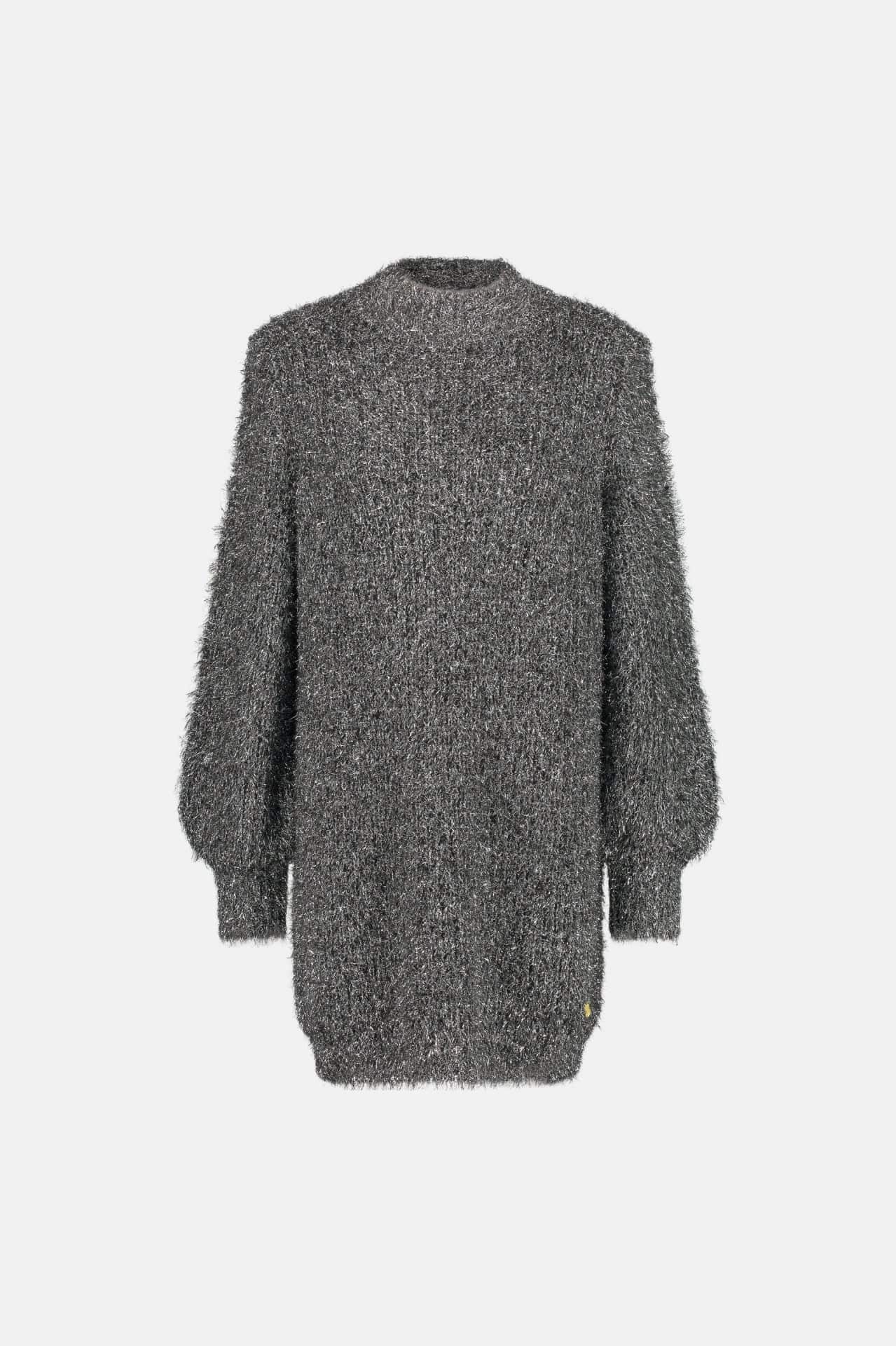 The Fabienne Chapot Kitty Dress Dark Silver is a short dress with glitter details. The Kitty Dress has balloon sleeves and elastic band at neckline. With a high neckline this dress combines elegance and glamour, the perfect dress for any festive event.