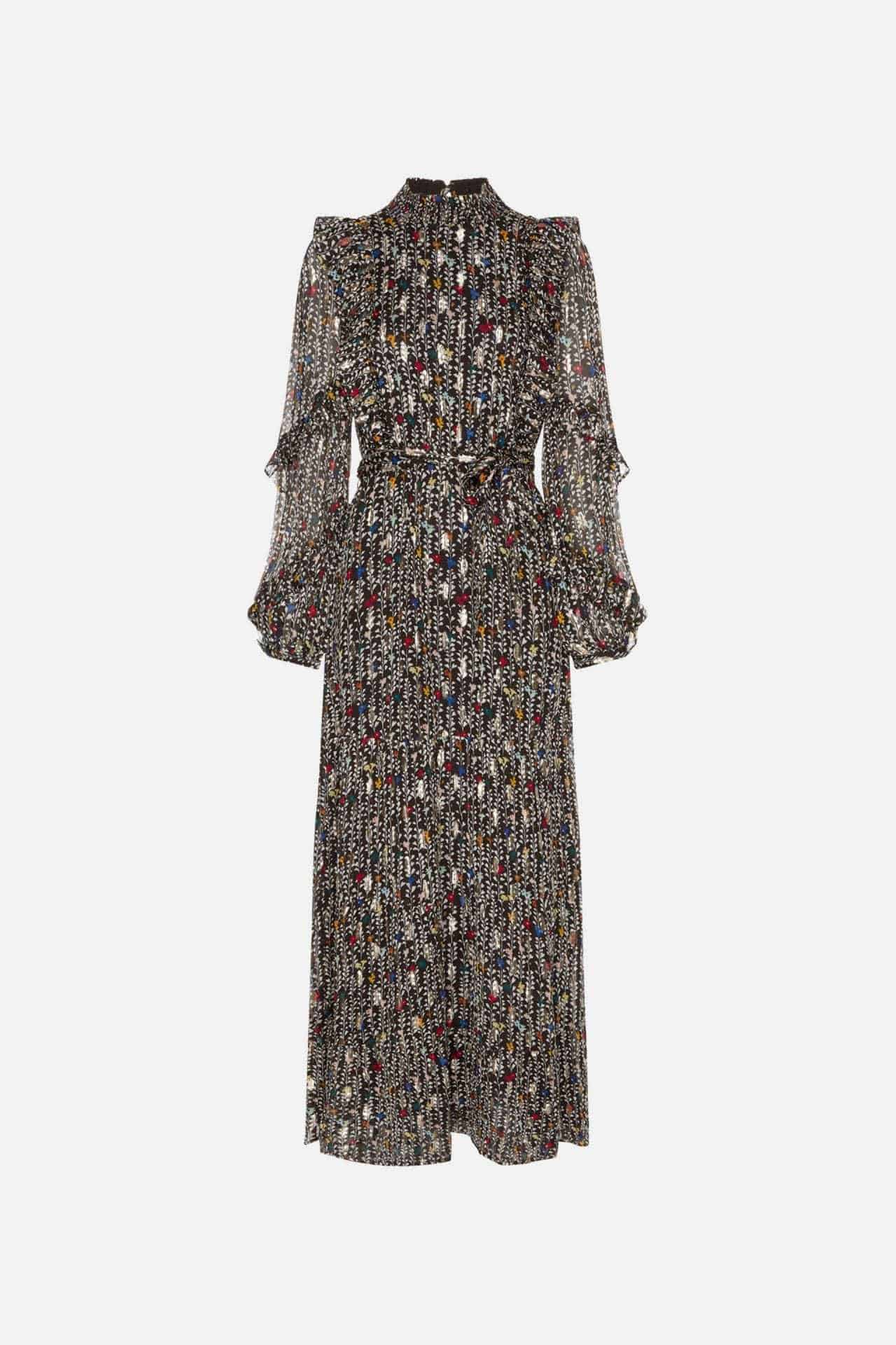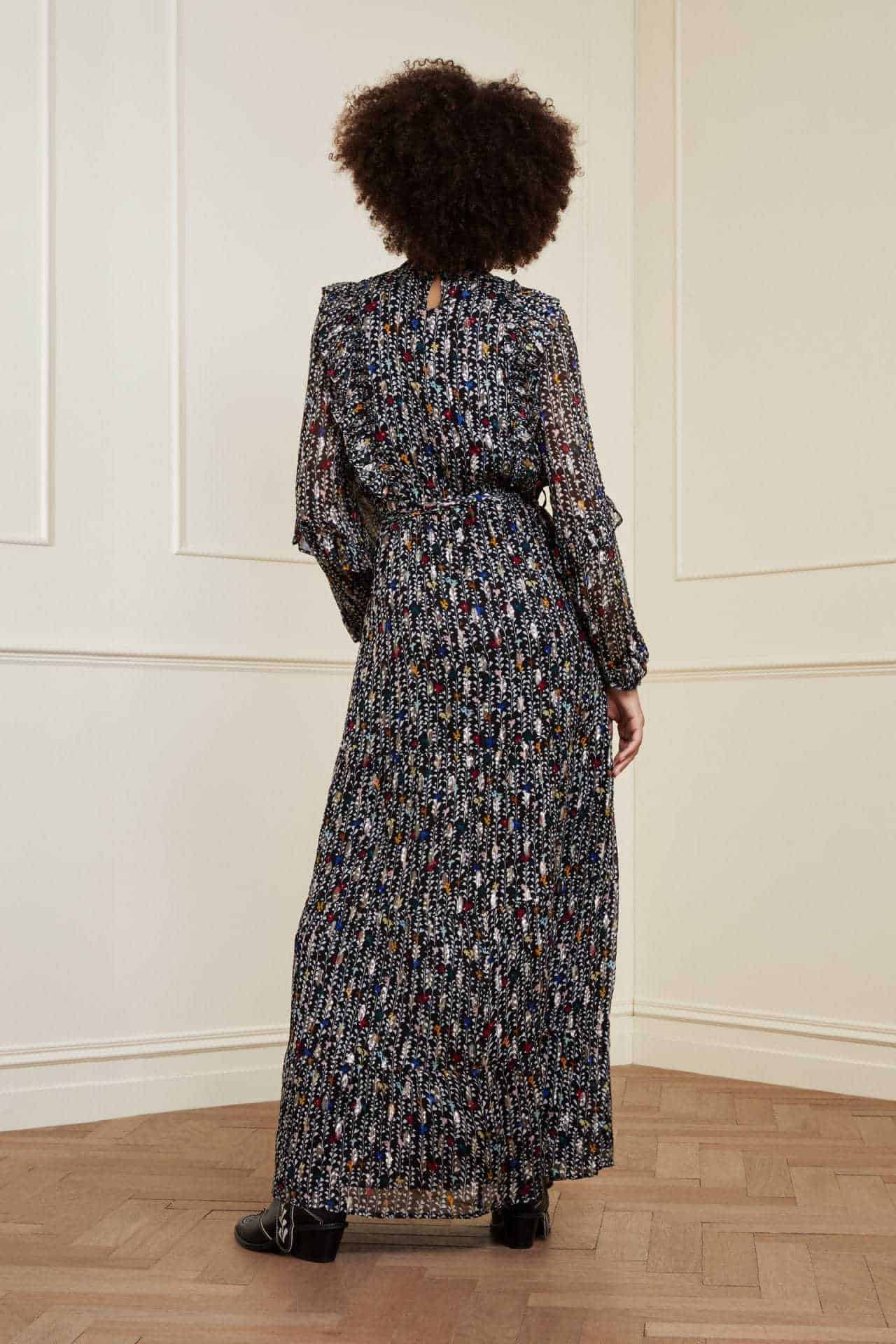 The Fabienne Chapot Leonie maxi dress is strings of love is a stunning dress with a smocked collar and ruffle details on the body of the dress and on the sleeves. The metallic thread running through the dress makes it the perfect dress for nights out or special occasions. The self fabric tie belt allows you to nip the waist in at your narrowest point for a more flattering look. Team it with boots and a leather jacket for the ultimate stylish outfit.