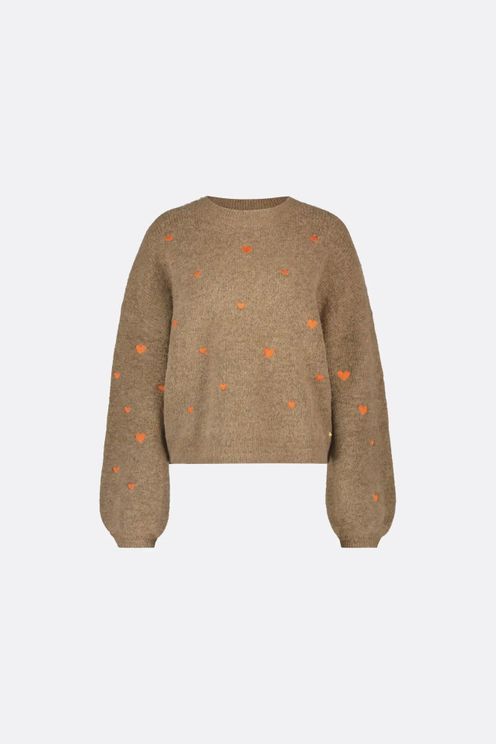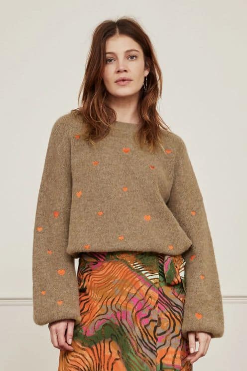 The Fabienne Chapot Lidia Pullover in Brunette is a gorgeous fine-knit sweater in a deep camel shade with all-over embroidered bright orange hearts. Featuring a ribbed round neck & cuffs with balloon sleeves. Style with your favourite Cocaranti jeans for the ultimate look.