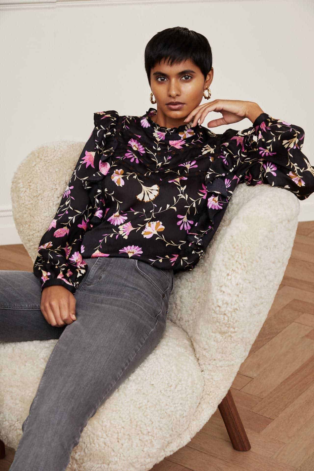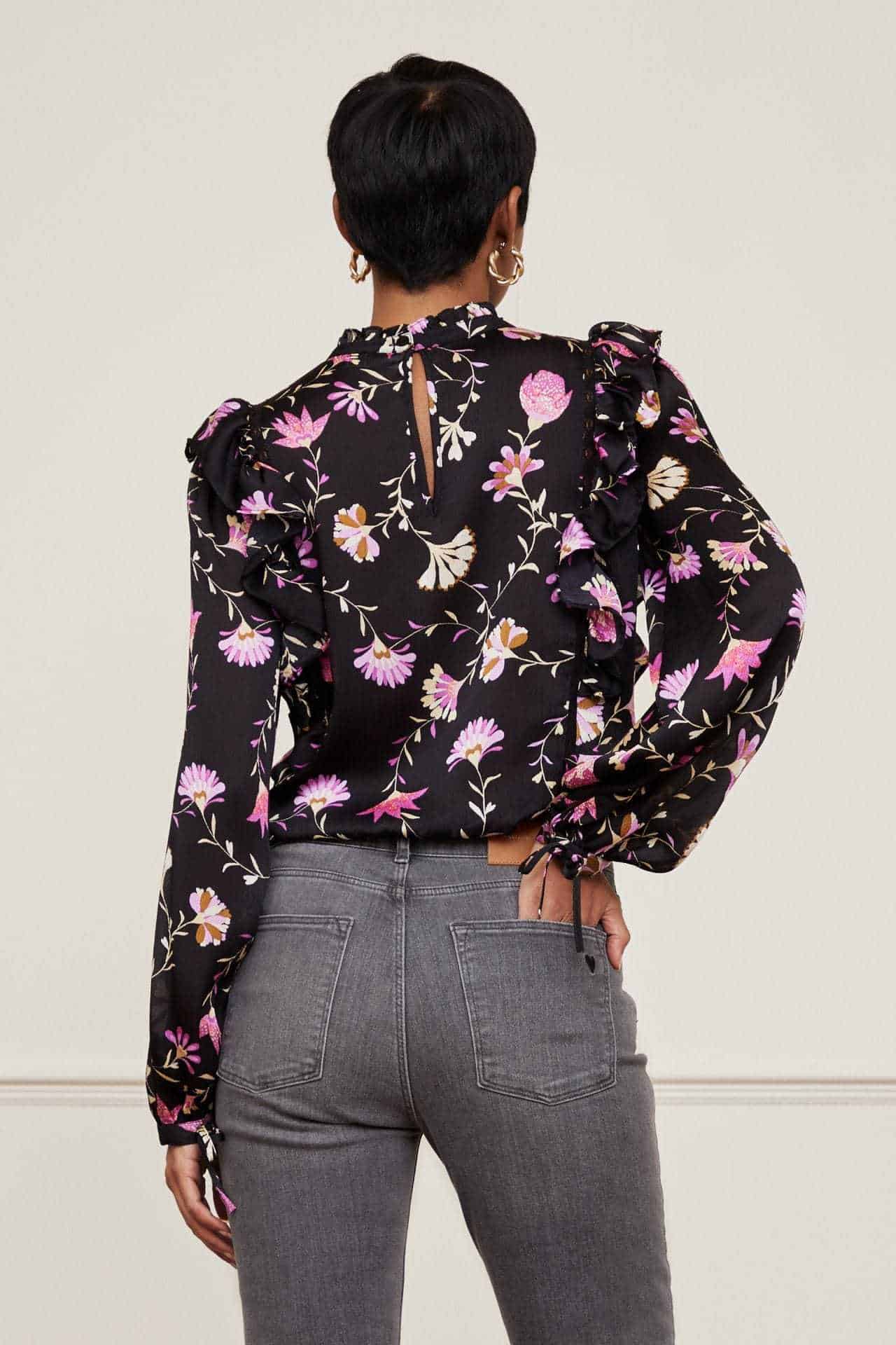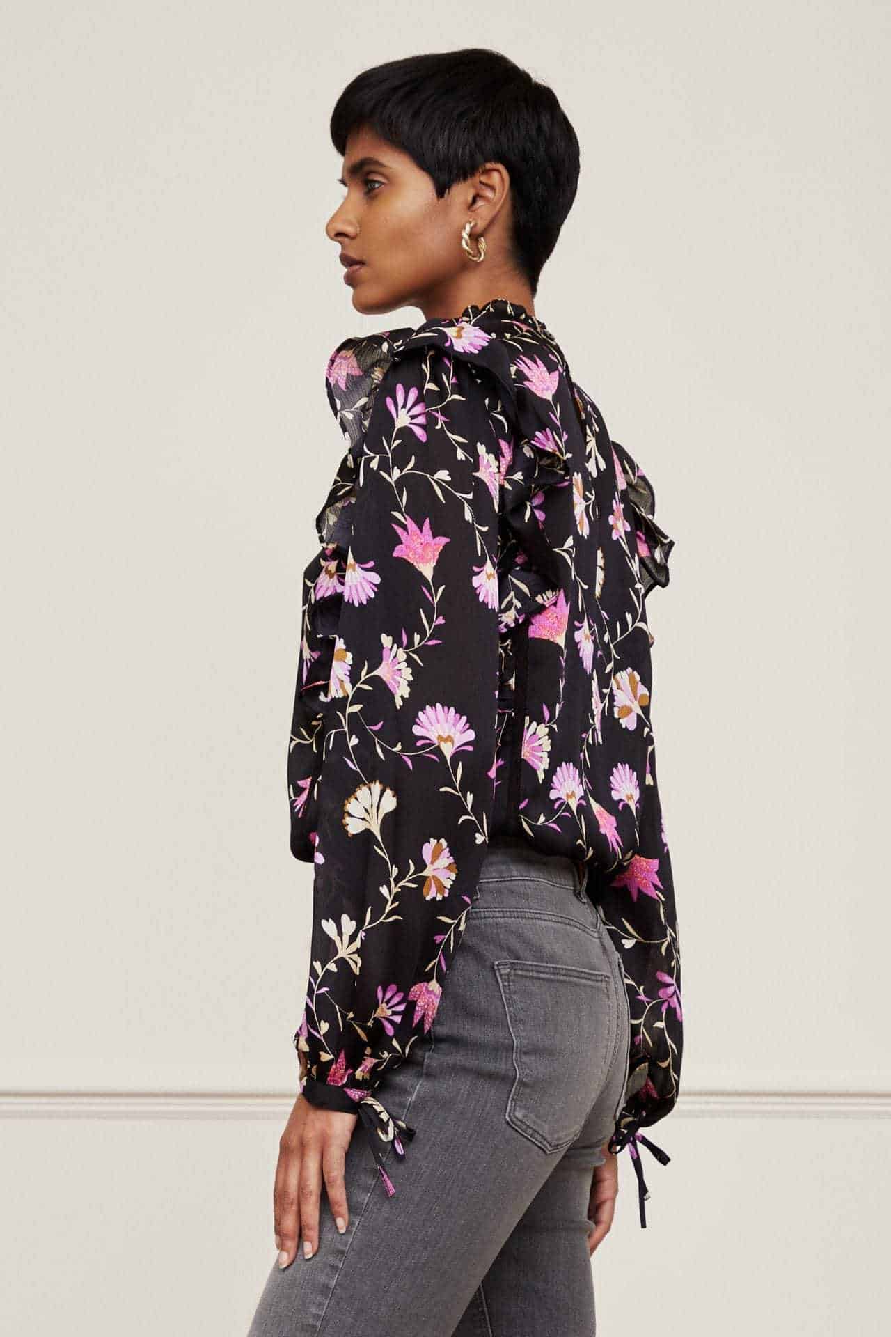 The Fabienne Chapot Pomme top in black tulip is a beautiful long sleeve top that features openwork details and a tulip design all-over. The top is sustainably made from 100% recycled polyester and has feminine ruffles on the shoulders and a bow detail on the cuffs. Style this with the Good American coated classic jeans for a stylish evening look.