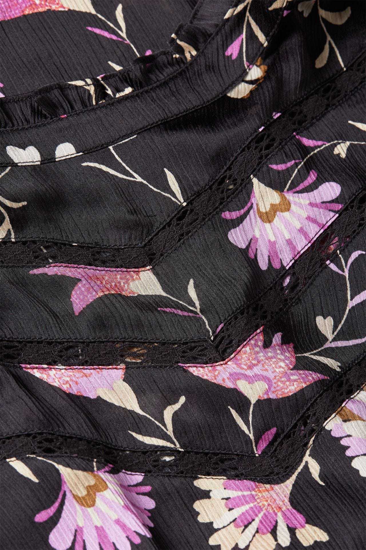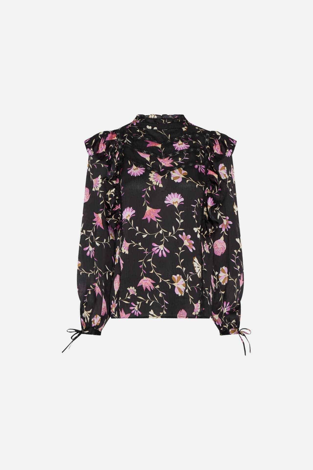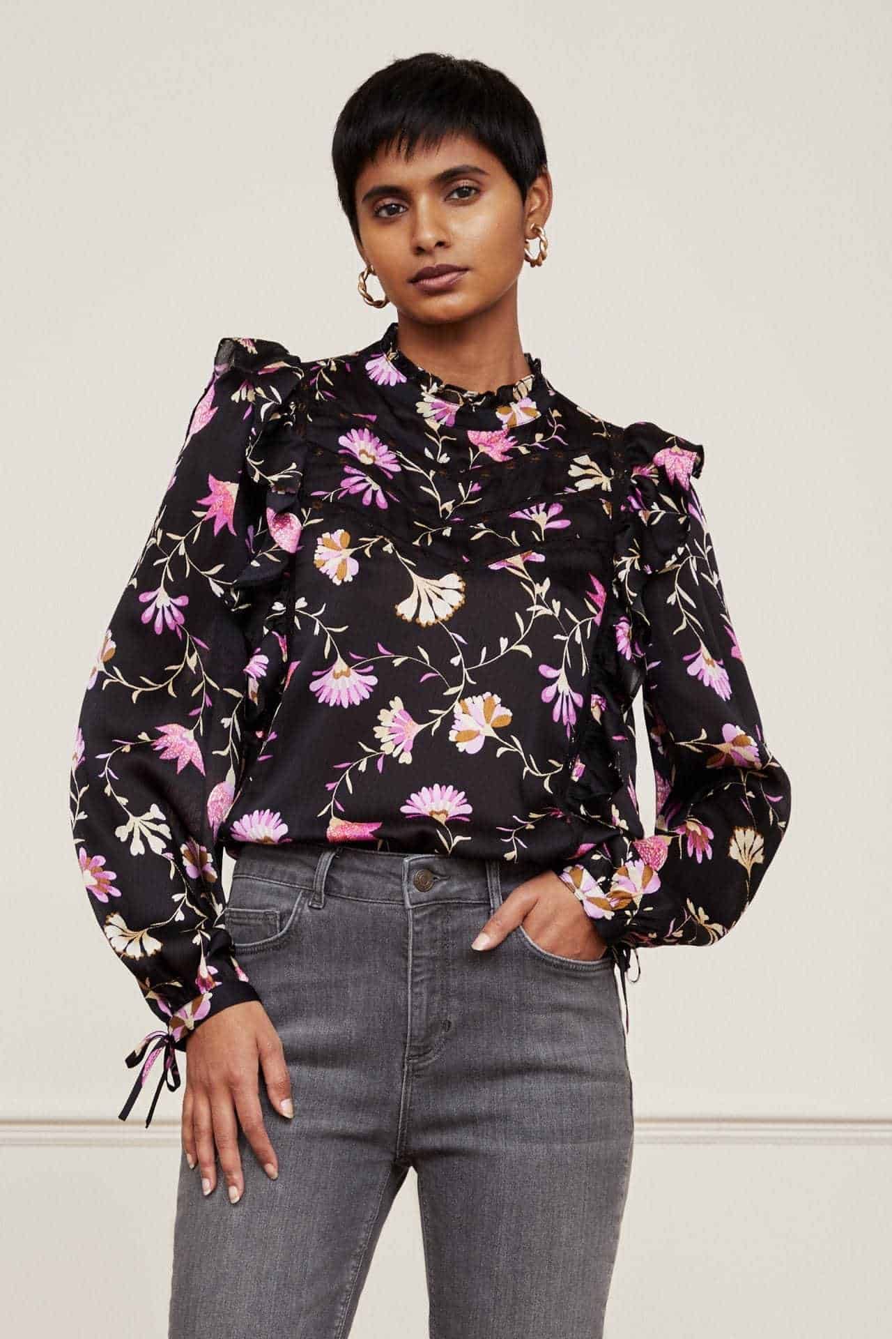The Fabienne Chapot Pomme top in black tulip is a beautiful long sleeve top that features openwork details and a tulip design all-over. The top is sustainably made from 100% recycled polyester and has feminine ruffles on the shoulders and a bow detail on the cuffs. Style this with the Good American coated classic jeans for a stylish evening look.