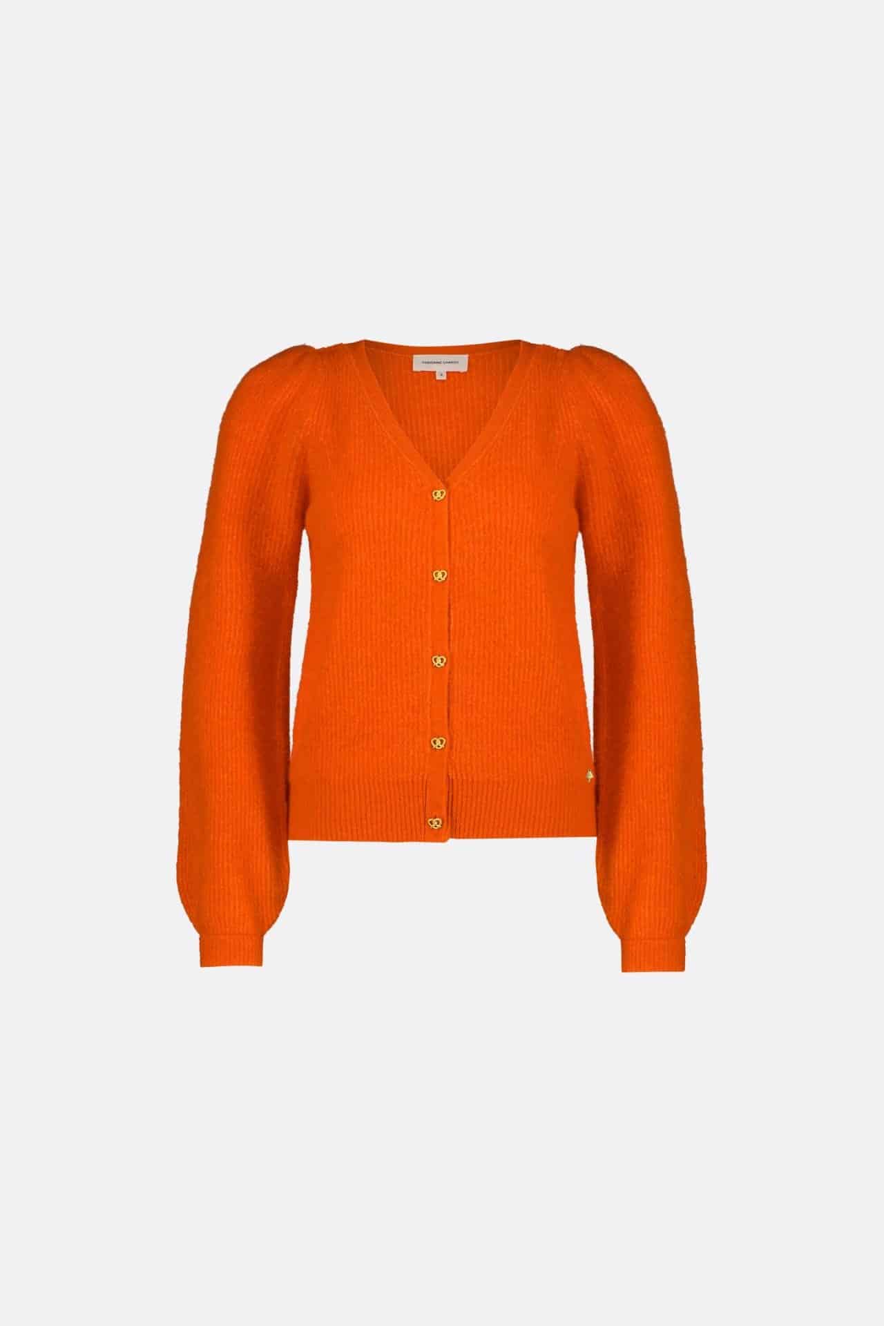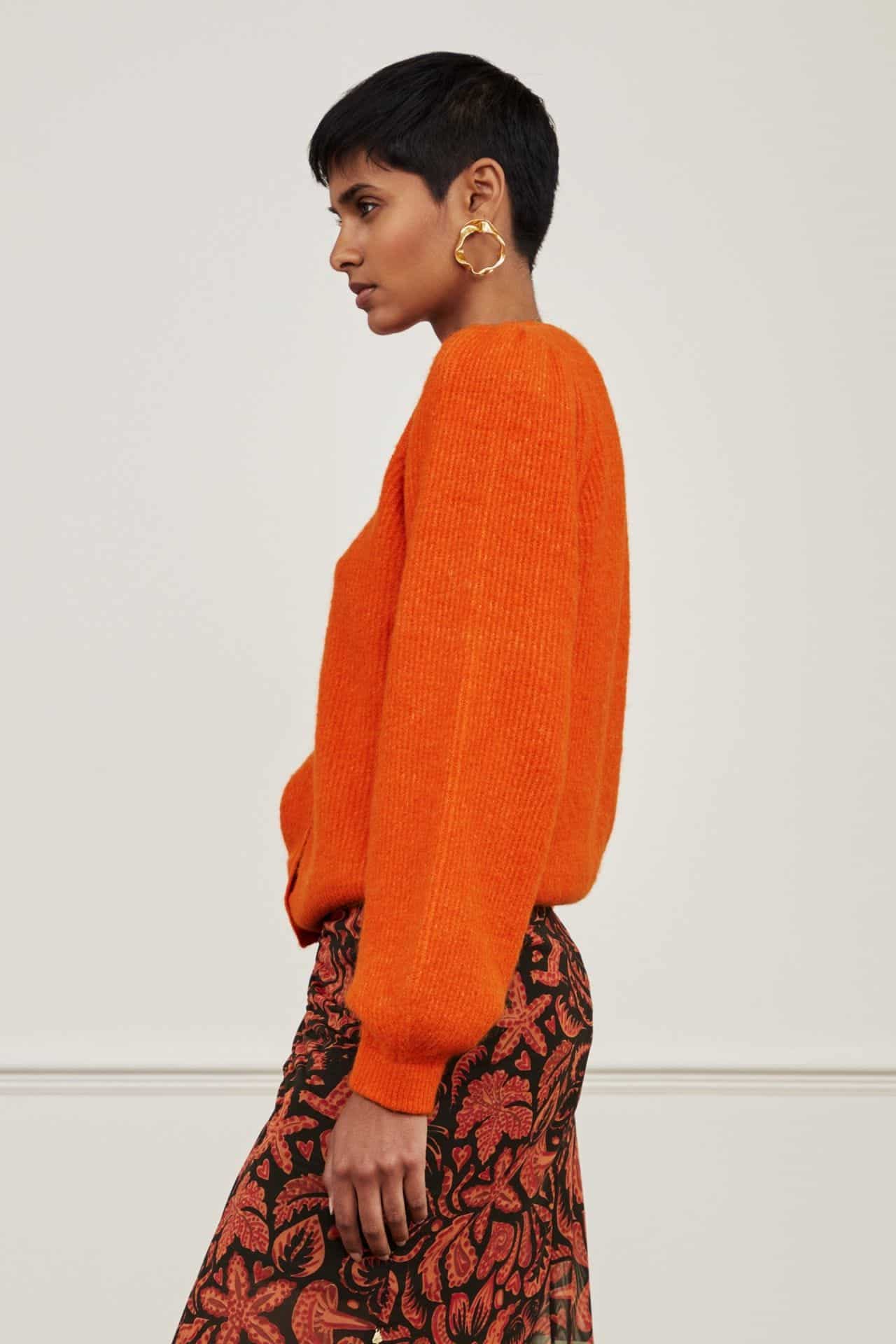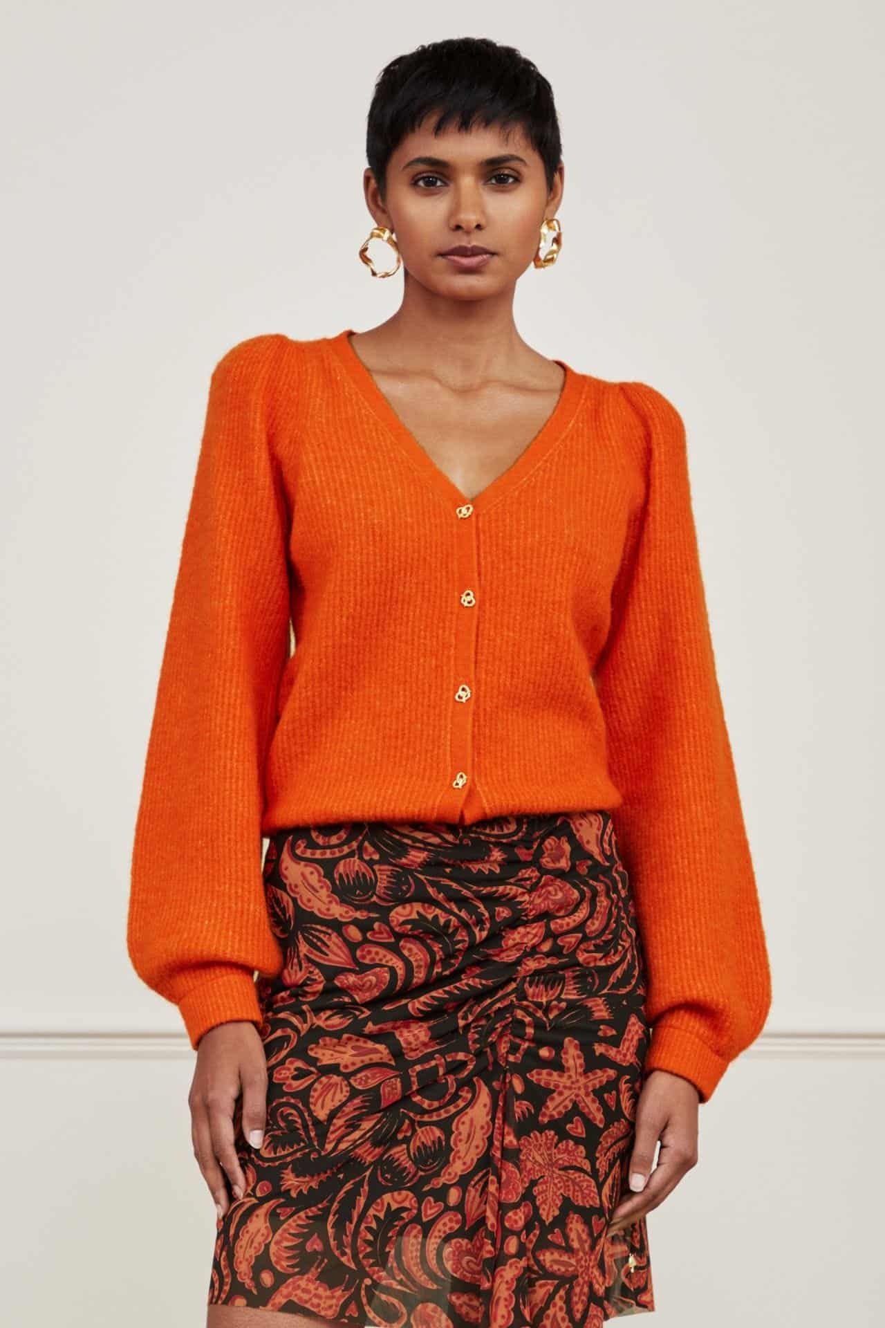 The Fabienne Chapot Sally Cardigan in orange lava I a super soft cardigan with feminine silhouette. Featuring a V-neckline, gold-tone signature buttons and long sleeves. The Sally Cardigan has shoulder pads and is made from a mix of wool and alpaca wool for a sophisticated yet cosy look.