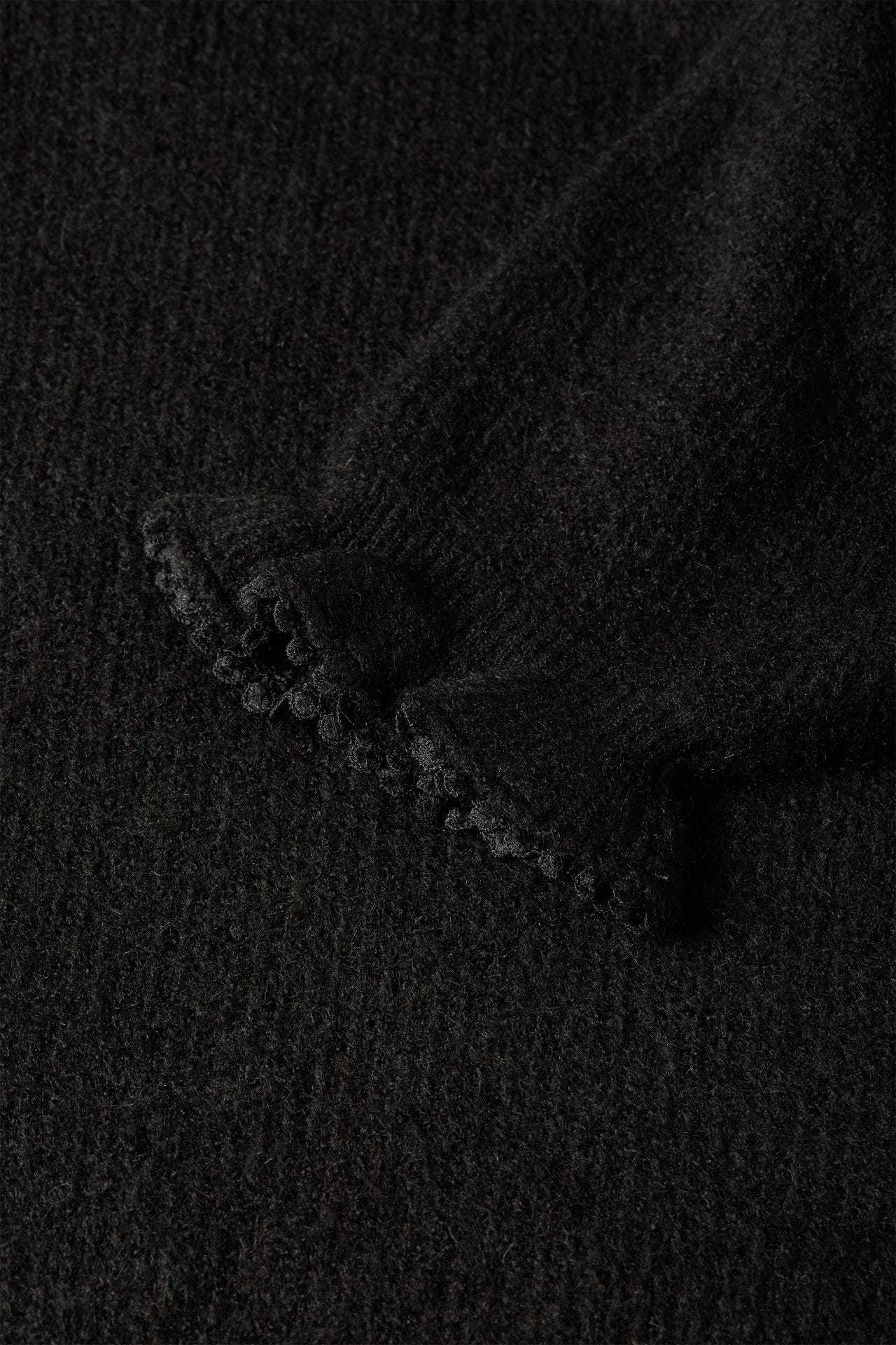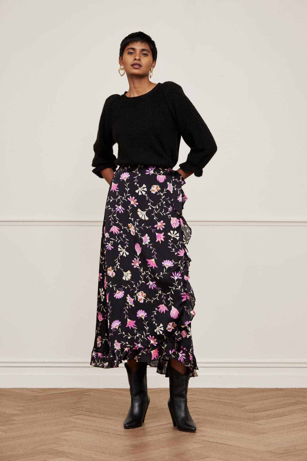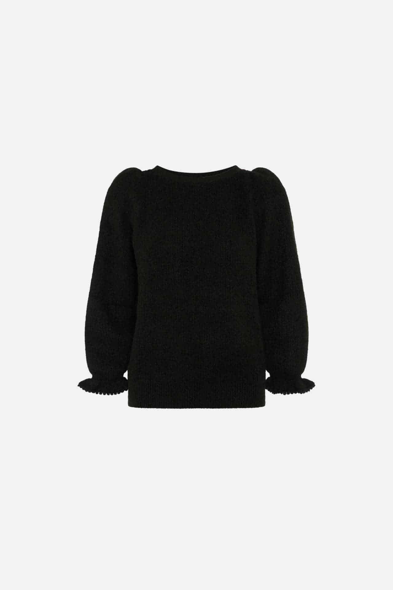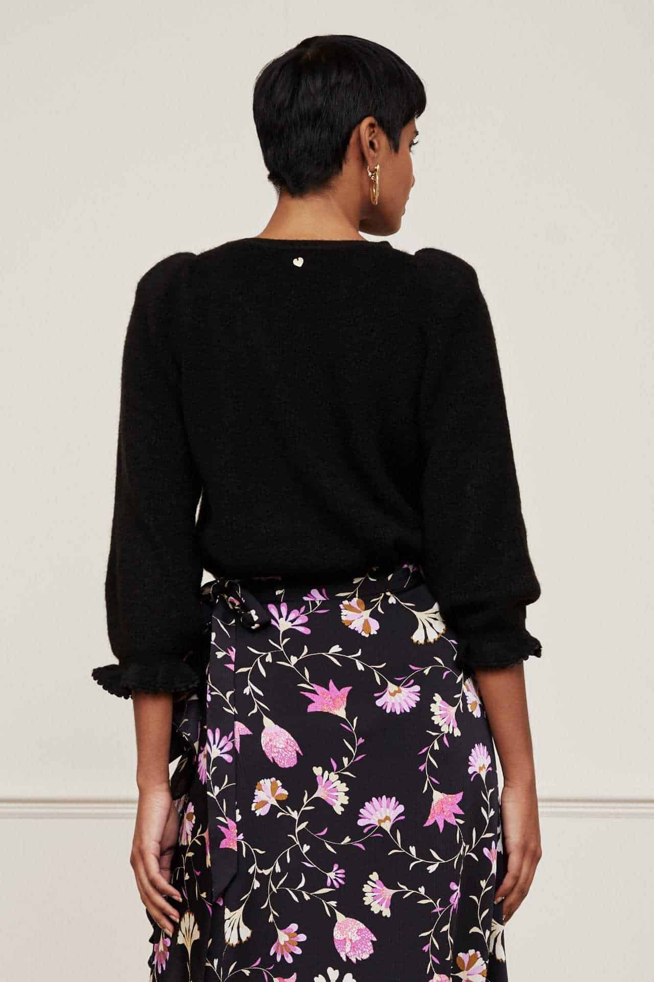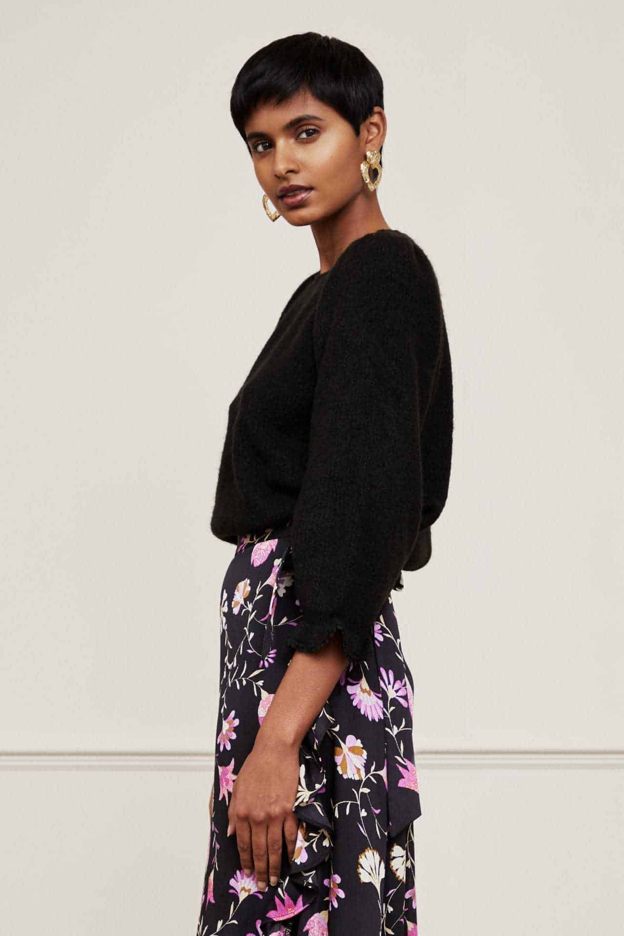 The Fabienne Chapot Sally frill pullover in black is a gorgeous classic round neck jumper in a wool blend mix that has puff sleeves and light shoulder pads. The jumper has frilly cuffs with pompom detailing which add a bit of interest to a timeless style.