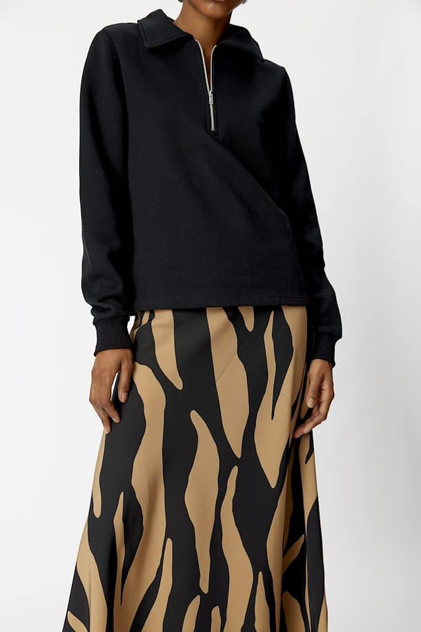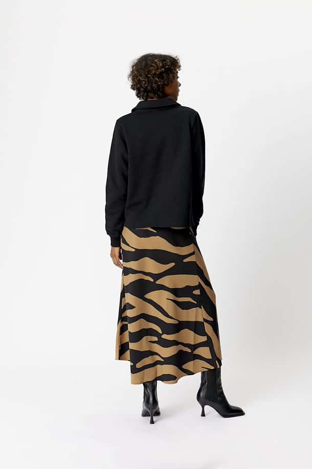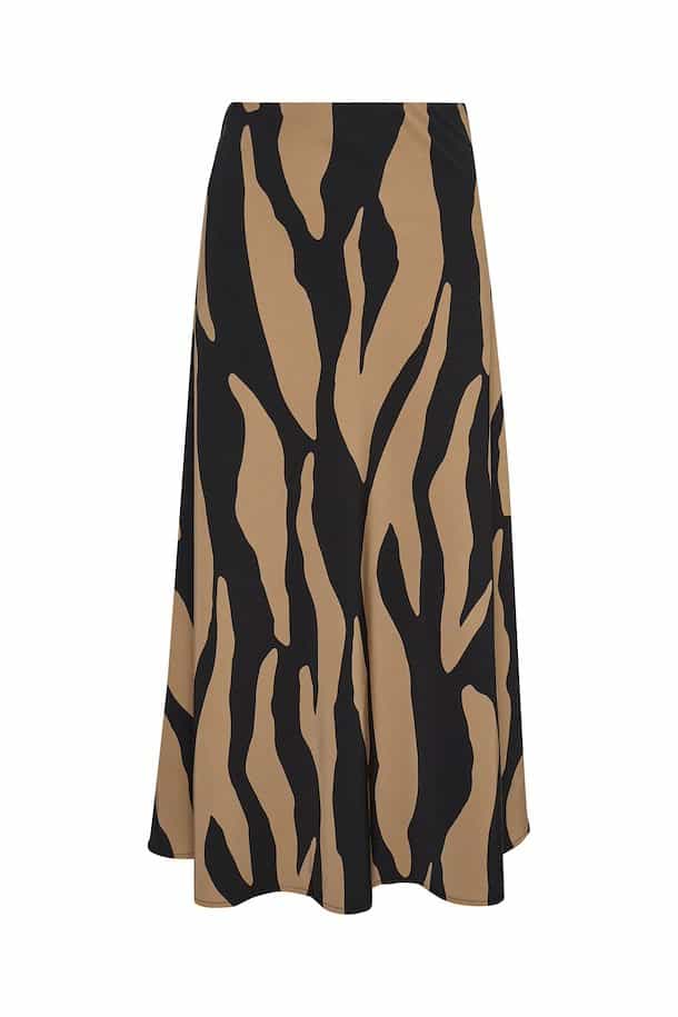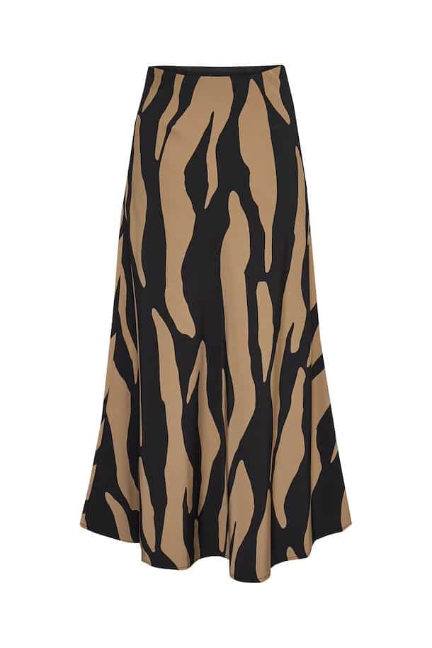The Gestuz BothildeGZ high waist skirt in maxi zebra tiger's eye is a gorgeous A-line skirt in black and a caramel colour. Perfect for transitioning from winter to spring and summer, this skirt made from recycled polyester is great styled with chunky knitwear and boots.