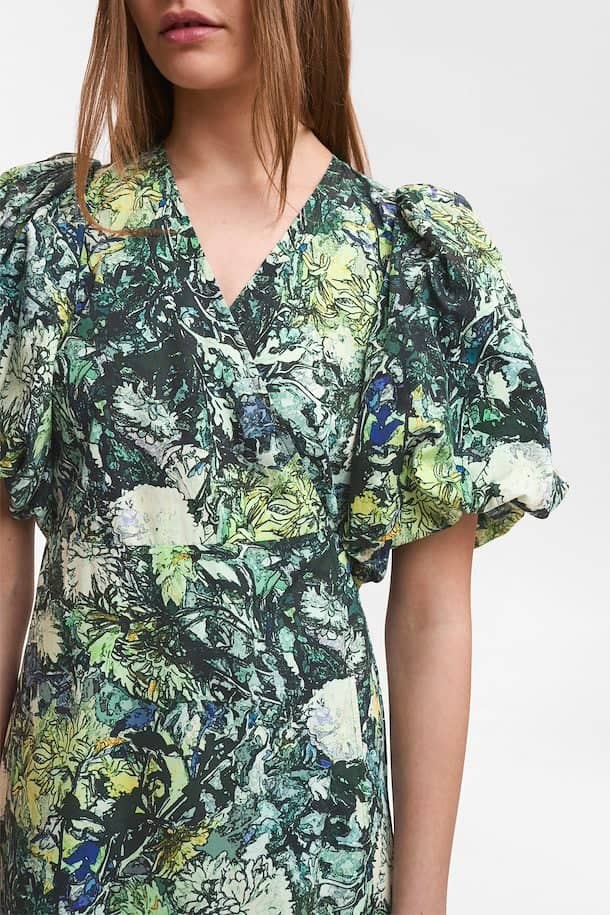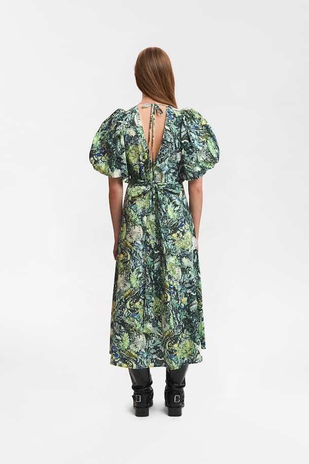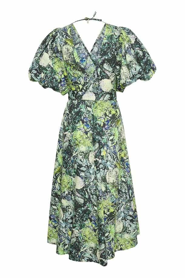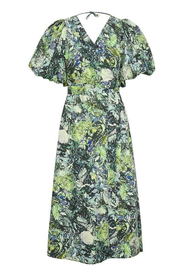 The Gestuz CaraGZ Dress lime flower is a long wrap dress in a creative cut and floral-inspired graphic print. With voluminous puff sleeves, tie-around belt at the natural waist, front v-neck, deep v-neck back, and back tie closure. Style with boots for a casual outfit or dress it up with strappy heels.