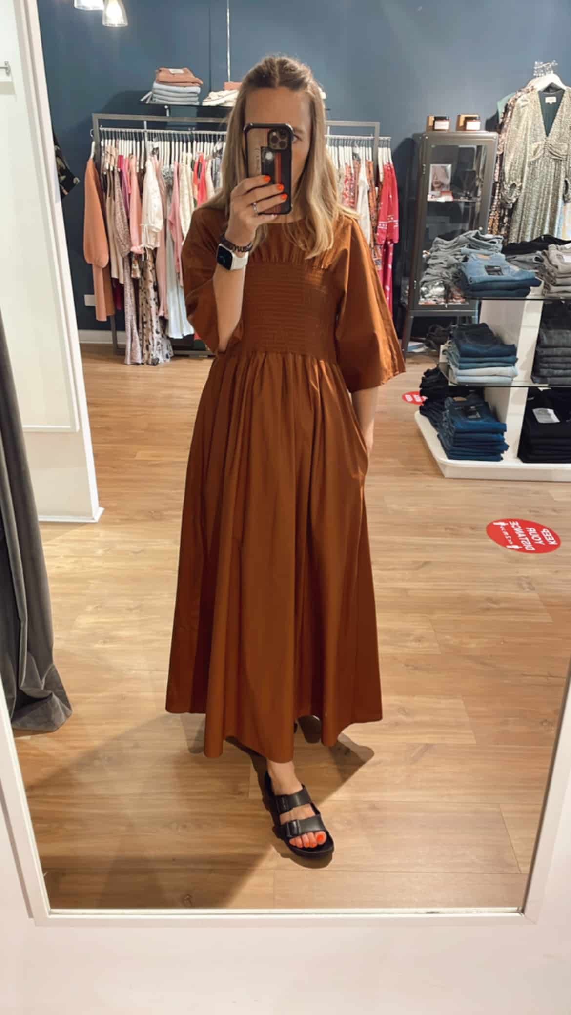 The Gestuz KalottaGZ dress in mocha bisque is a cotton poplin short sleeve dress with a smocking at the front and back of the chest. The dress has a relaxed fit accept for the chest area which is fitted. An easy to wear style that is great for day to day wear throughout summer.