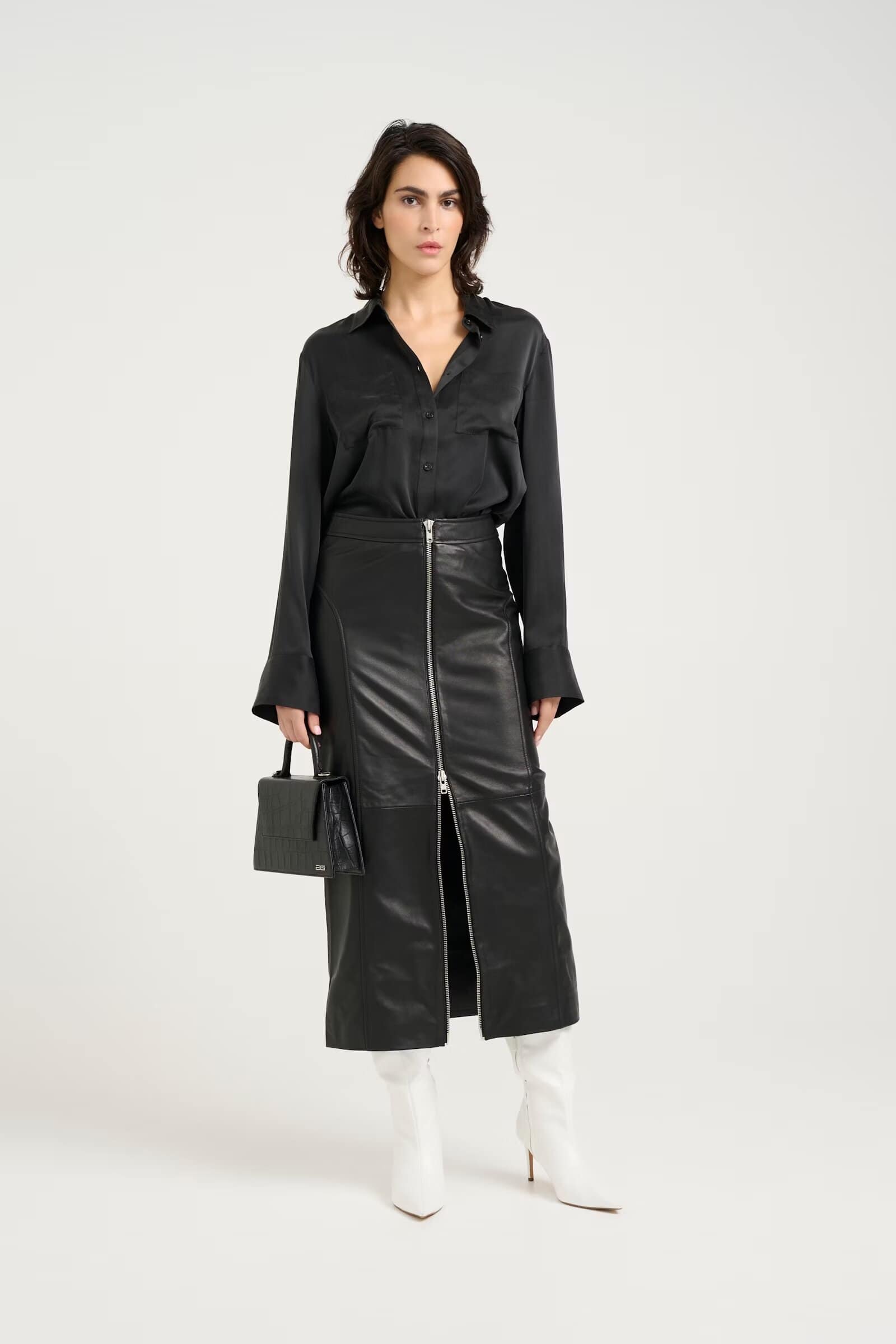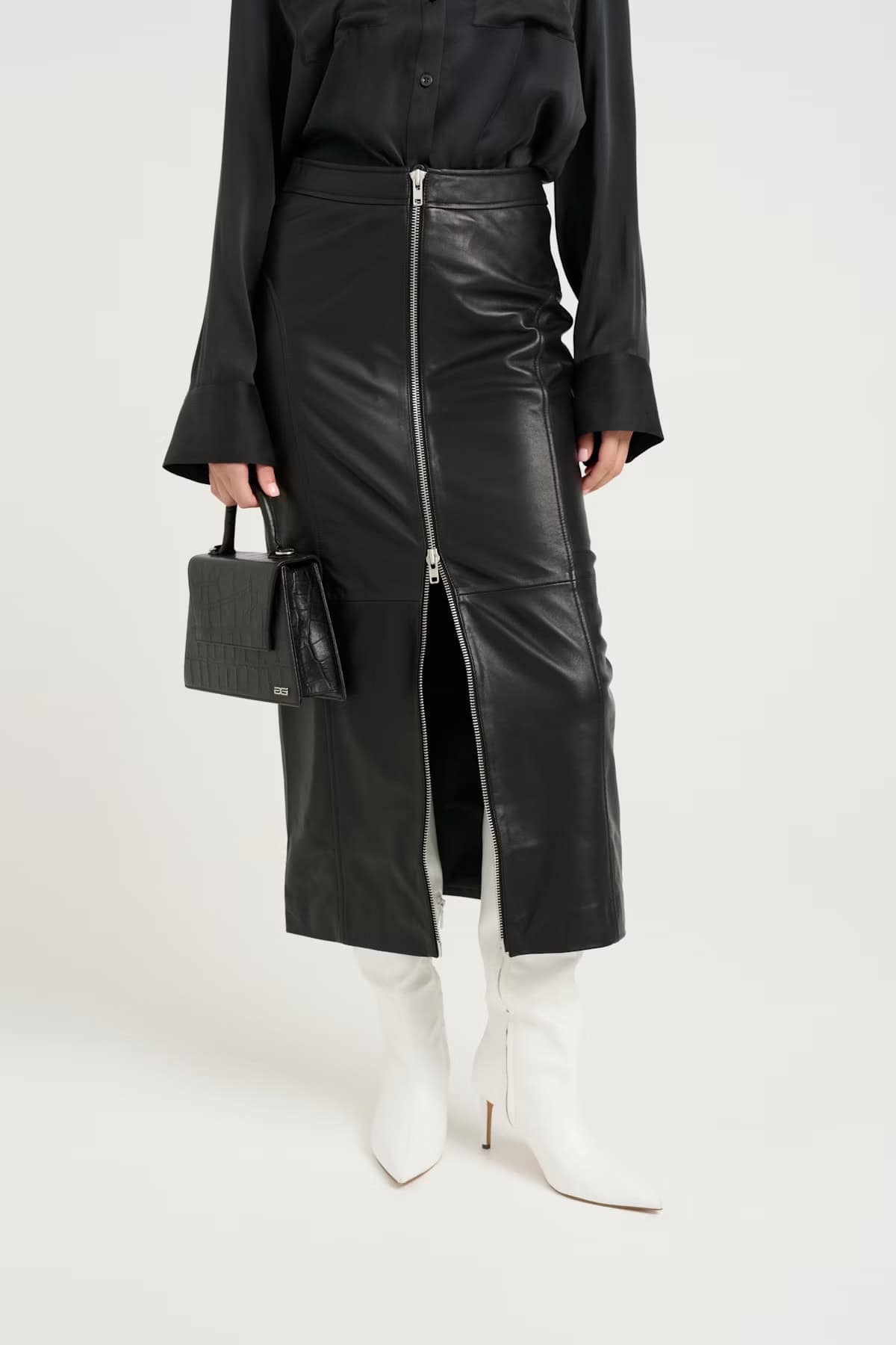 The Gestuz KhalieGZ leather skirt in black is a stunning mid length skirt made from 100% buttery lambs leather. With a double ended zip fastening down the centre front and seam detailing on the front and back, this skirt will see you through all of the seasons and beyond. A wardrobe staple that looks amazing on.