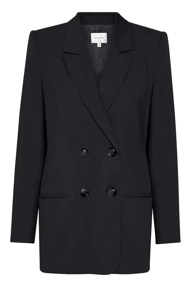 The Gestuz PaulaGZ blazer in black is a loose fitting double breasted blazer that finishes mid thigh length. It has a collared v neck and front pockets. This blazer is an essential for any wardrobe as it can seamlessly elevate any outfit whether thrown over a t-shirt with jeans or over a dress in the evening. Style with the coordinated PaulaGZ Mid waist trousers and a t-shirt and trainers for a stylish alternative day look.