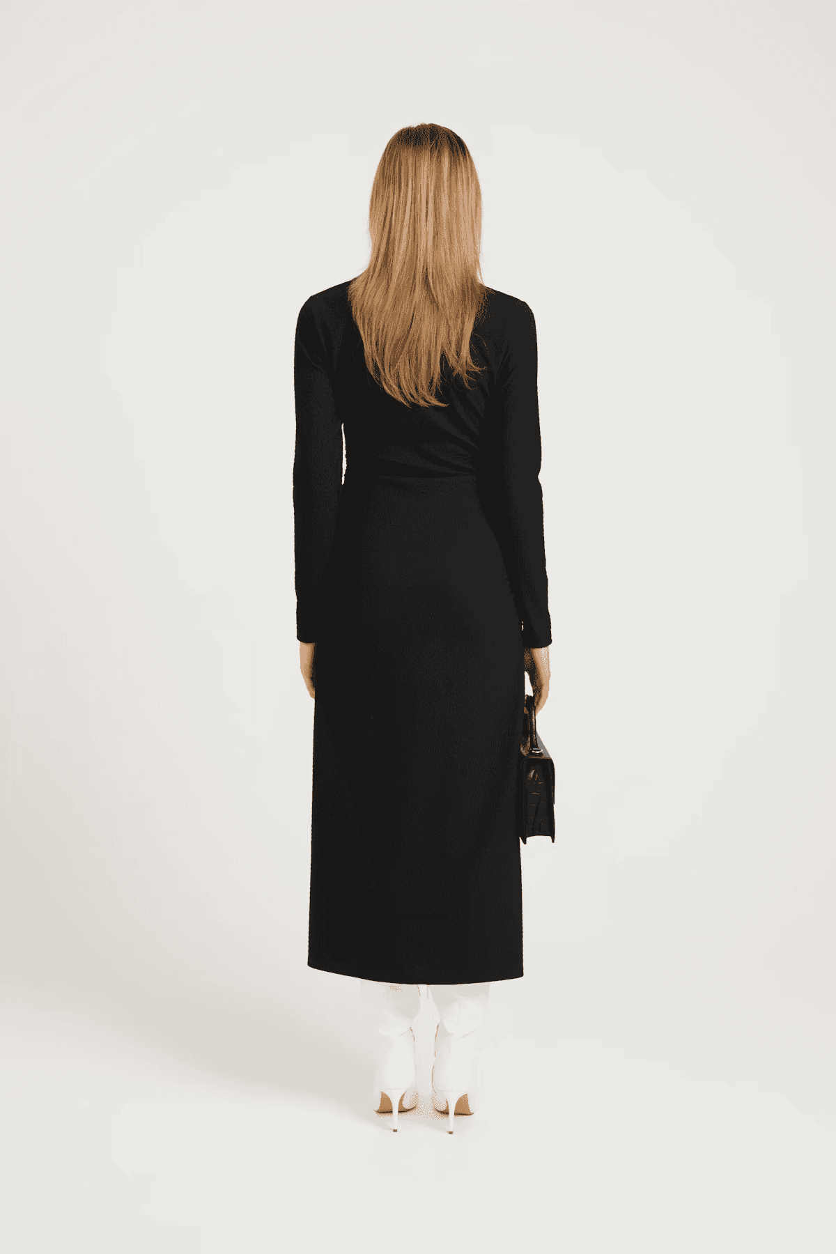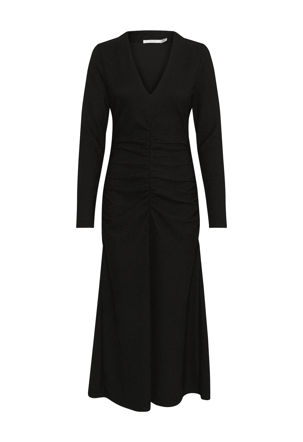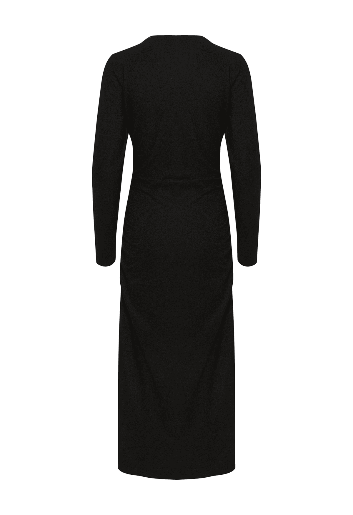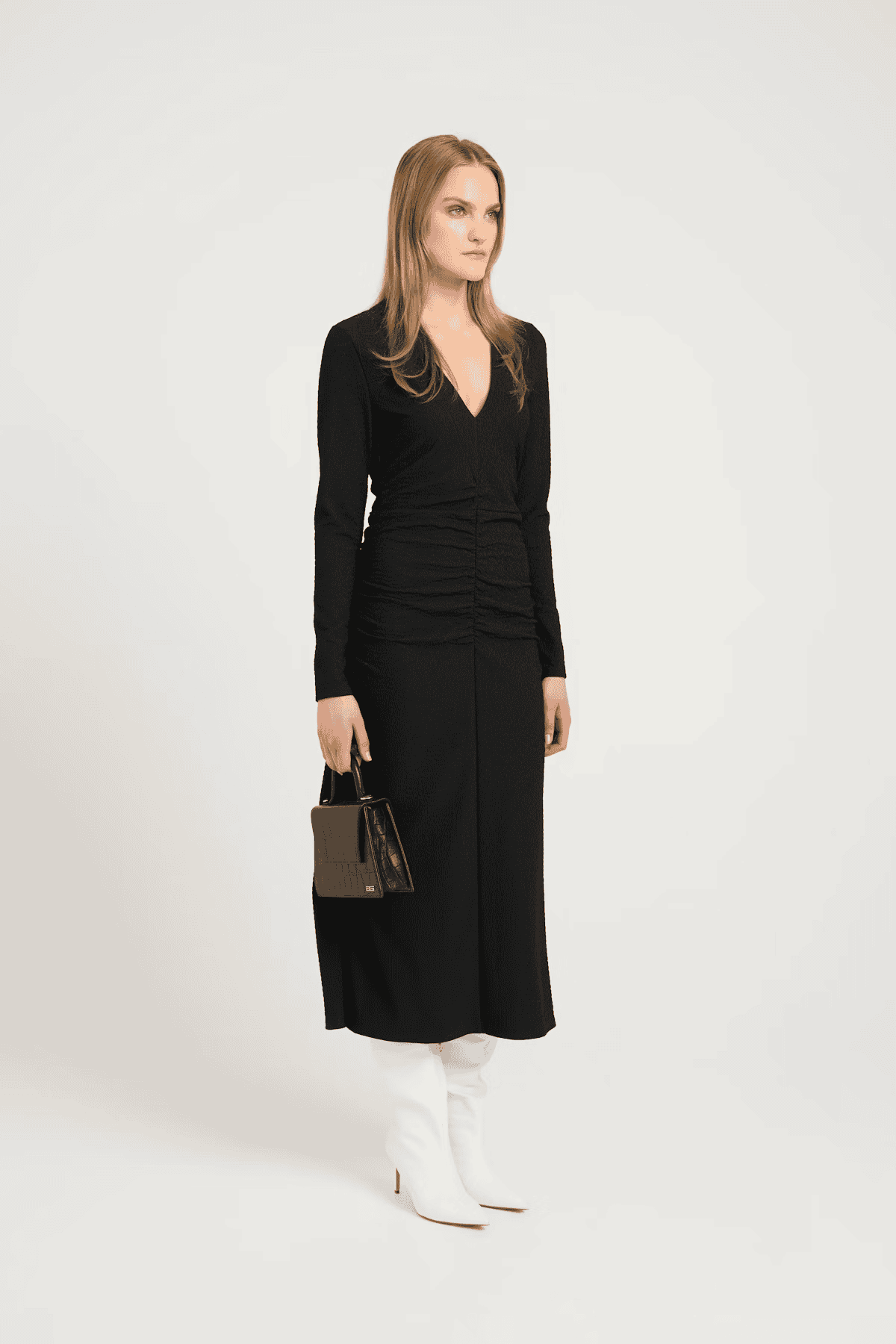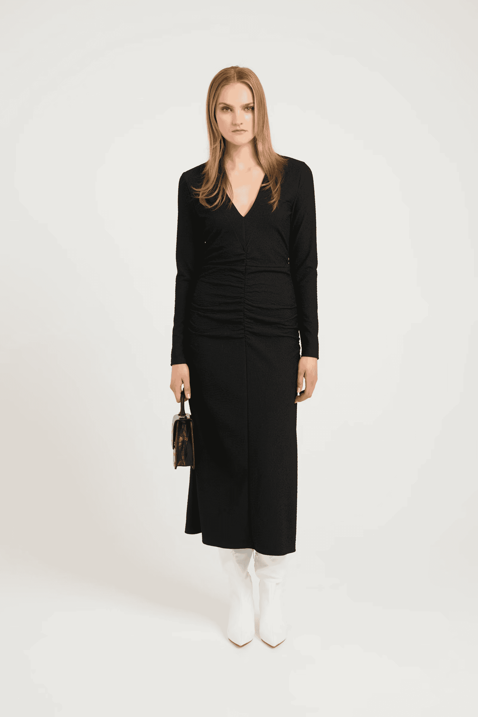 The Gestuz ShillaGZ dress in black is a simple yet stunning long, plain black dress with long sleeves, a v-neck and ruching down the front centre seam which creates a flattering fit when on. This dressed can be worn during the day with boots or ballet flats and then dressed up for special occasions with heels and jewellery.