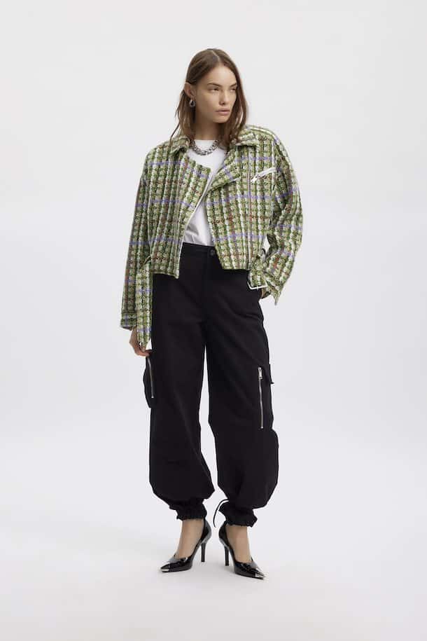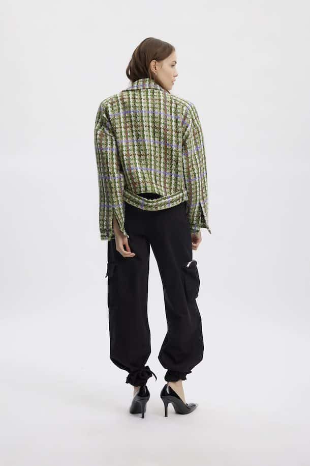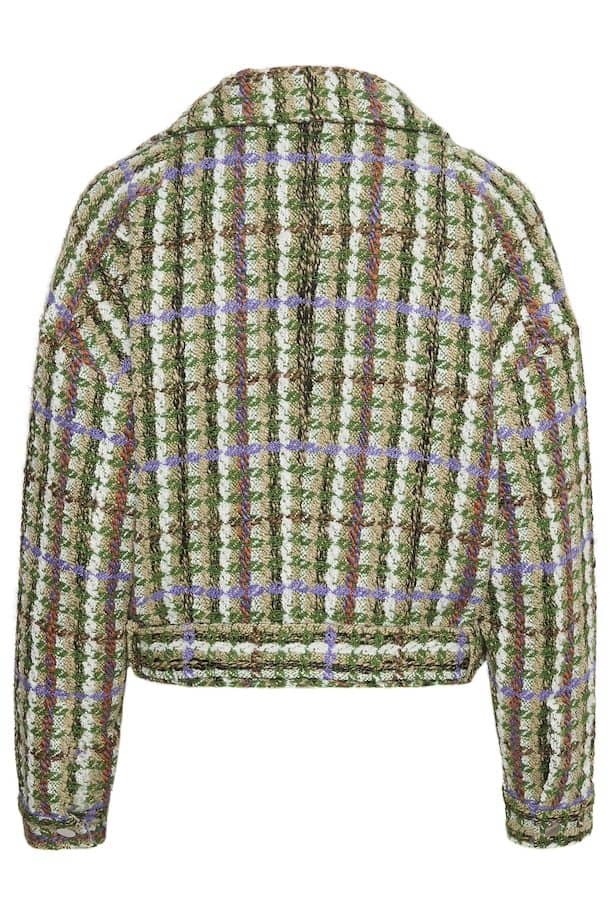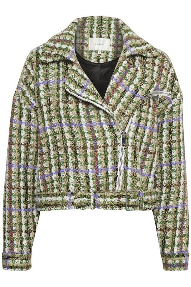 The Gestuz TashaGZ Short Jacket Multi Check Tweed is a stylish, multicoloured, textured tweed jacket with distinctive accents. With a spread collar, drop shoulders, side zipper closure, zippered side pocket, and belted hem in a loose, short design. The large zipper hardware complements the thick knit. For a relaxed, carefree look, wear the zipper halfway down.