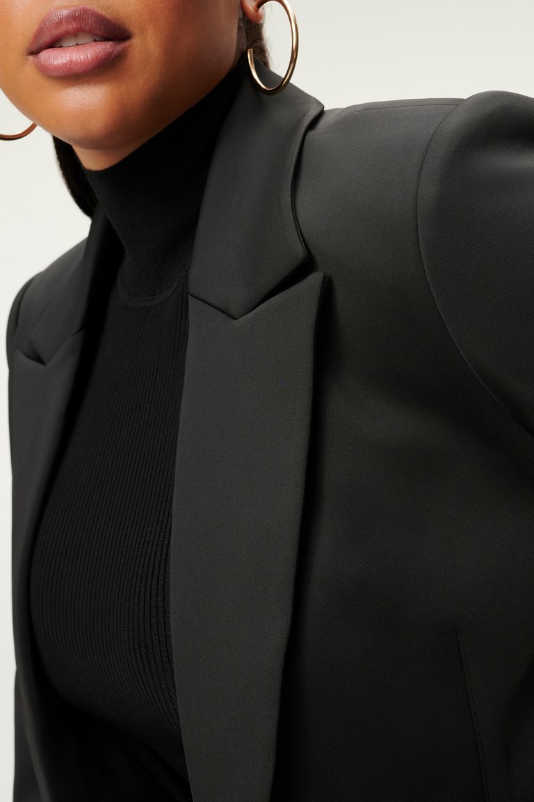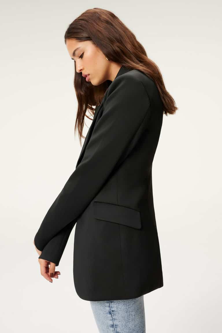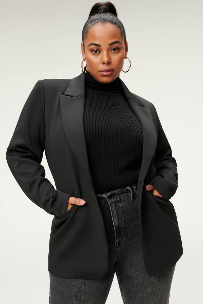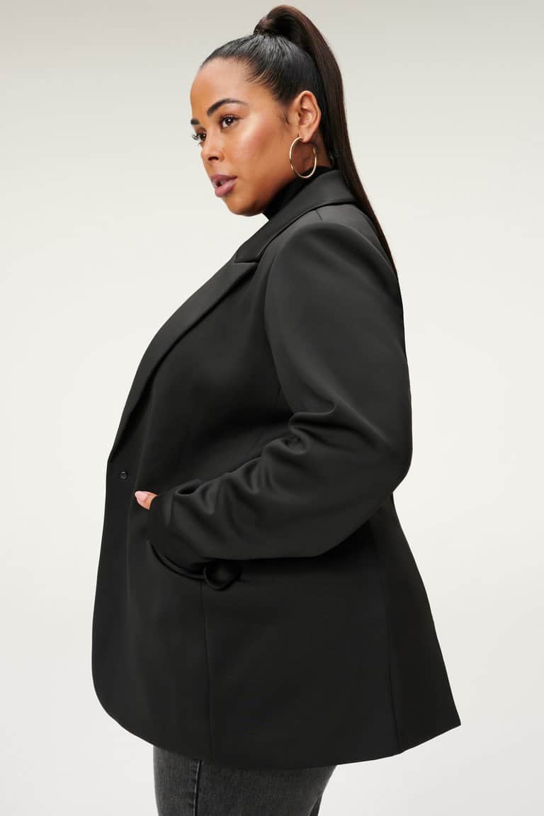 The Good American Fitted Scuba blazer in black is a gorgeous blazer in scuba material making it super comfortable. The jacket has a one button fastening at the front of the waist, collared v neck and two pockets at the front. Look sophisticated with ease, just style with denim and heels for the perfect evening look or swap to boots for an stylish but effortless day look.
