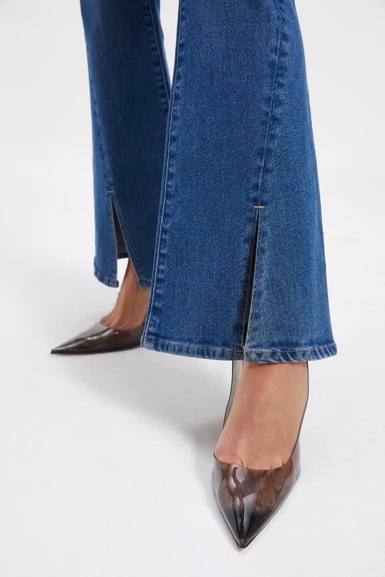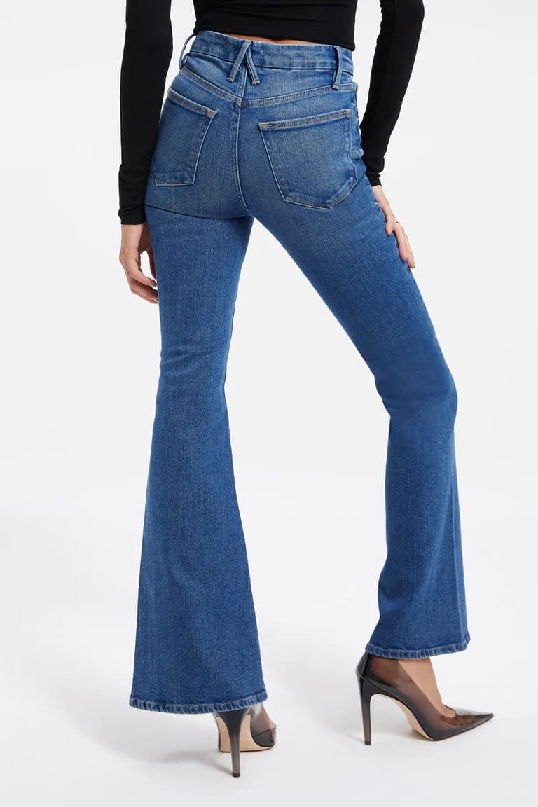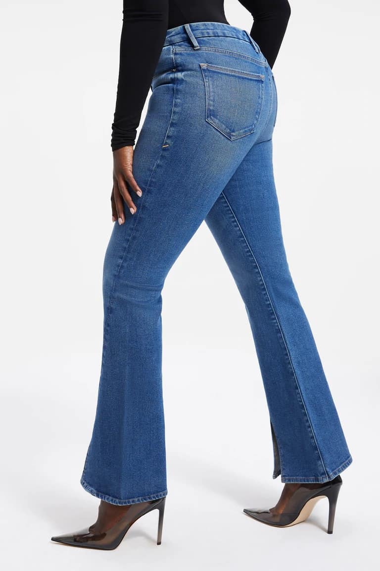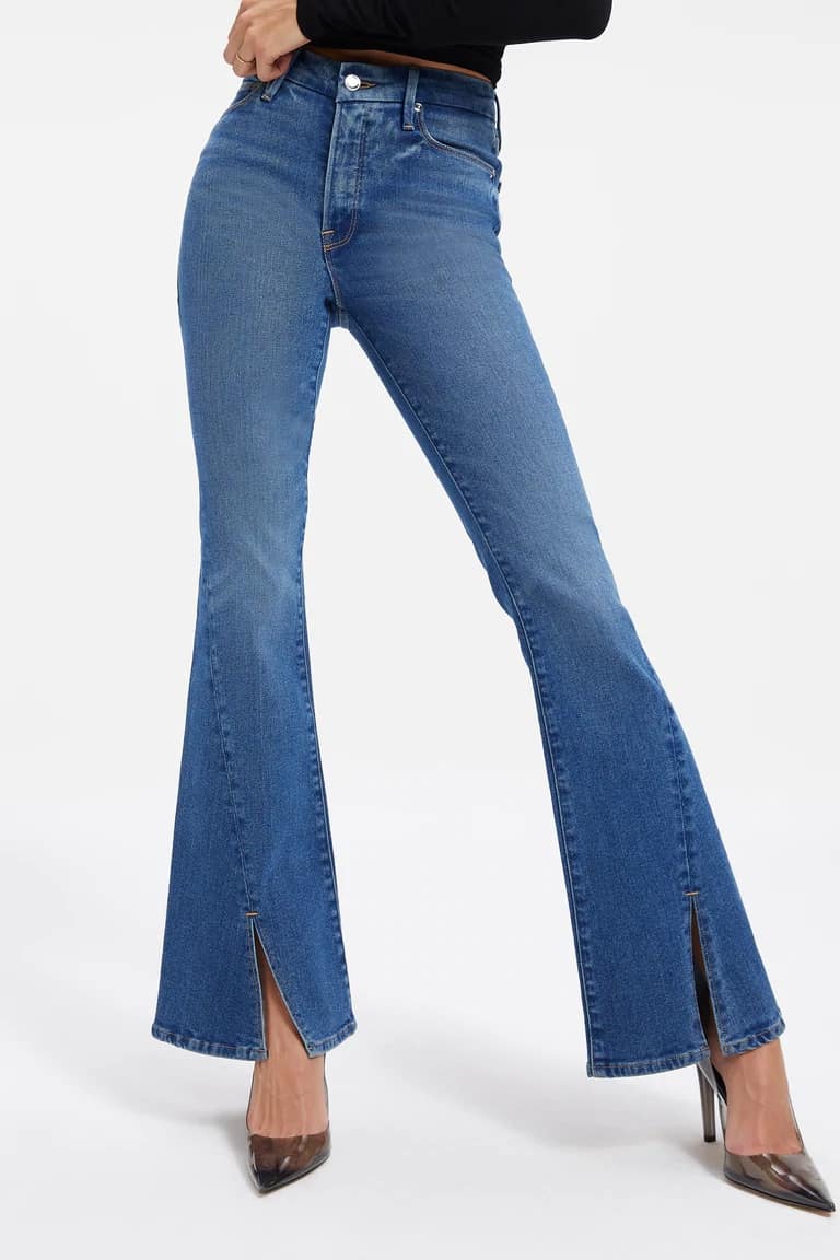 The Good American Good Legs flare twisted slit in indigo029 is a vintage inspired jean with a modern slit update at the centre front hem. The jeans have advanced stretch recovery and a gap proof waistband ensuring the perfect fit and that they maintain their shape wear after wear. They are a super flattering style perfect for wearing with heels for nights out.