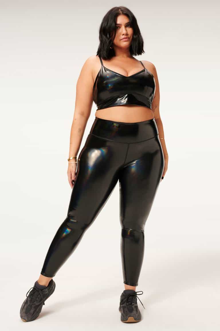 The Good American Hologram 7/8 leggings in black are made of a rainbow hologram glossy coated stretch fabric to ensure the perfect fit. For a paired back look, throw on with a chunky jumper or for a attention grabbing outfit then style with the matching hologram bra and the scuba blazer for the perfect evening outfit for the party season.