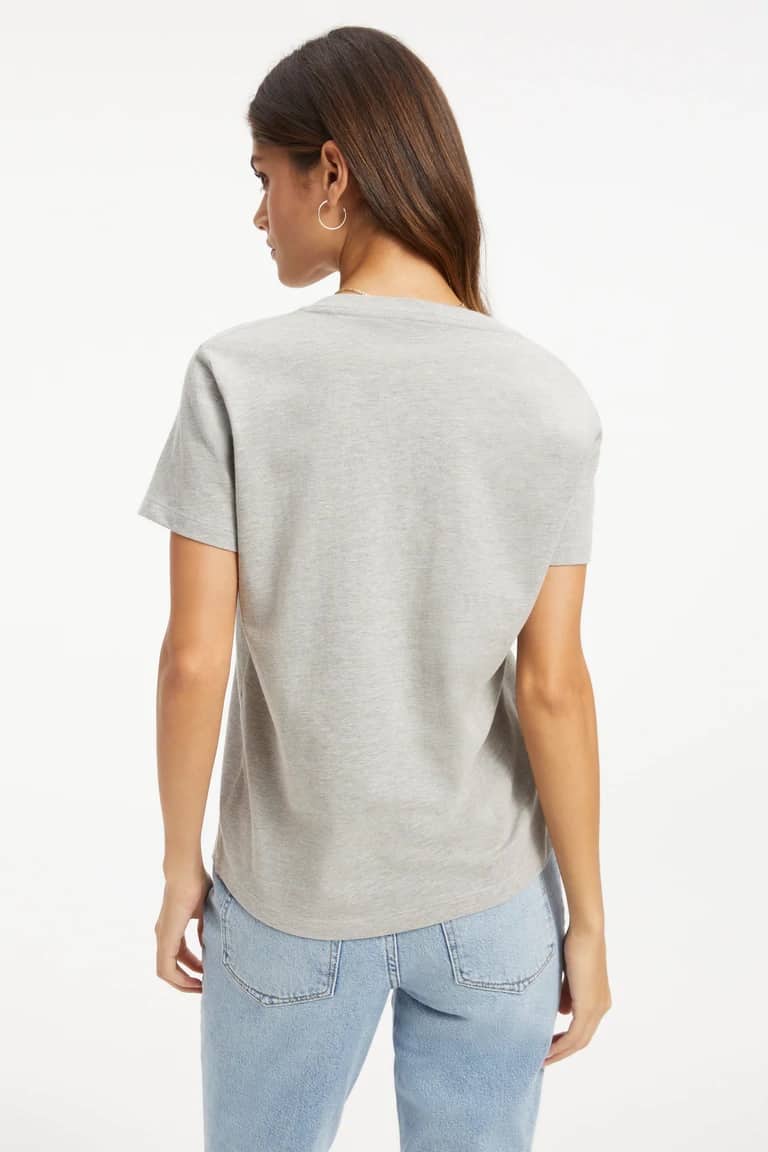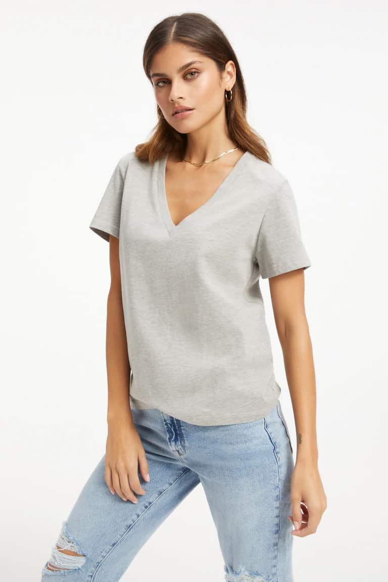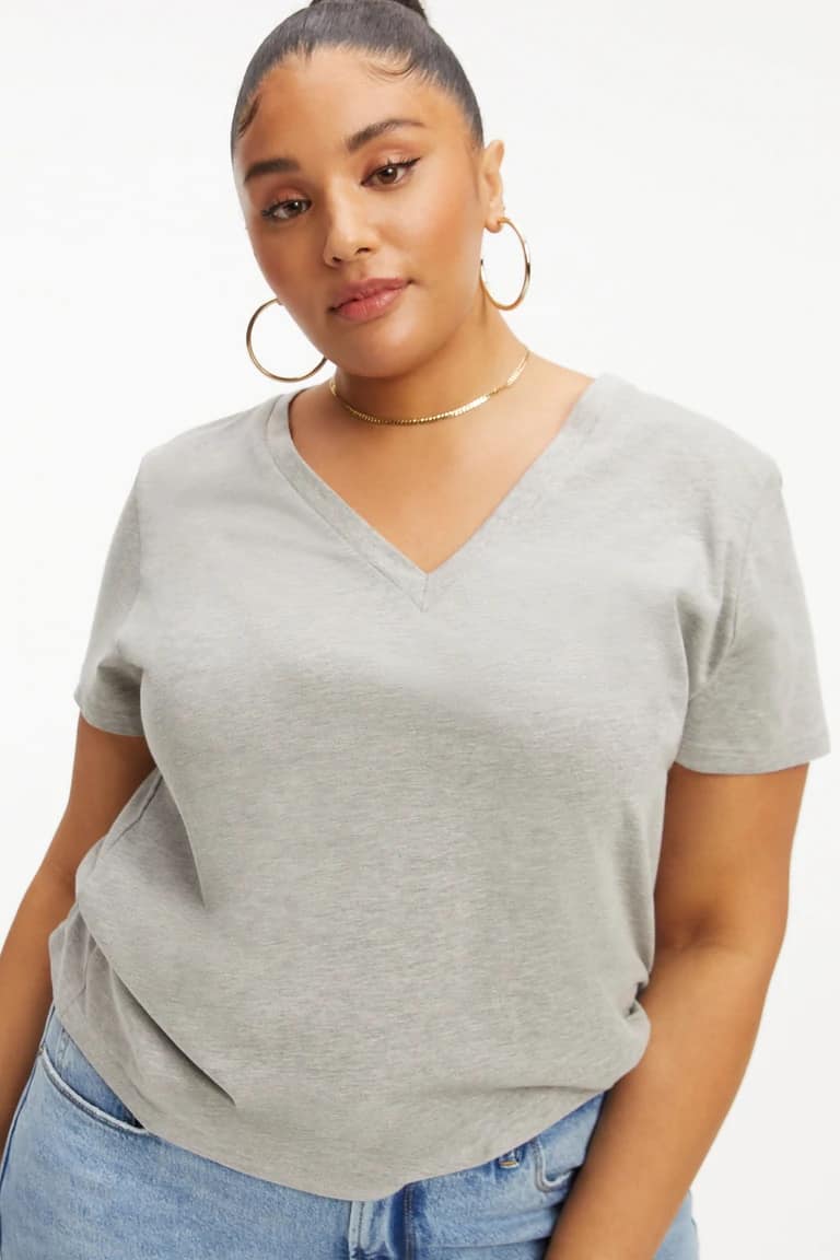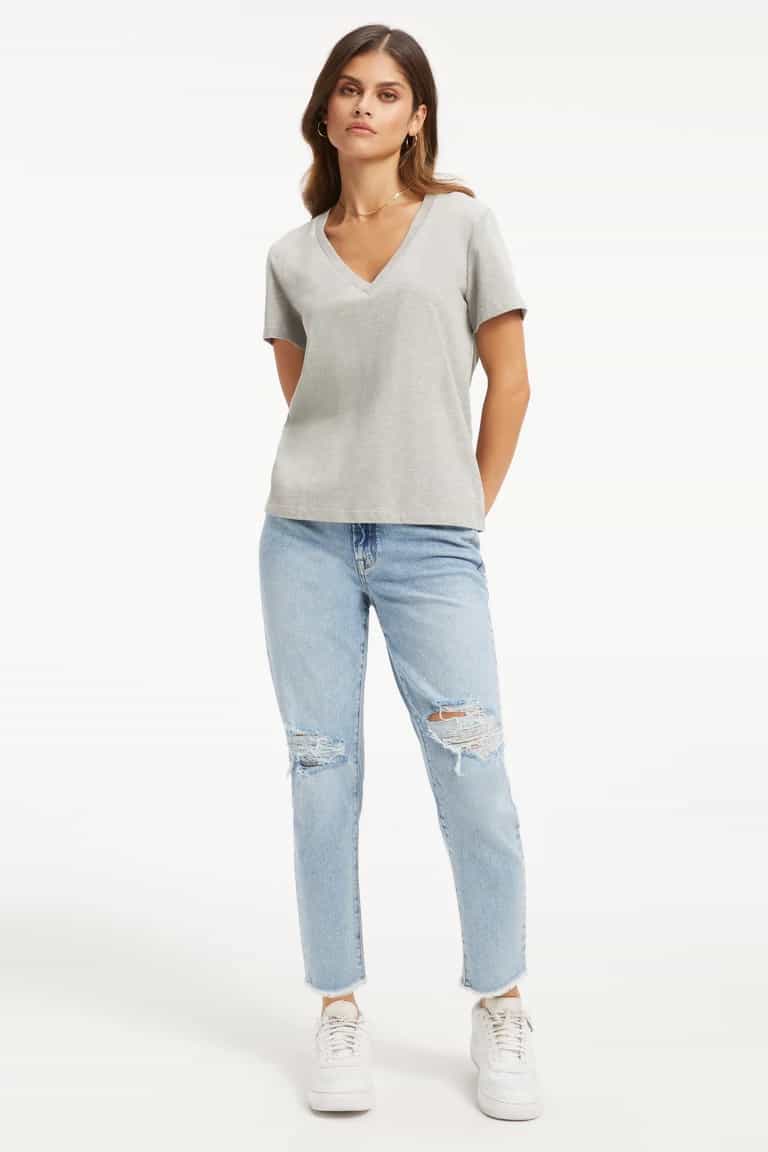 The Good American Classic jersey v neck tee in heather grey is a must have staple for any wardrobe. The tee is made from supima cotton which is super soft from the initial wear. The v neckline ensures a super flattering fit, just team with your favourite denim for an effortlessly stylish look.