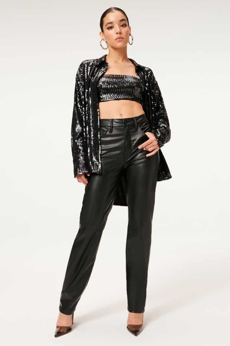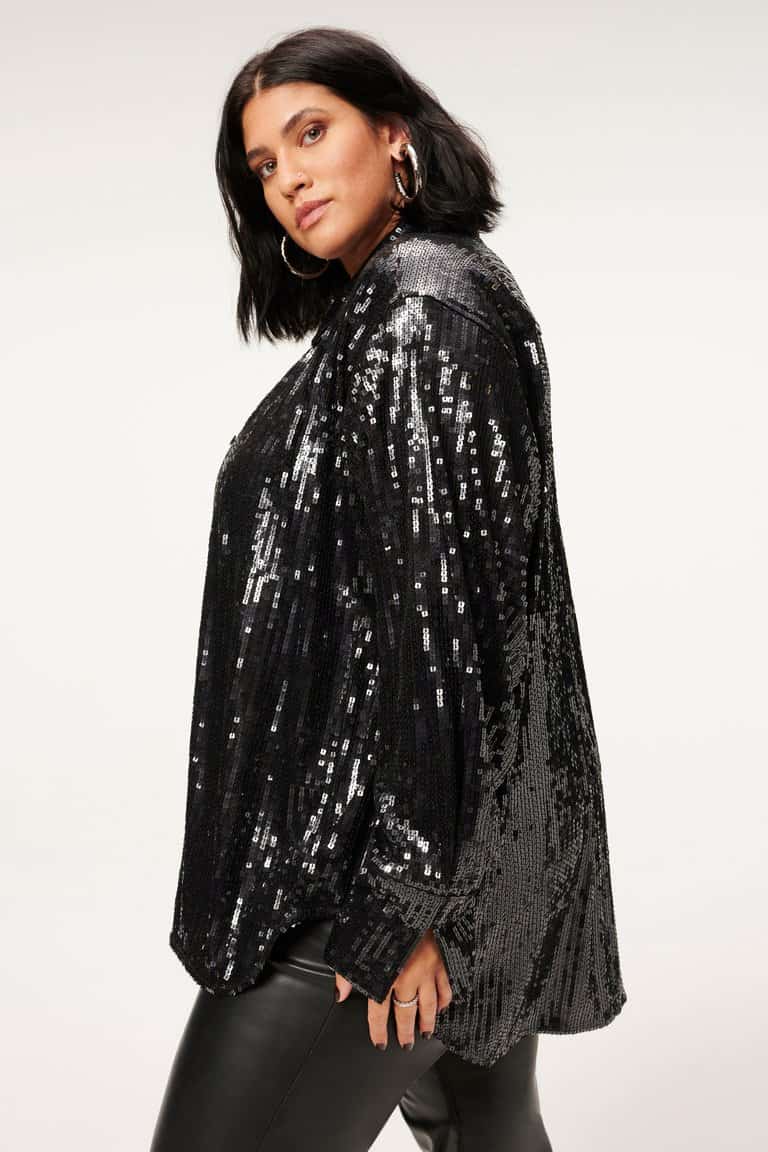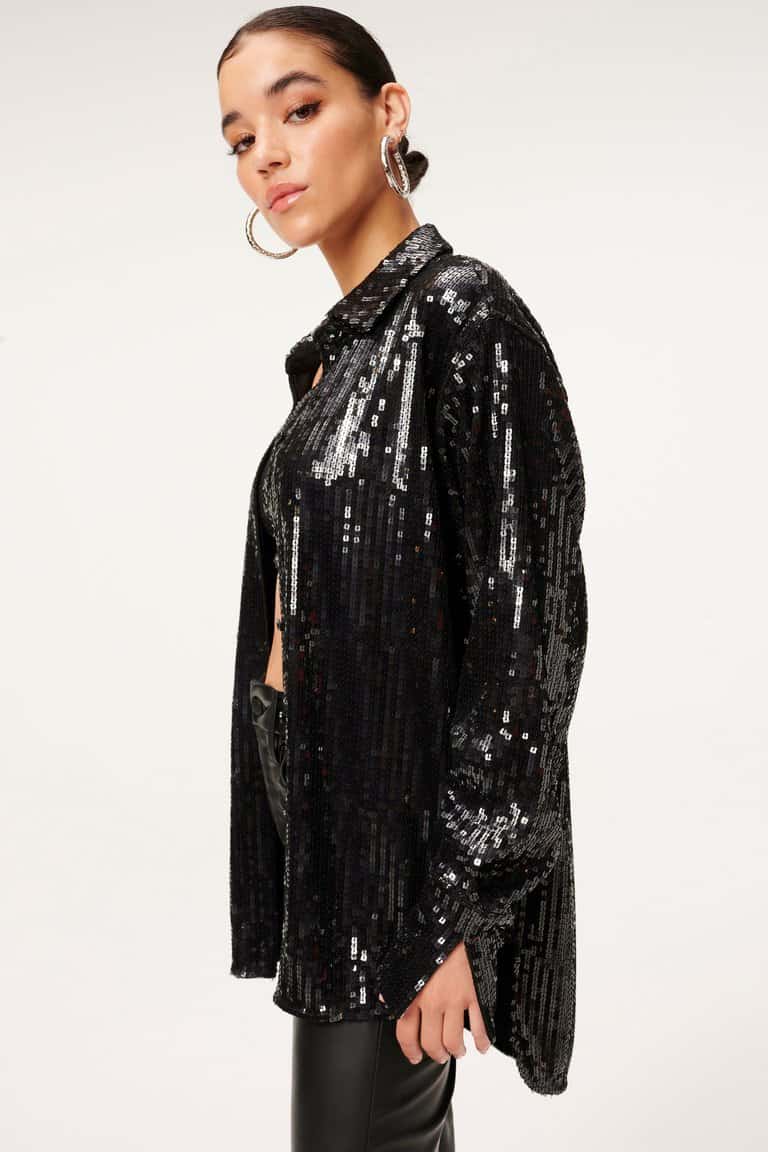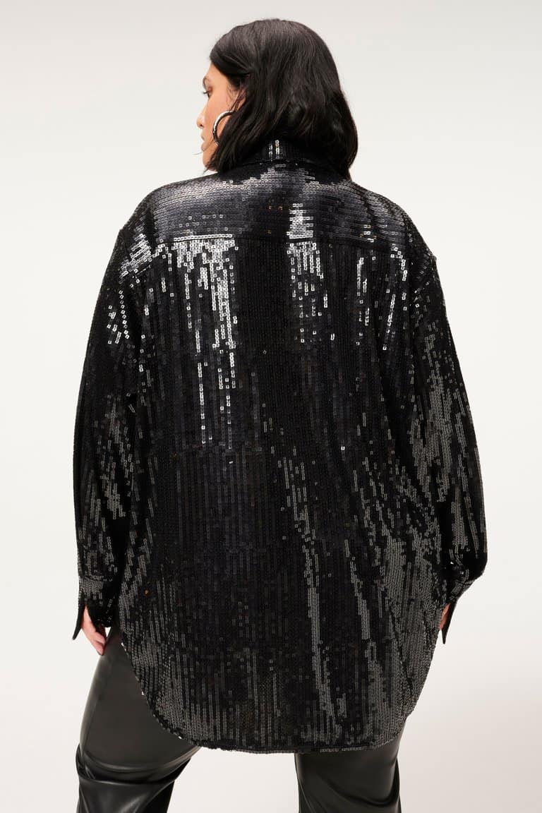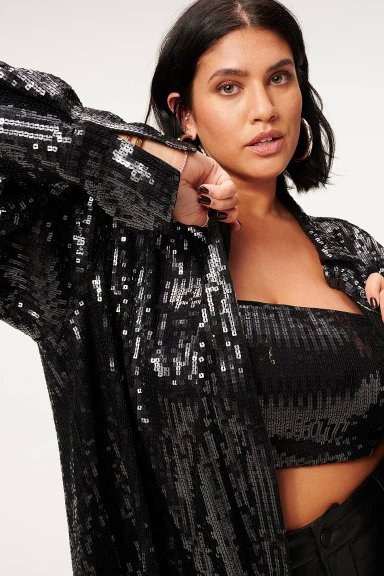 The Good American Sequin party shirt in black is the perfect party piece and a must for any wardrobe. Whether worn on its own with jeans or worn with the coordinating sequin wide trousers, this shirt is designed to get you noticed. The statement shirt is an oversized fit, with a button front fastening and long sleeves.