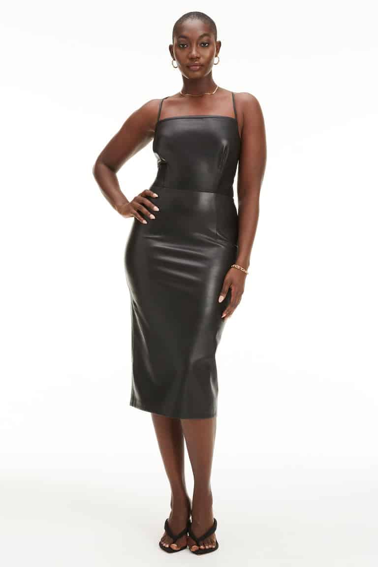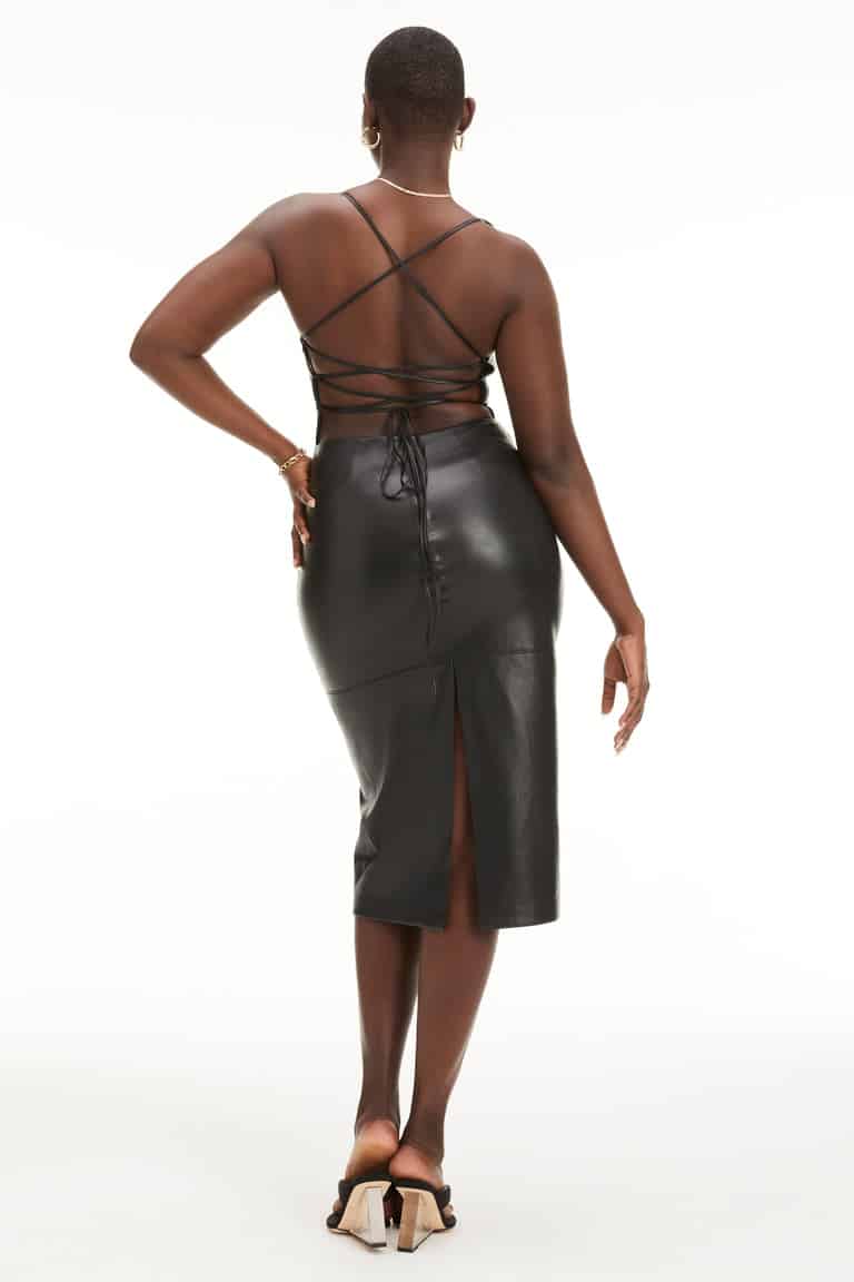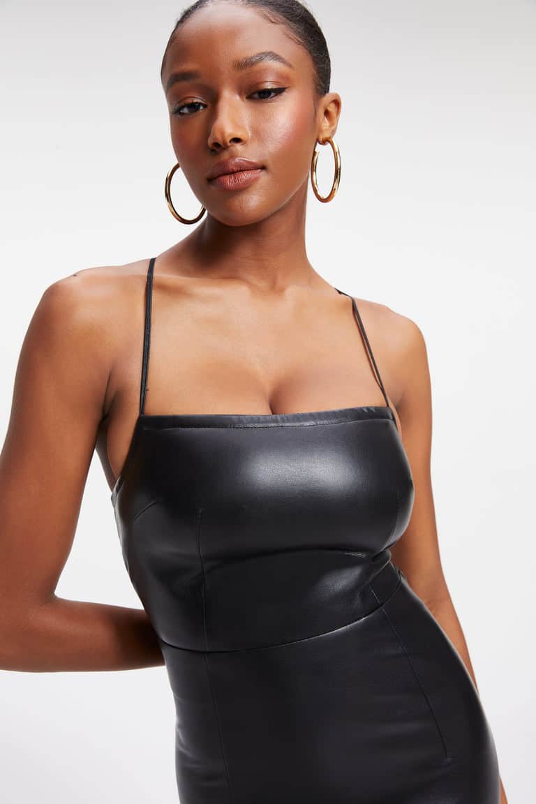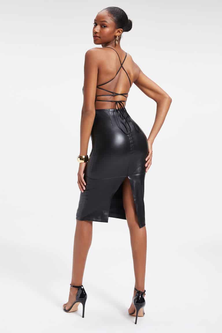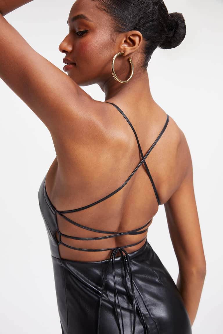 The Good American Vacay Dress in Black is a midi dress featuring an open back lace up designed to hug the sculpt and flatter with a high back slit. The finest faux leather material is buttery soft, lightweight and breathable.