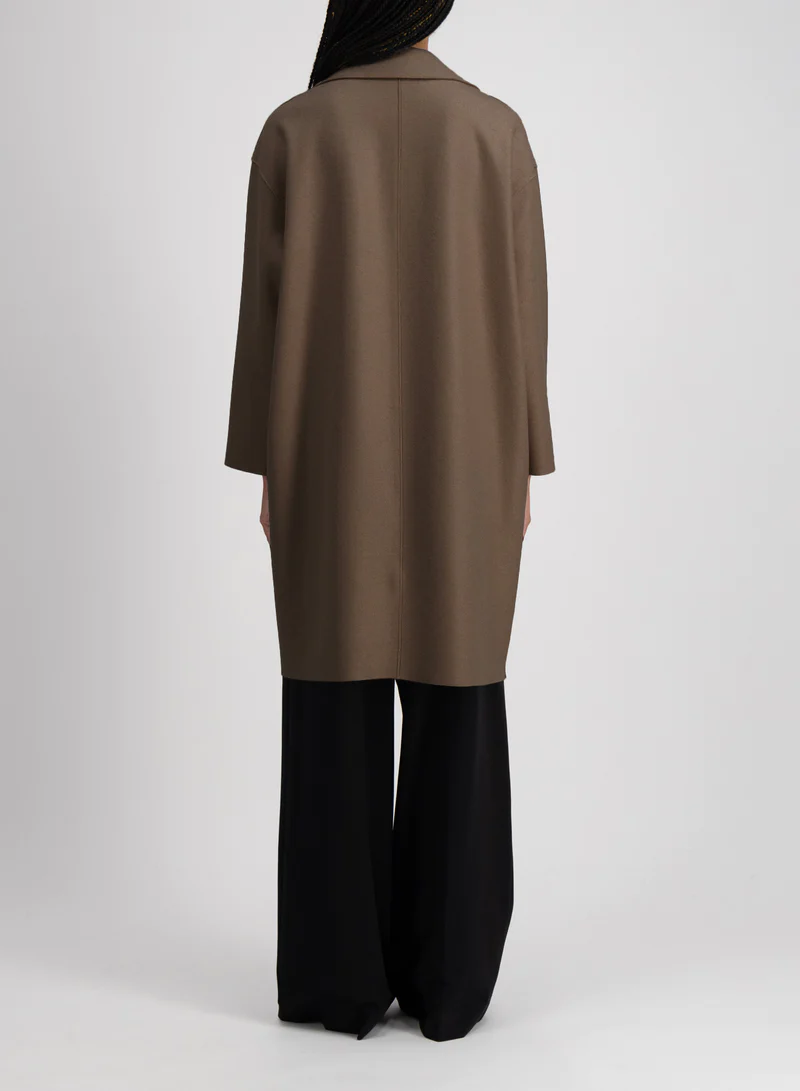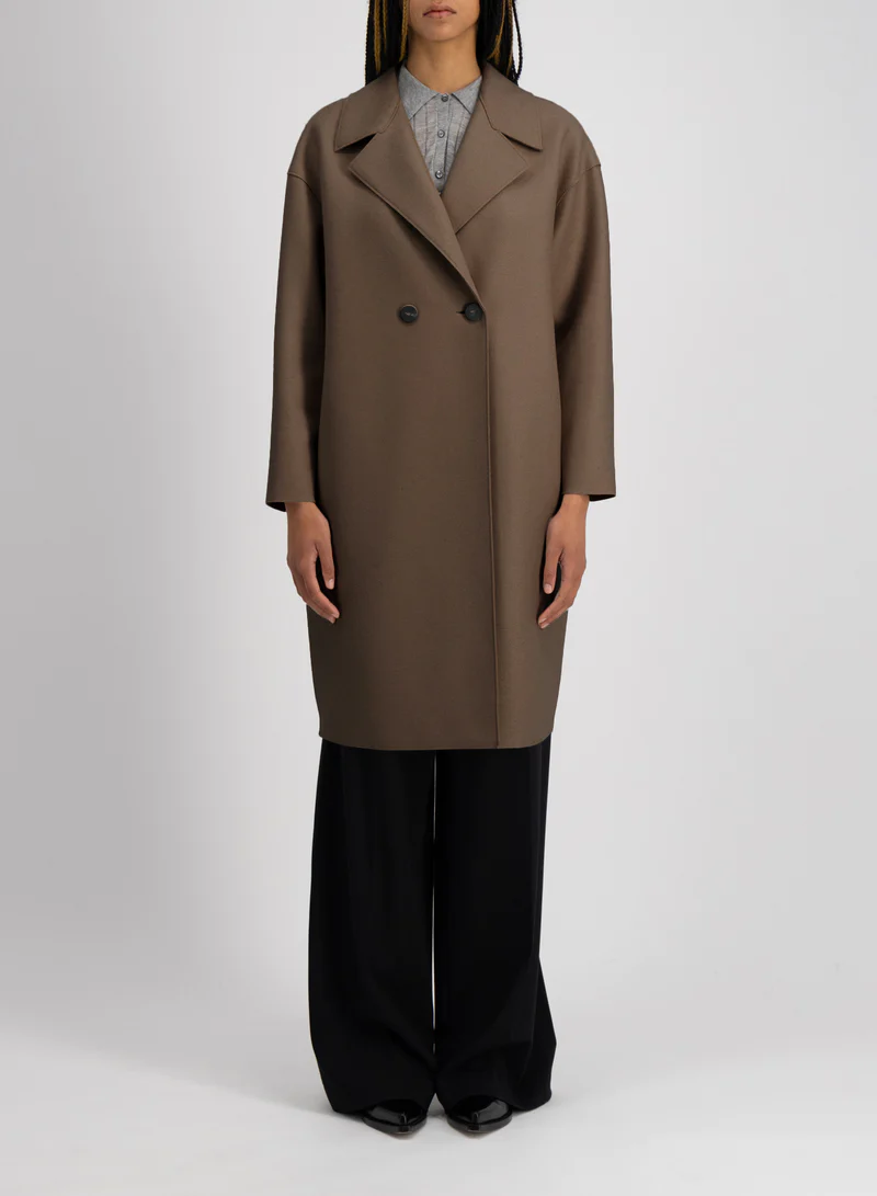 The Harris Wharf Dropped Shoulder Double Breast Wool Coat Teddy Brown is the perfect jacket to take you right through the season. Featuring a knee length and oversized fit, perfect for layering. This coat has a notched lapel and side seam pockets with a raw edge finish.