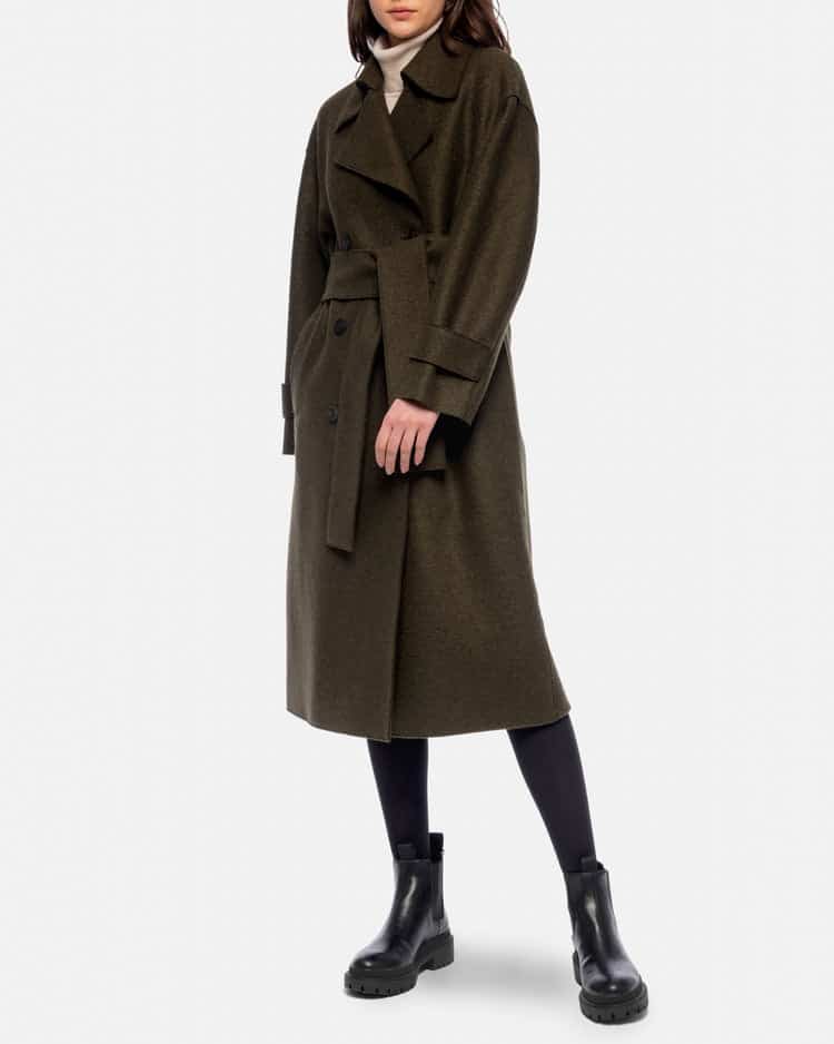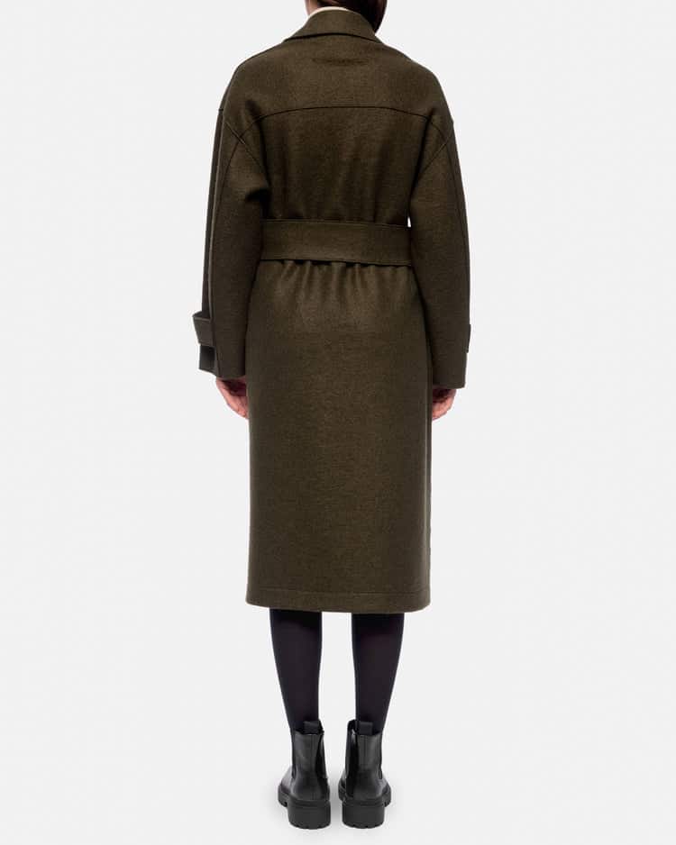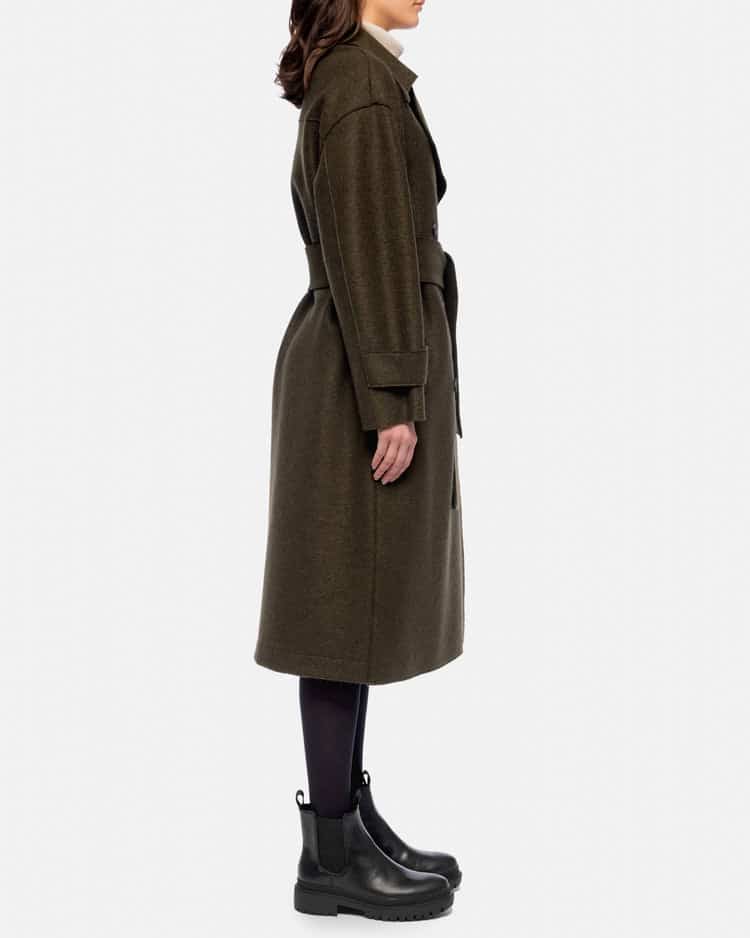The Harris Wharf Long Trench Coat in moss green is the season's must-have item for your wardrobe. This coat is the ideal fashionable accent to any ensemble that feels like a second skin while appearing sophisticated. It features Harris Wharf London's renowned pressed wool. For a more tailored fit that speaks to you, use the belt at the waist.