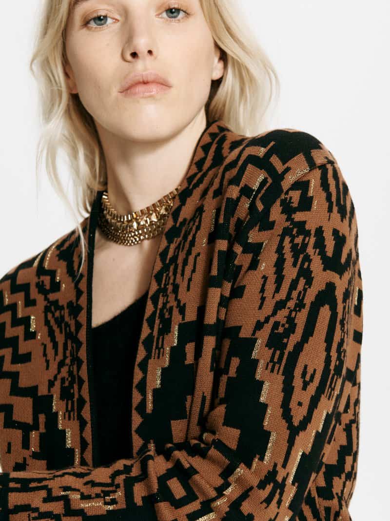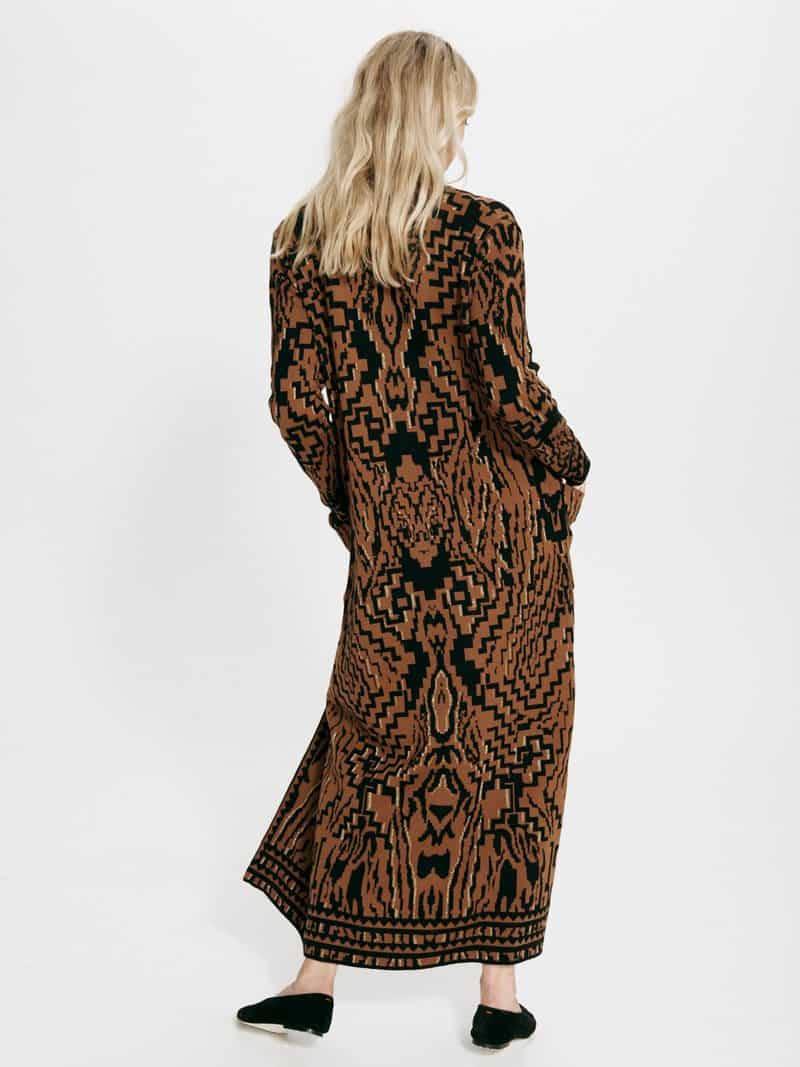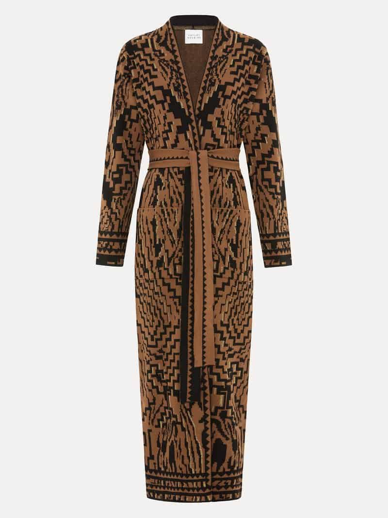 The Hayley Menzies Aztec tiger cotton duster in aztec tiger brown is a simply stunning long knitted cardigan with an animal print woven onto jacquard loom which took over 250 minutes to complete. The long cardigan comes with a belt that allow it to be worn open over jeans and a t-shirt or tied at the waist for a accentuated look. This is perfect way to stay warm and stylish when the weather gets a bit colder.