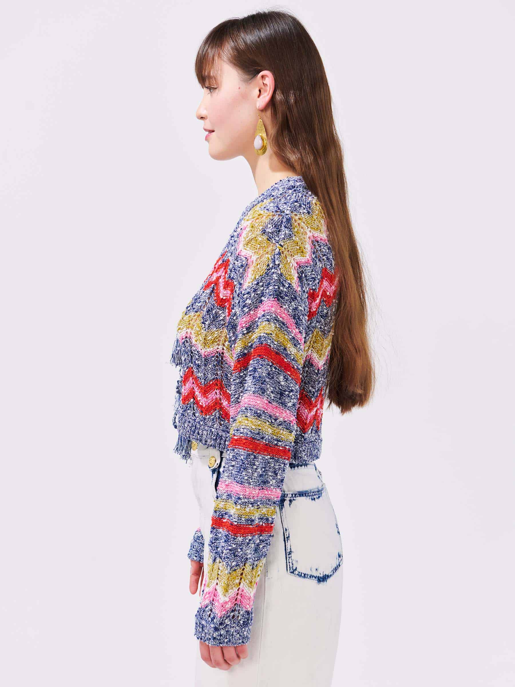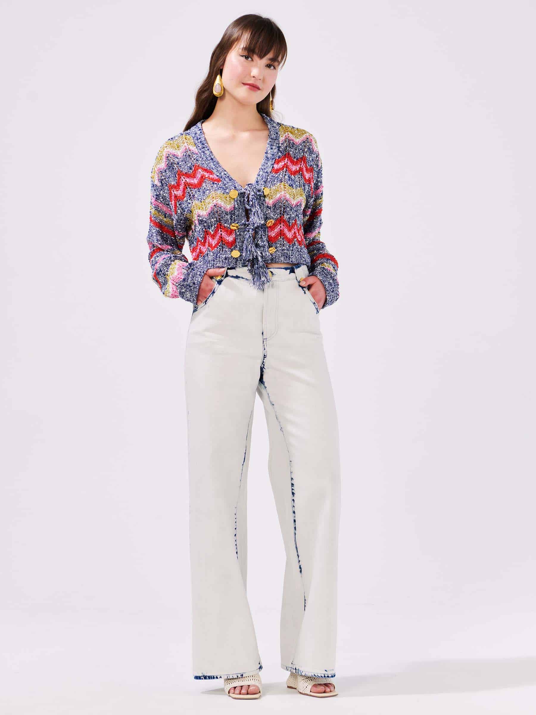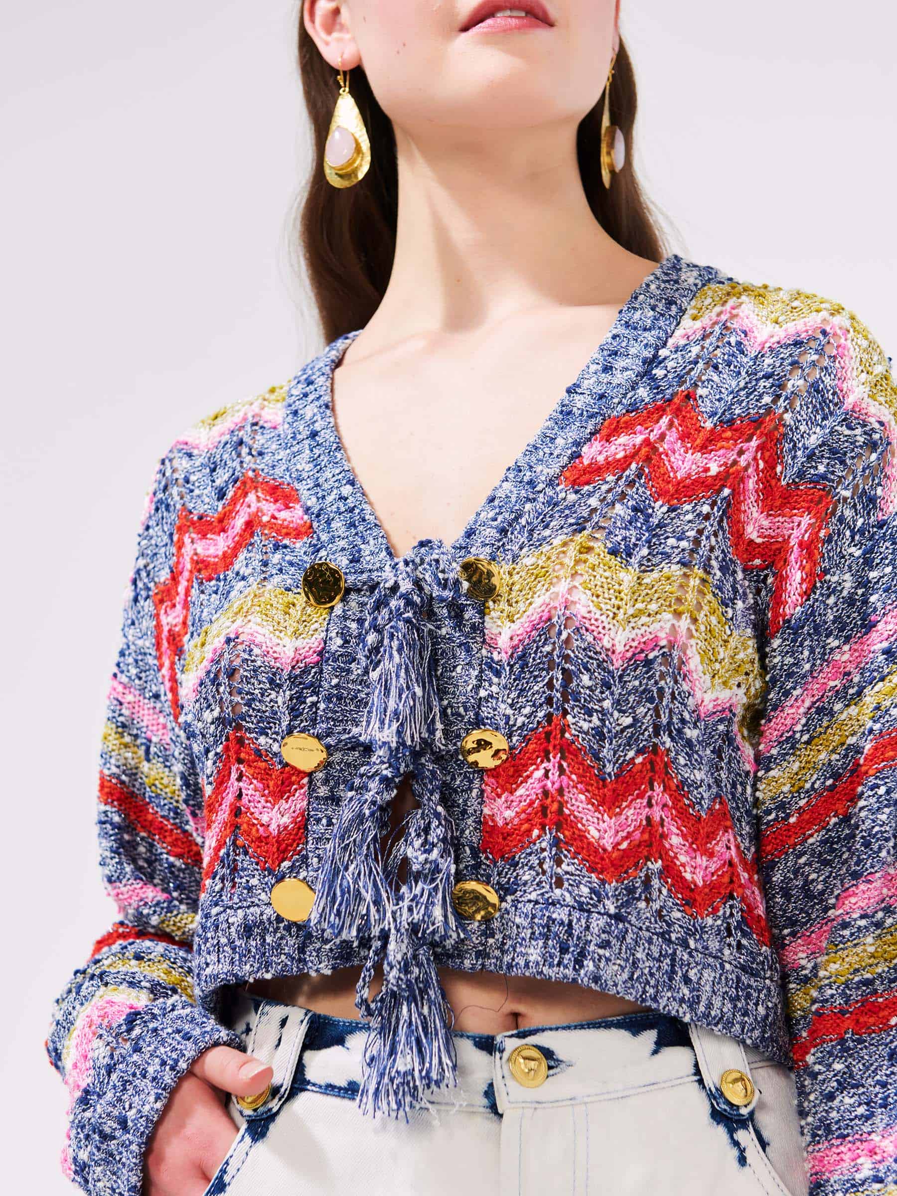 The Hayley Menzies Boucle tie front Cardigan Zig-Zag Navy is the perfect summer knit. Crafted from slub yarn and infused with flecks of metallic thread, this vibrant chevron cropped cardigan has been knitted using a pointelle technique for an open textured, natural finish. Geometric zig-zag motifs nod to the theme of the spring/summer collection, while the bold colours, gold hammered buttons and hand-made tassel fastening are finer details that feel distinctly Hayley Menzies.