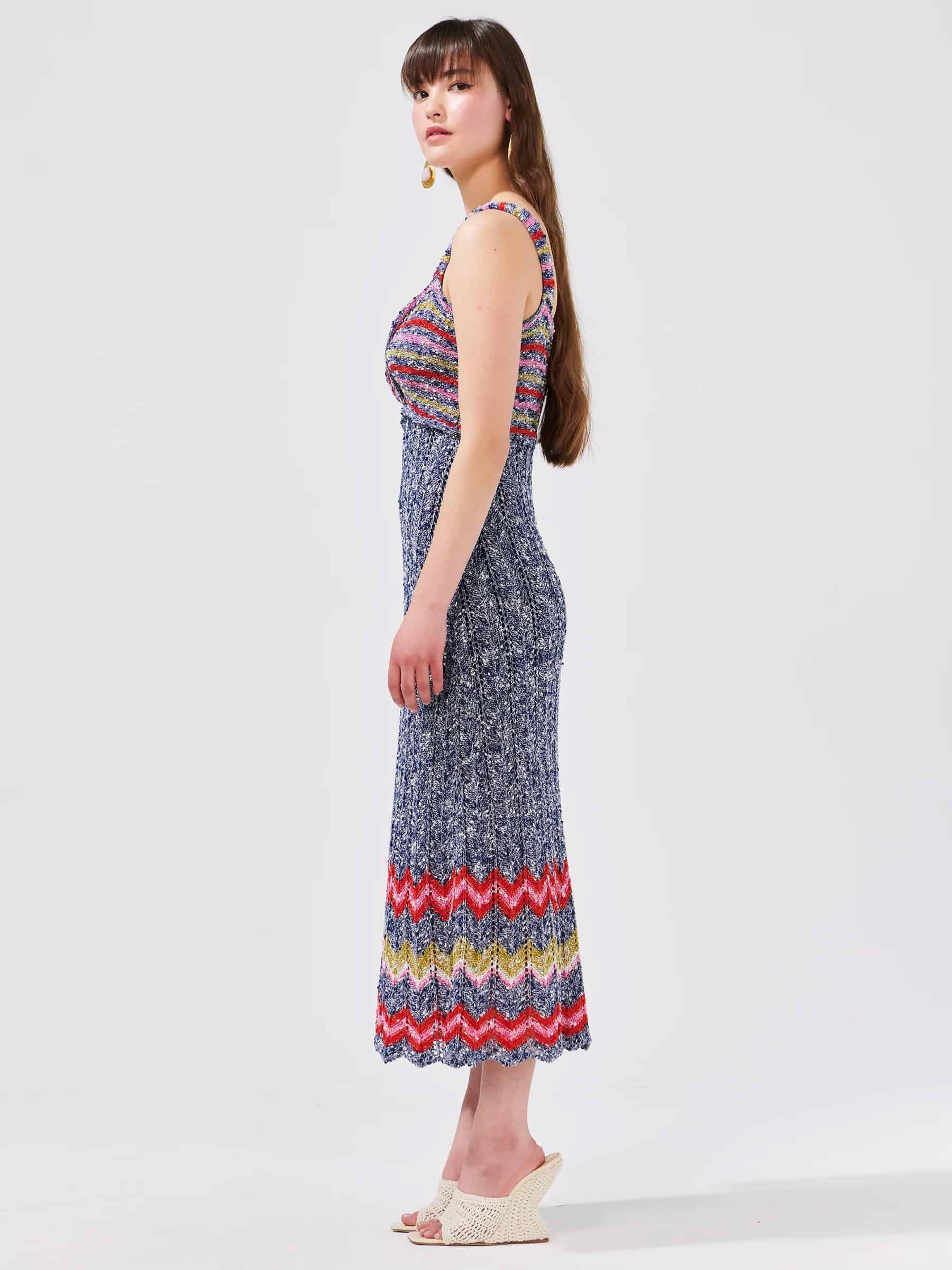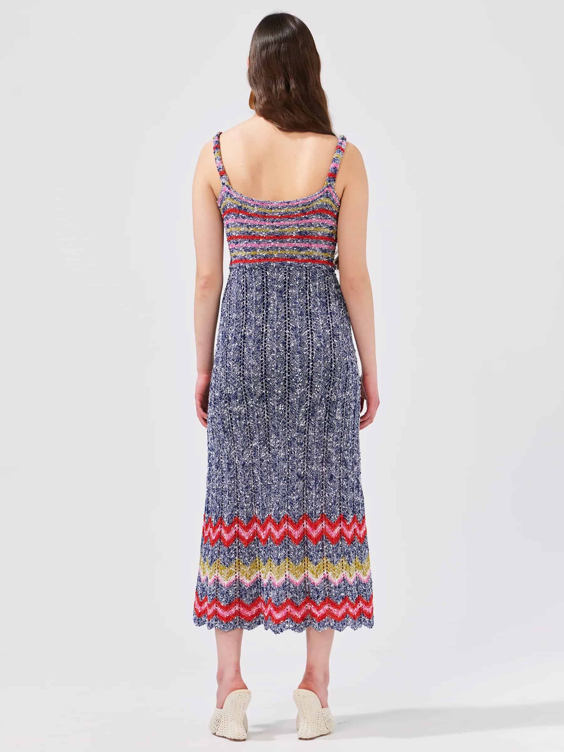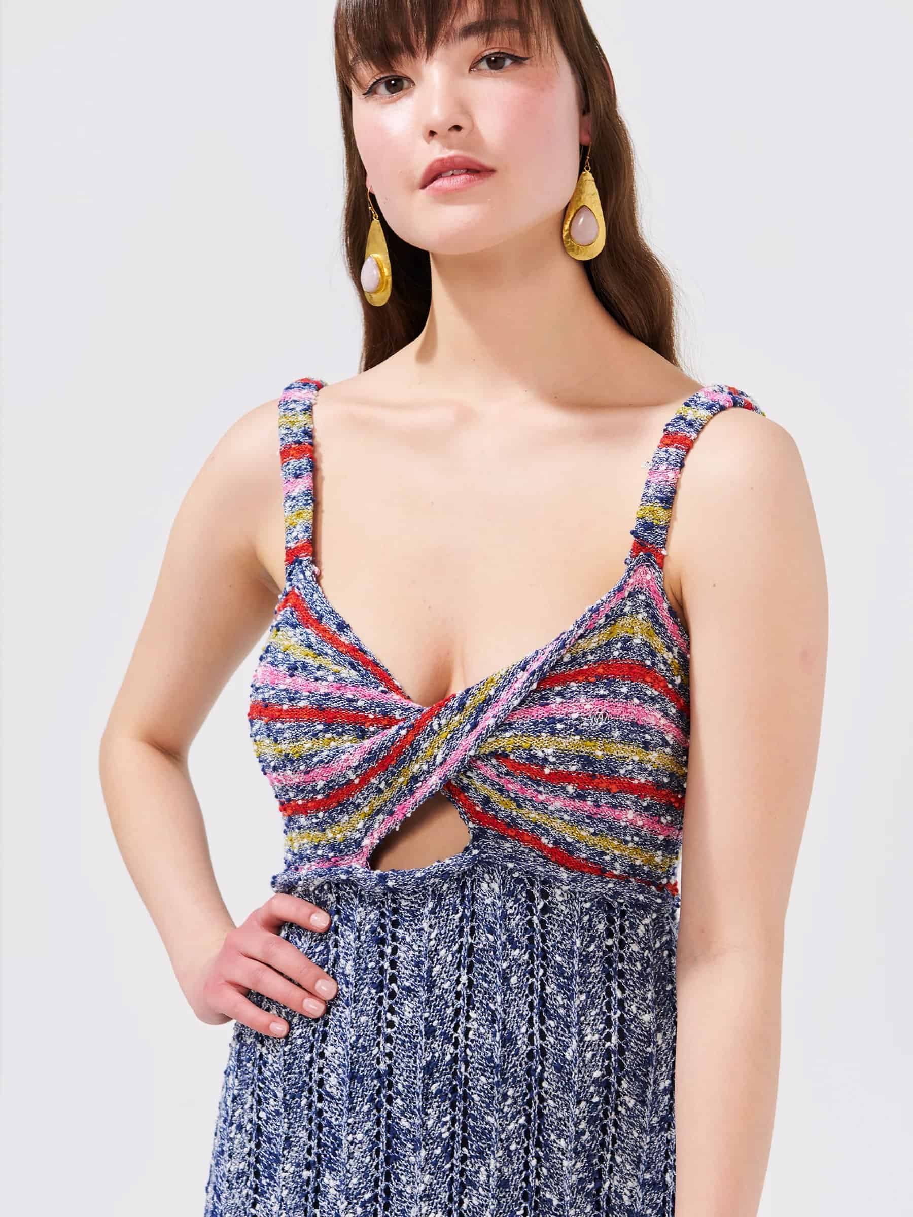 The Hayley Menzies Boucle Twisted Sundress Zig-Zag Navy is a gorgeous sundress in Zig-Zag White crafted from a soft cotton blend using a cleaner, OEKO-TEX certified process. The skirt features an empire waist. elasticated for comfort and ease. The perfect beach to bar outfit for this Summer.