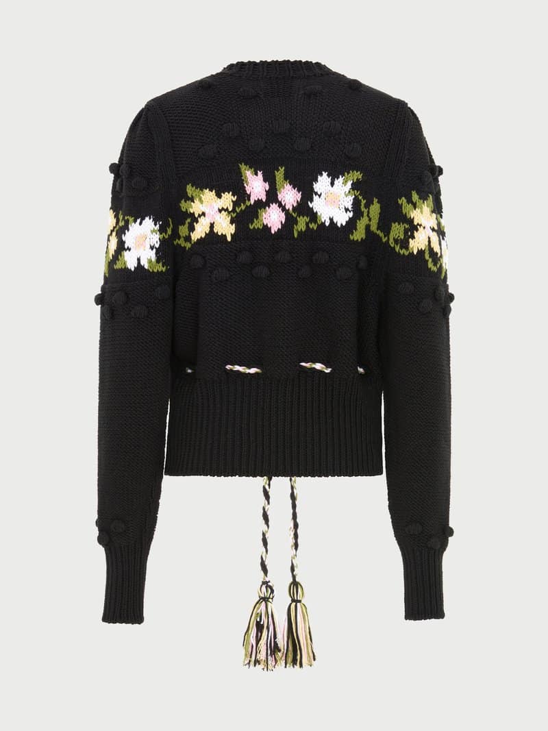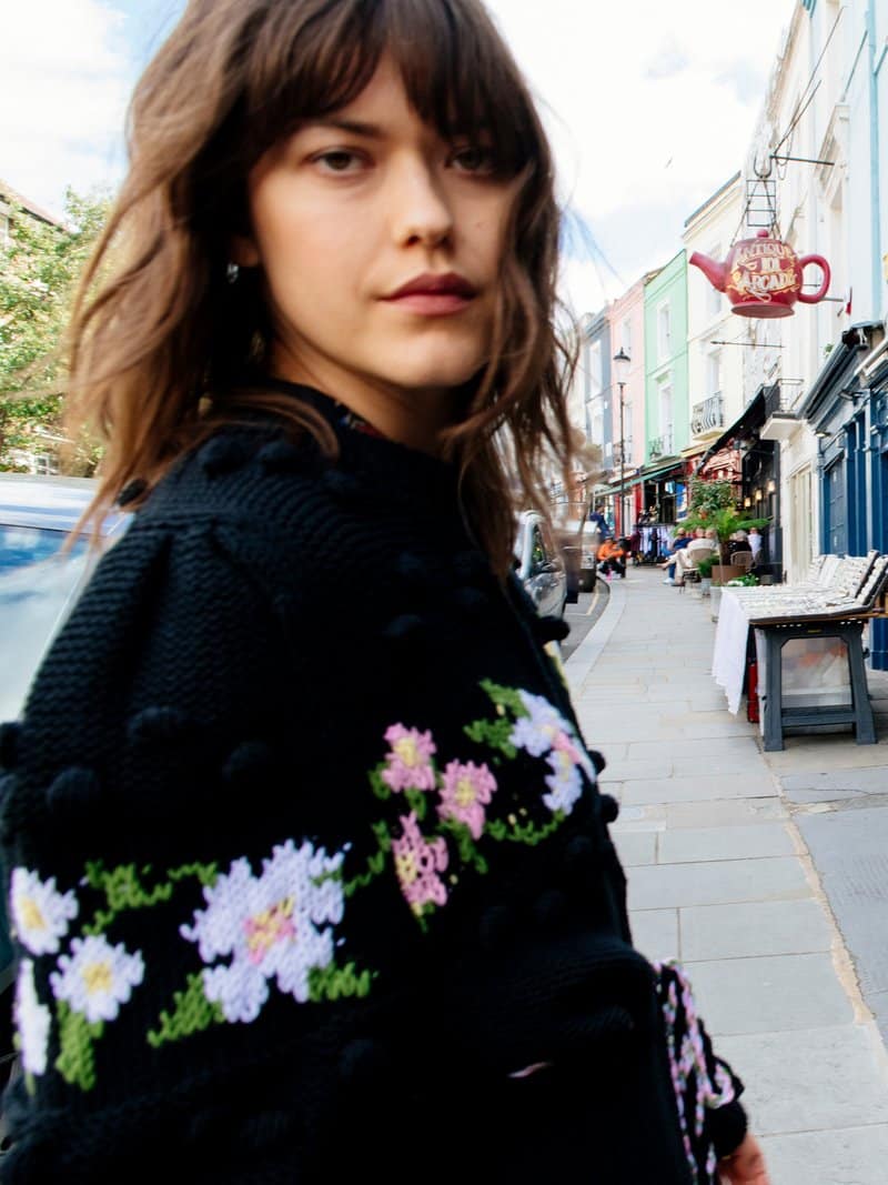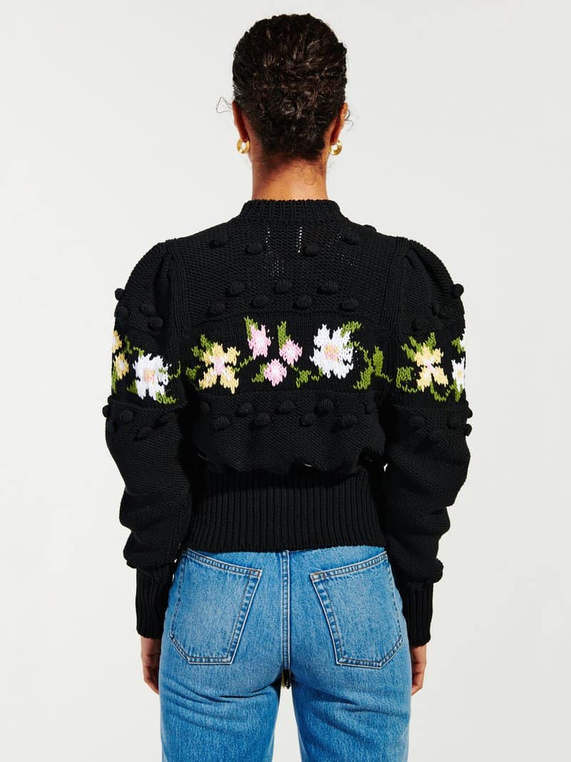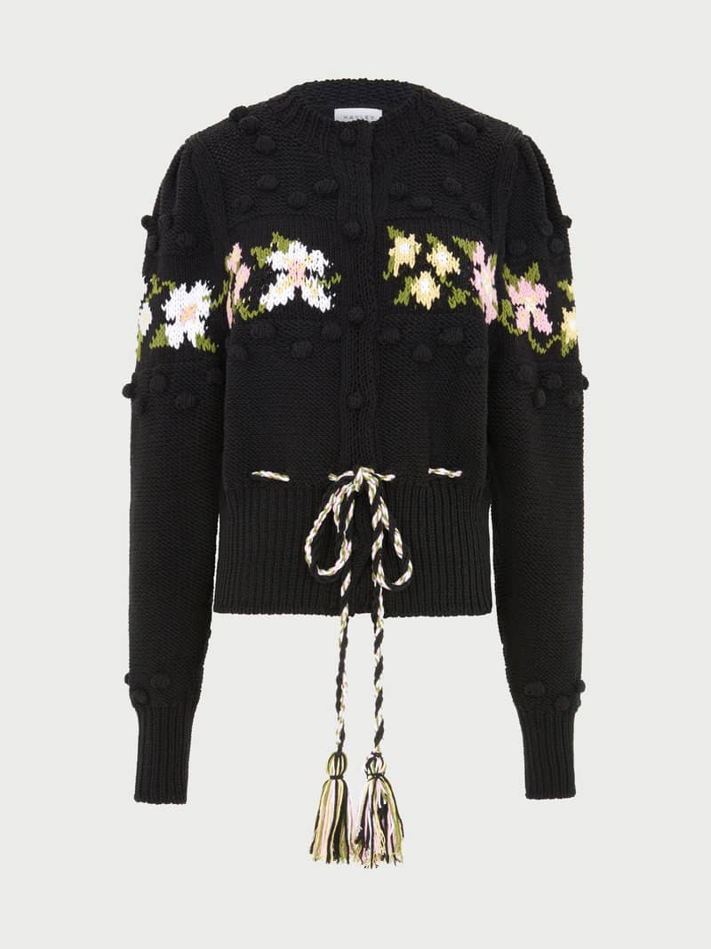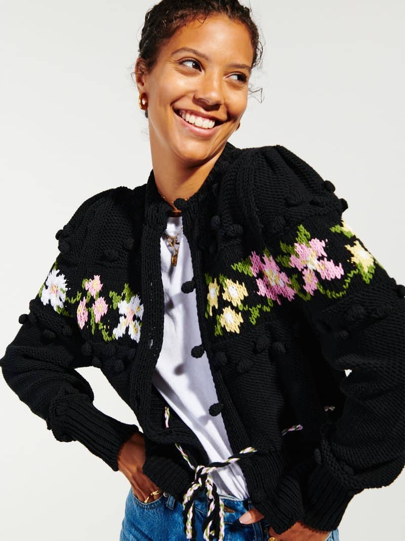 The best selling Hayley Menzies Gladys Intarsia cardigan in black is back for SS21. This previous sell out piece features an intarsia knit floral pattern, knitted buttons and a tassel-tie at the waist. For the perfect day look either team with faded jeans and a t-shirt or wear over the top of the Hayley Menzies Safari dress.