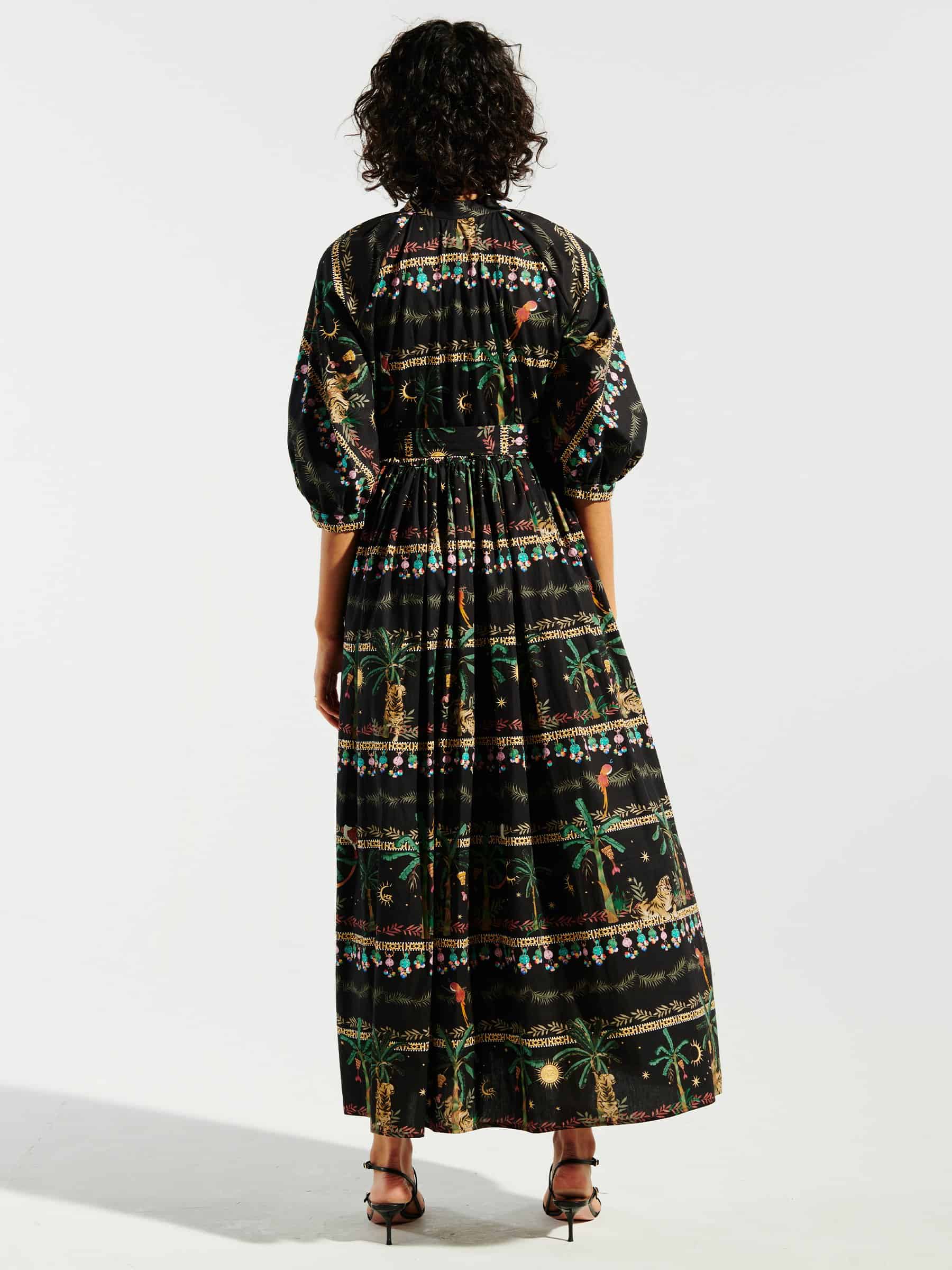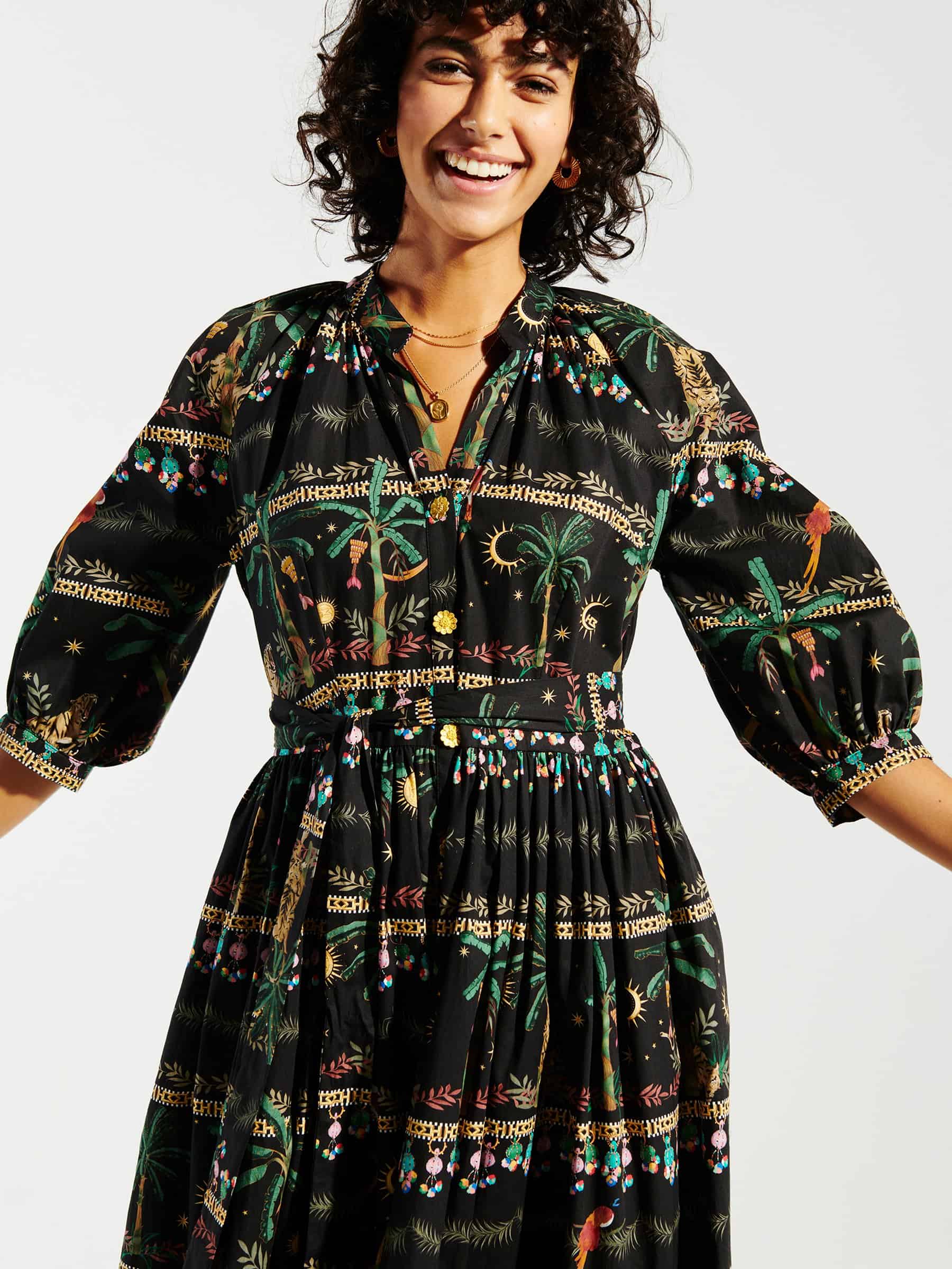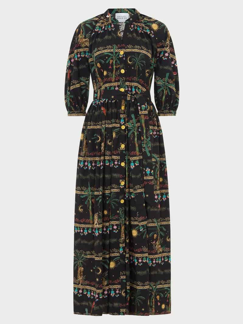 This has got to be one of our favourite dresses this season. The Hayley Menzies midnight safari midi volume shirt dress began as sketches by the pool in Thailand with the Midnight Safari print took four weeks to perfect. The shirt dress fastens down the centre front with intricately detailed gold metal floral buttons. A 3/4 length volume sleeve, relaxed fit at the waist and concealed pockets at the side seam add a laidback dimension to this wonderfully whimsical piece. This is a dress that you will wear over and over again.
