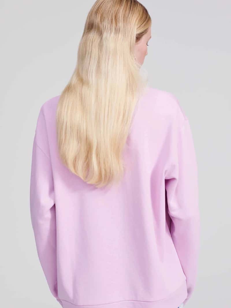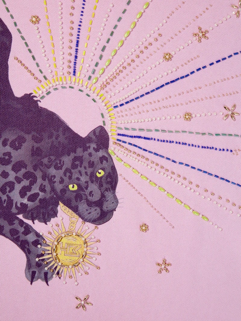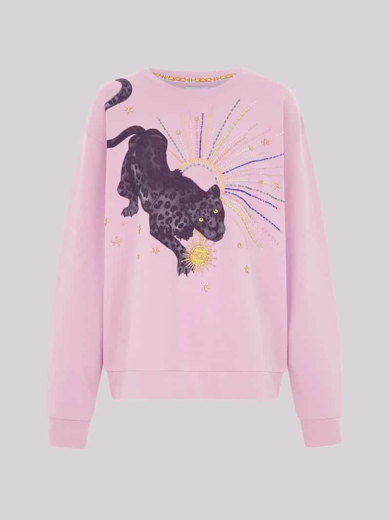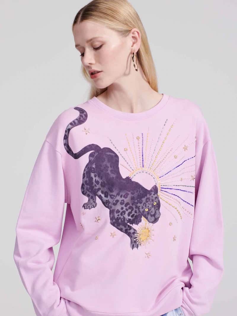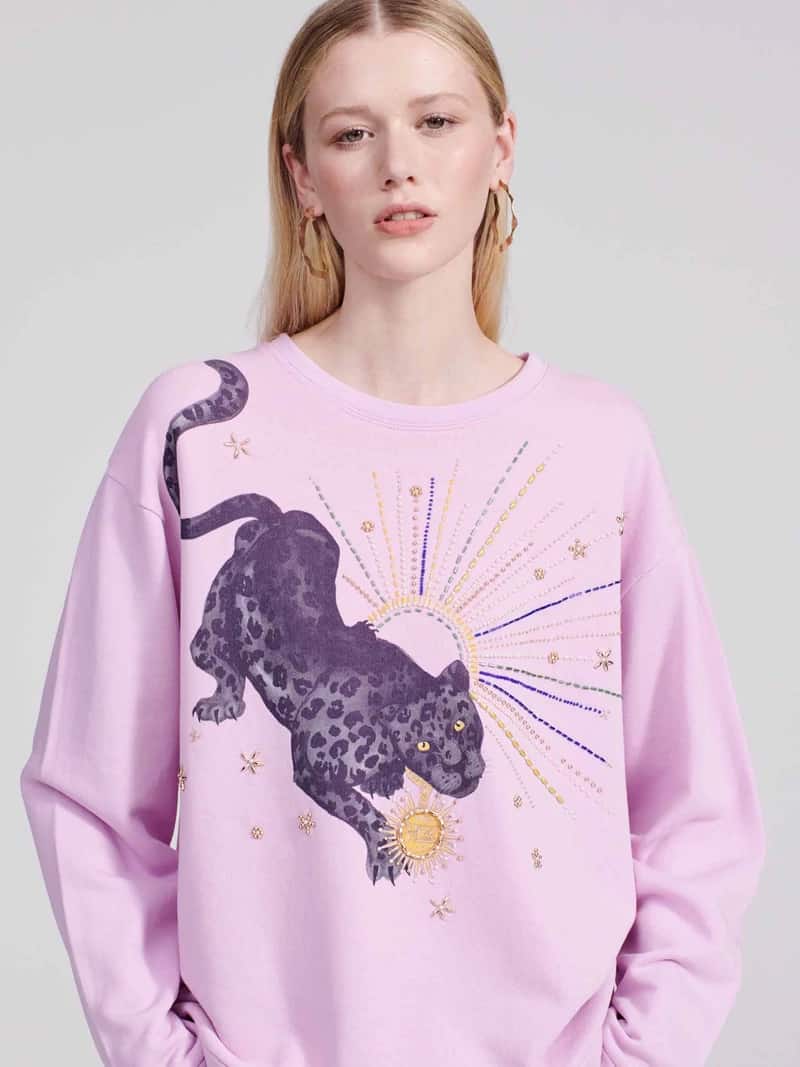 The Hayley Menzies Prowling Panther sweatshirt in acid washed lilac is a cotton sweater with embellished detailing on the front that features a Costa Rican Jaguar. The super soft, boyfriend fit sweater is perfect for elevating any casual outfit and looks amazing when teamed with straight leg jeans as the acid wash evokes a slightly vintage feel, however, for a more sophisticated look then style with a Hayley Menzies silk maxi skirt.