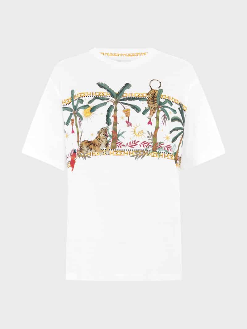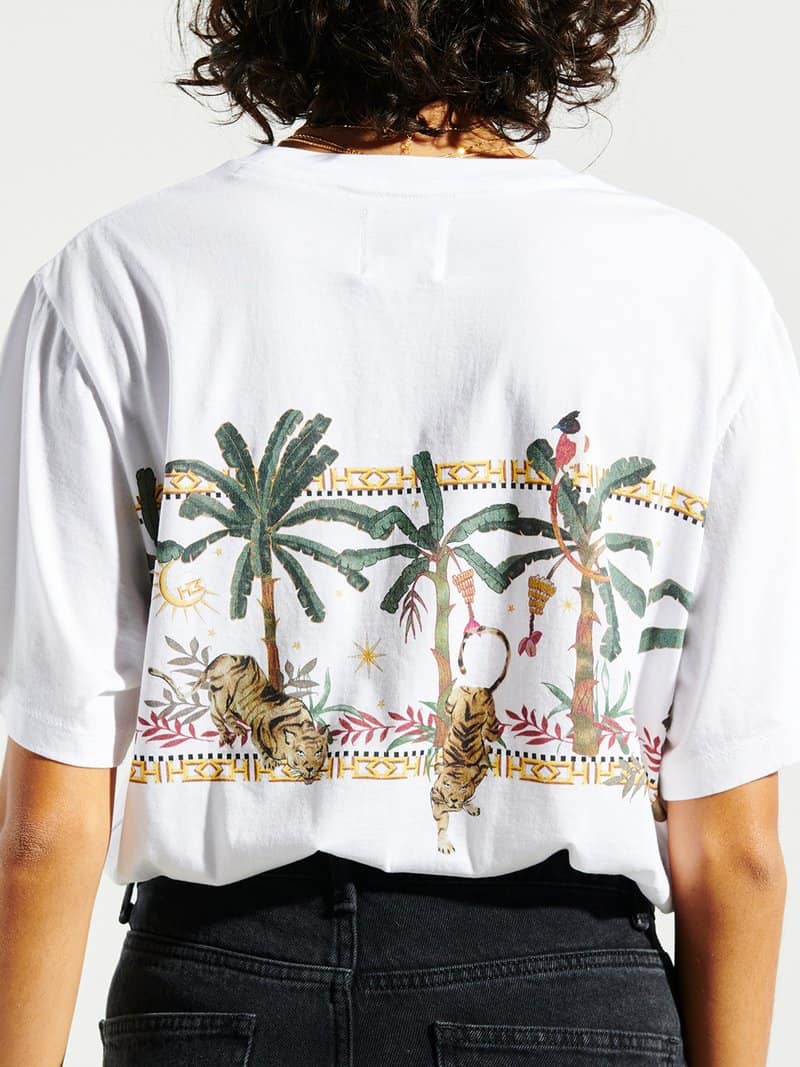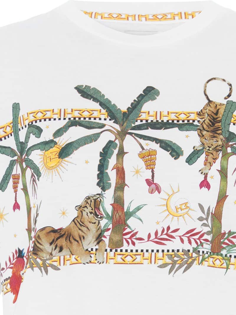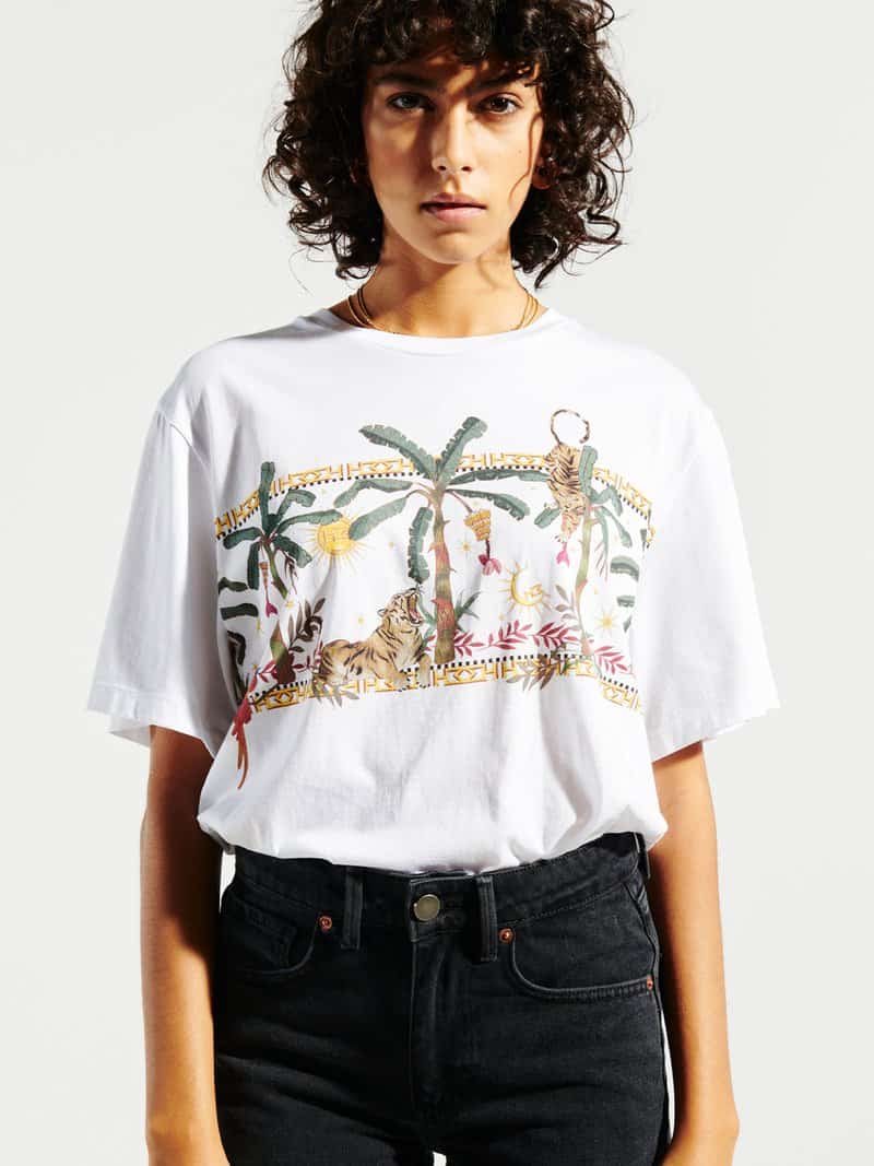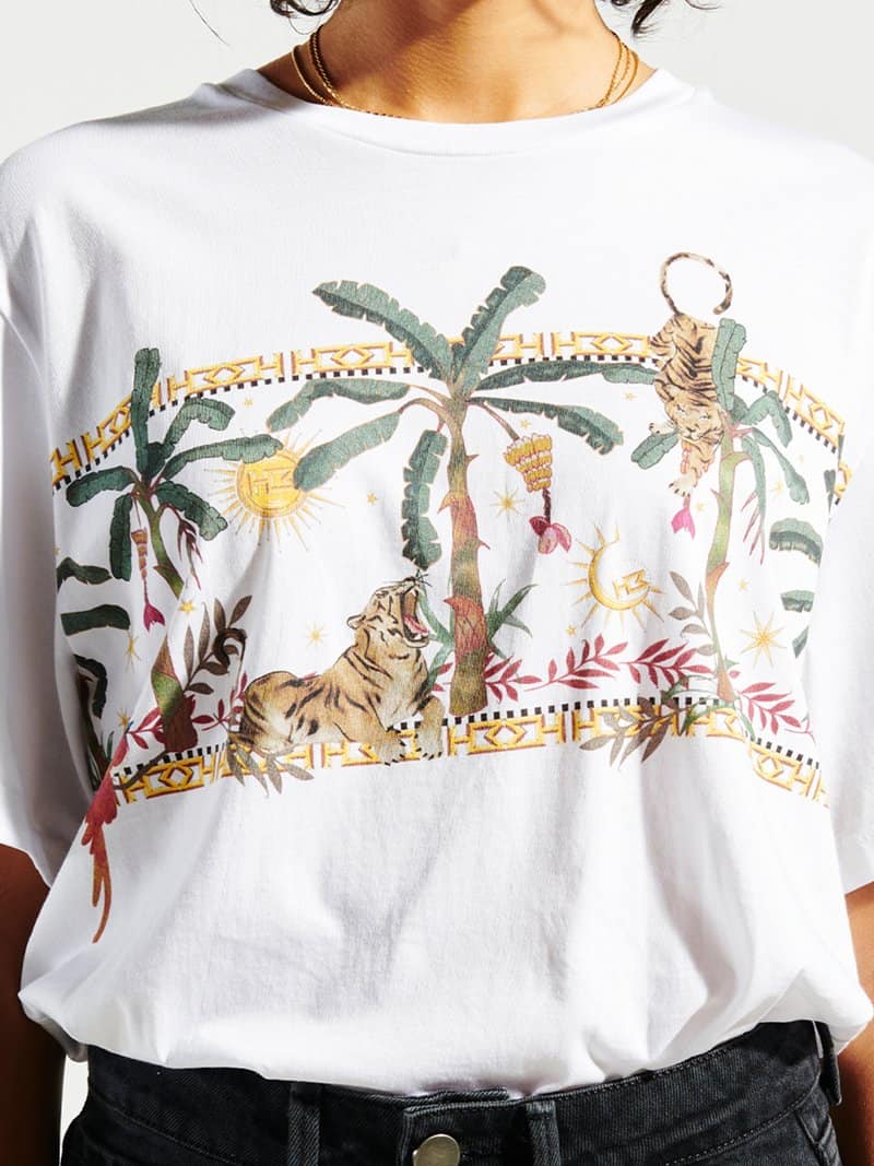 The Hayley Menzies Jungle Safari t-shirt in white is the perfect update to the brands white crew neck t-shirt, with their signature tiger and jungle prints. This piece should be in everyone's wardrobe, super stylish it looks great styled with jeans or a silk skirt