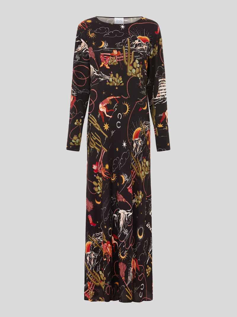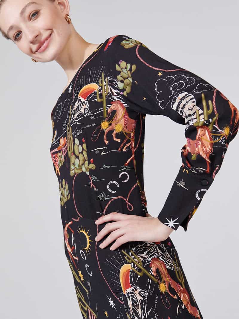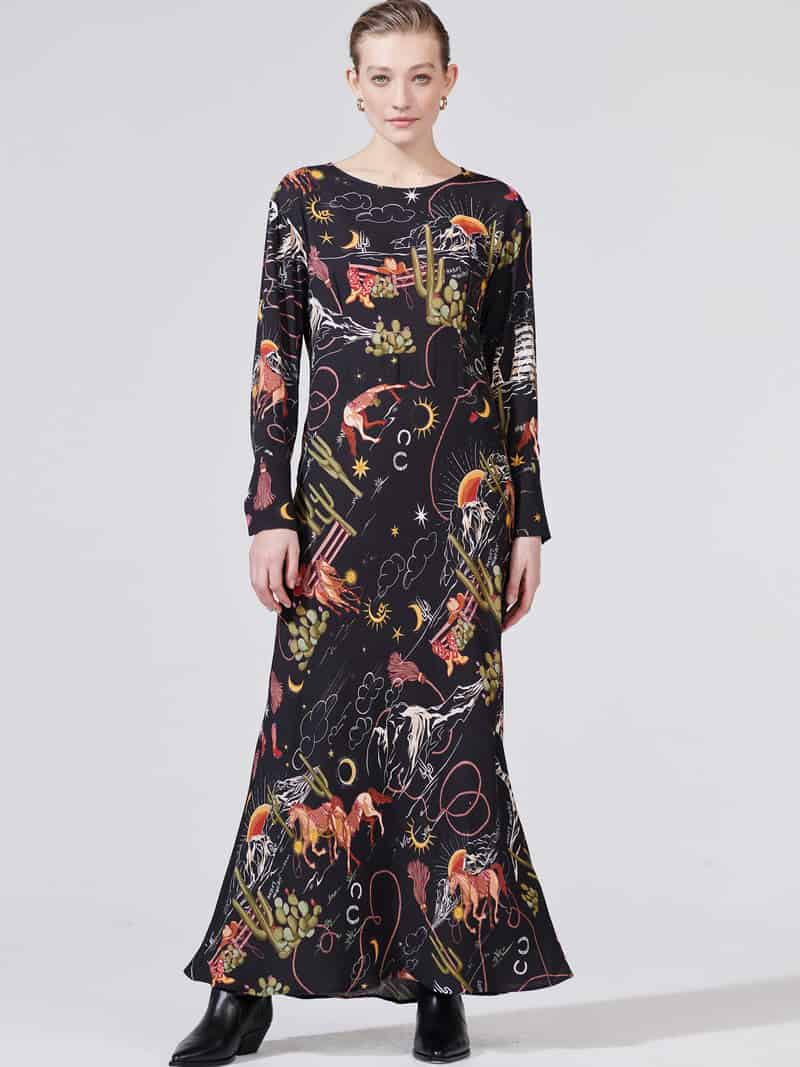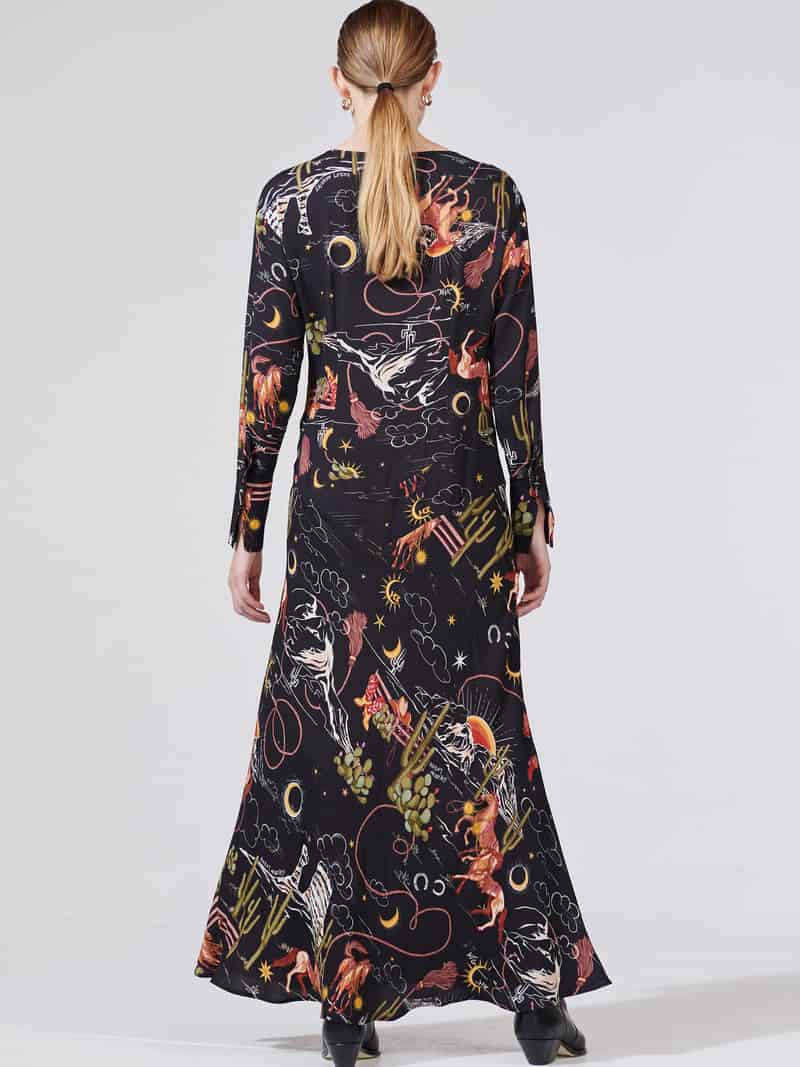 The Hayley Menzies Sundance Crepe Relaxed Maxi in black multi was influenced by old western cartoons that showed a herd of horses breaking loose and galloping over the desert in the direction of the setting sun. This complex print is enhanced with the trademark golden moon and stars in a chinoiserie style. This season's new casual dress trend has an exaggerated cuff and loose long sleeves, making it flattering and simply stylish. To complete the outfit, pair with ankle boots.