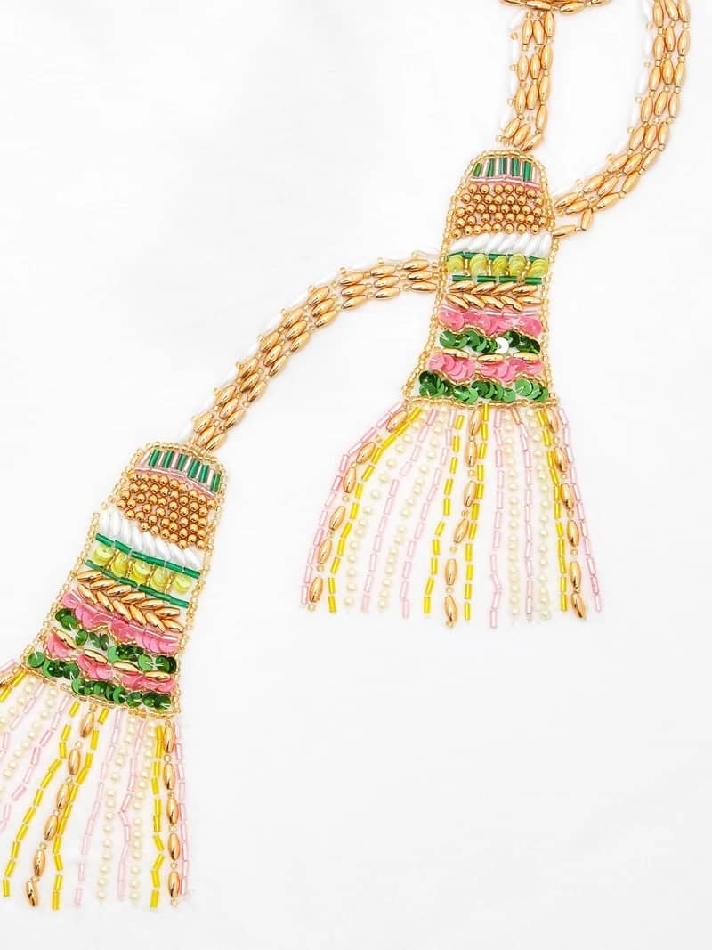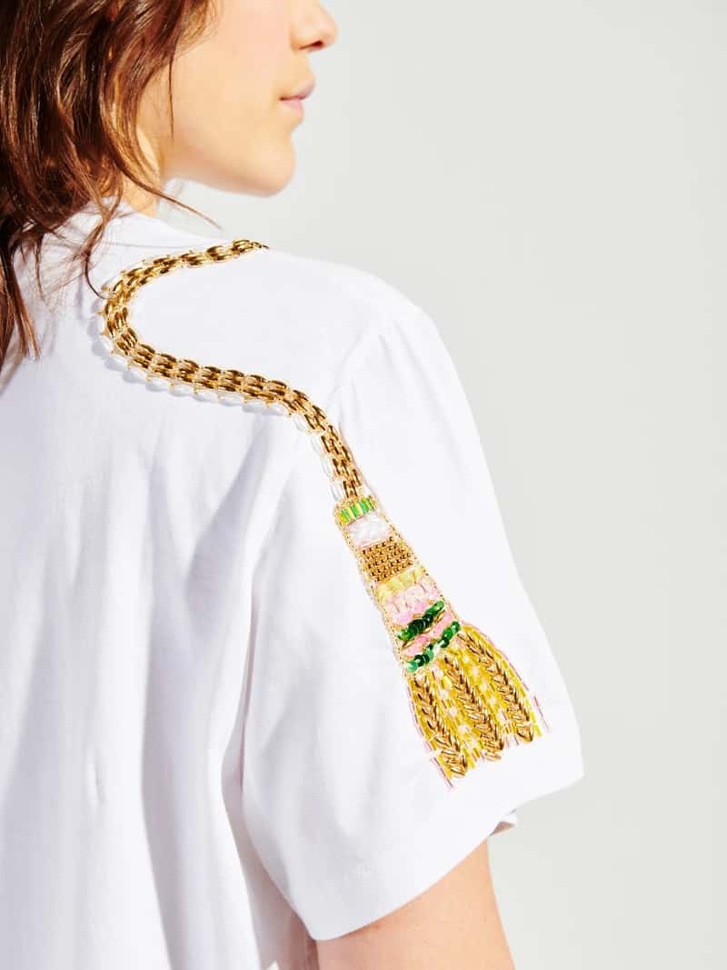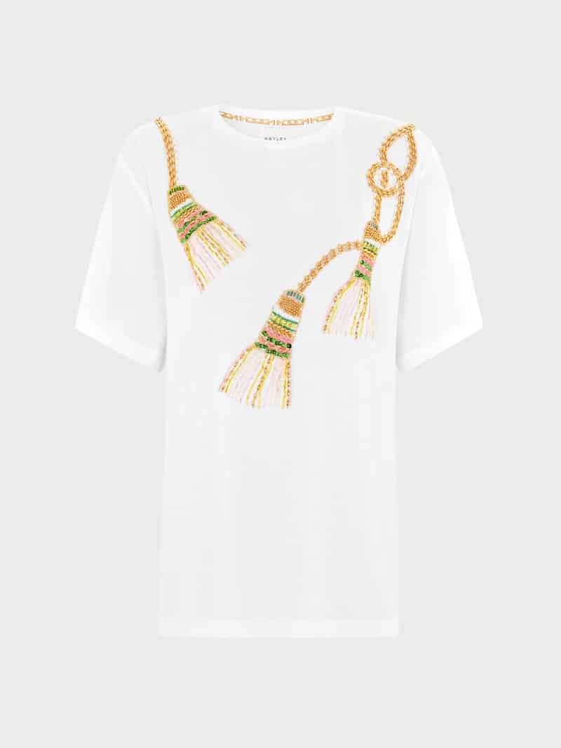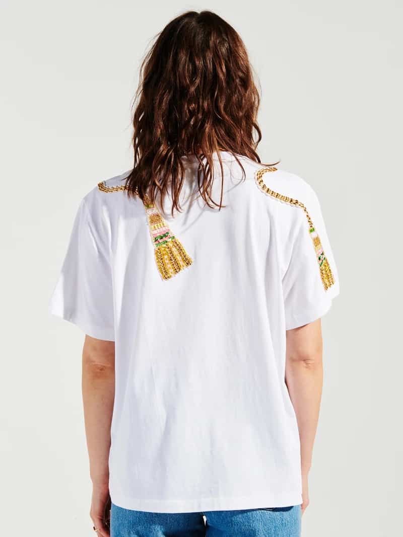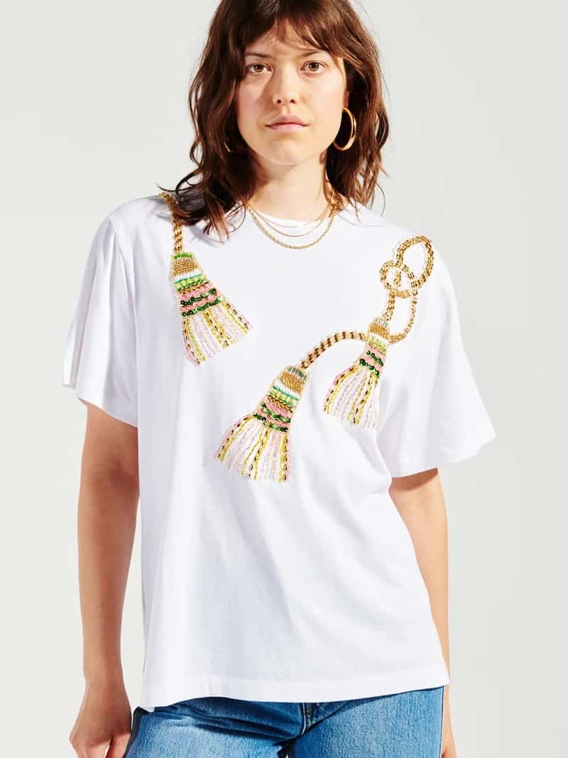 The Hayley Menzies Tassels beaded t-shirt in white is a stunning change to the usual white t-shirt with the hand embroidery taking over 10 hours to complete. This crew neck t-shirt was inspired by a vintage jacket Hayley picked up at a market in LA. Elevate your casual style by teaming it with your favourite jeans or printed skirt.
