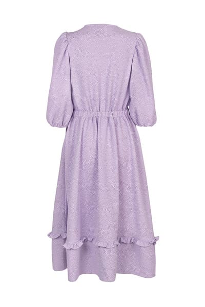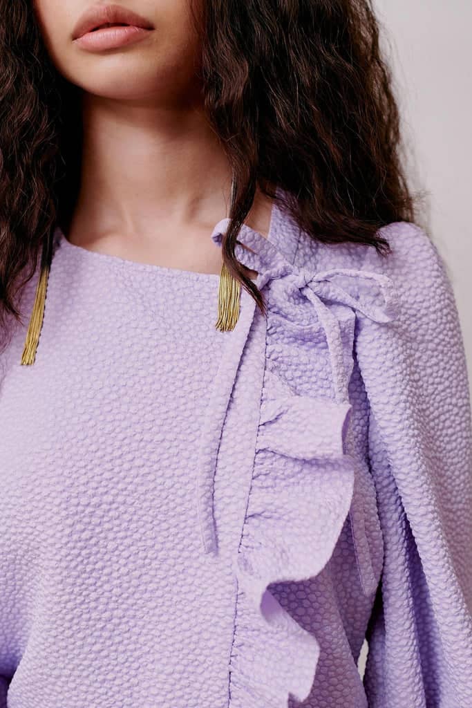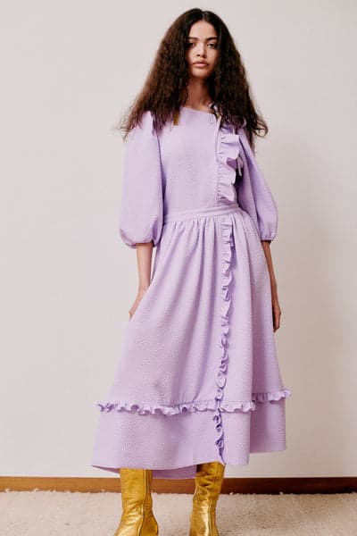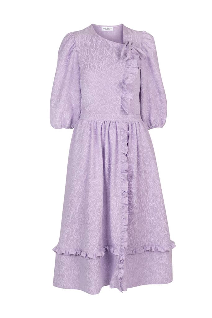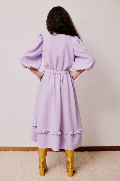 This Hofmann Copenhagen Ellese Dress in Dahlia is a romantic yet playful dress with ruffle detailing and multiple styling options at front. Mid-length balloon sleeves, elasticated back waistline for at comfortable fit and a floating A-skirt. The dress has an opening towards left side, side pockets and a zipper at side seam.
