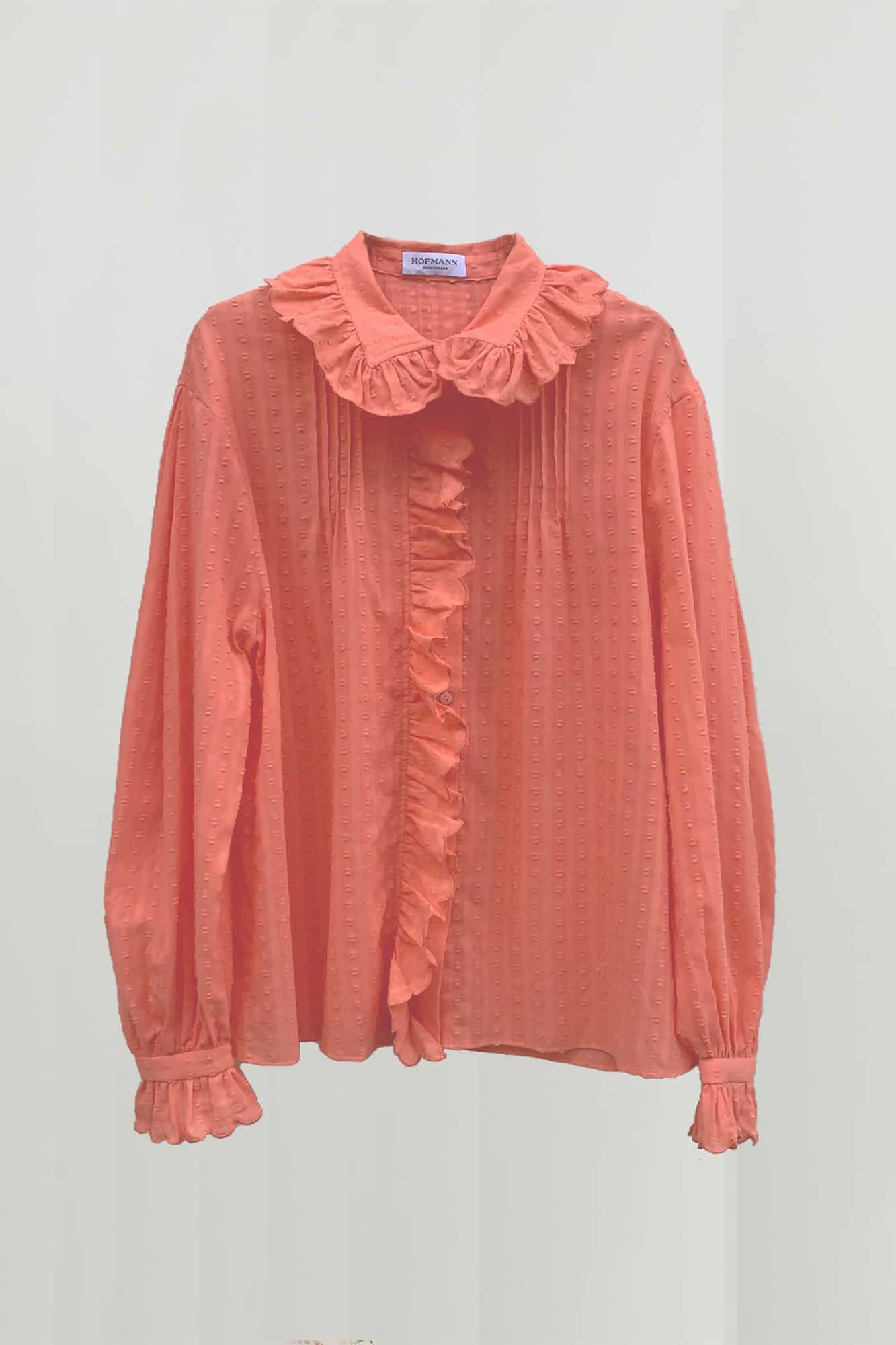 The Hofmann Copenhagen Elodie Top in coral is made from a gorgeous cotton jacquard fabric and has a front panel with ruffle scallop edges and mother of pearl buttons underneath. The pleat detail at sleeve, ruffle cuff and ruffle collar add interest to this practical blouse that will look great dressed up or down.
