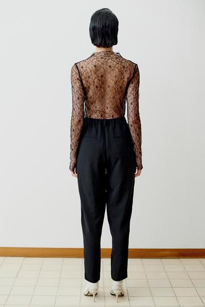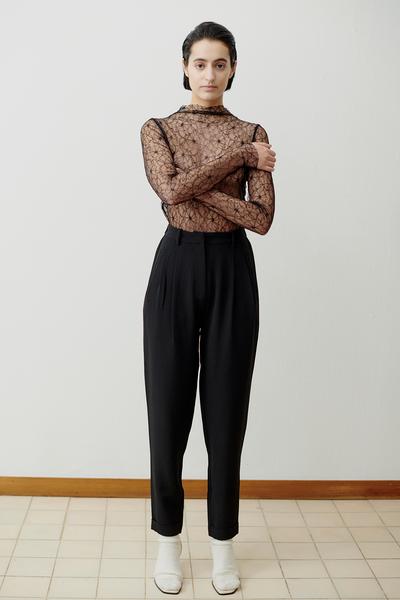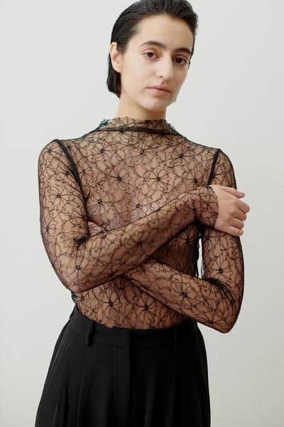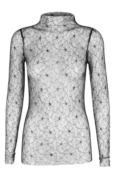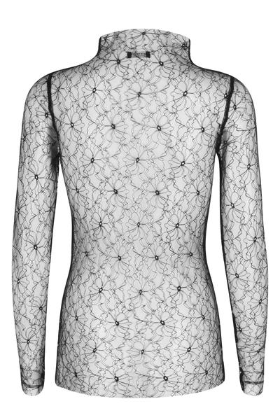 The Hofmann Copenhagen Karen lace top in black is a simple yet stunning lace top with long sleeves and high neck. The top is made from a stretch lace with cotton embroidery and is perfect for wearing under shirts or sweaters or go sexy with just a bra and a blazer for nights out.