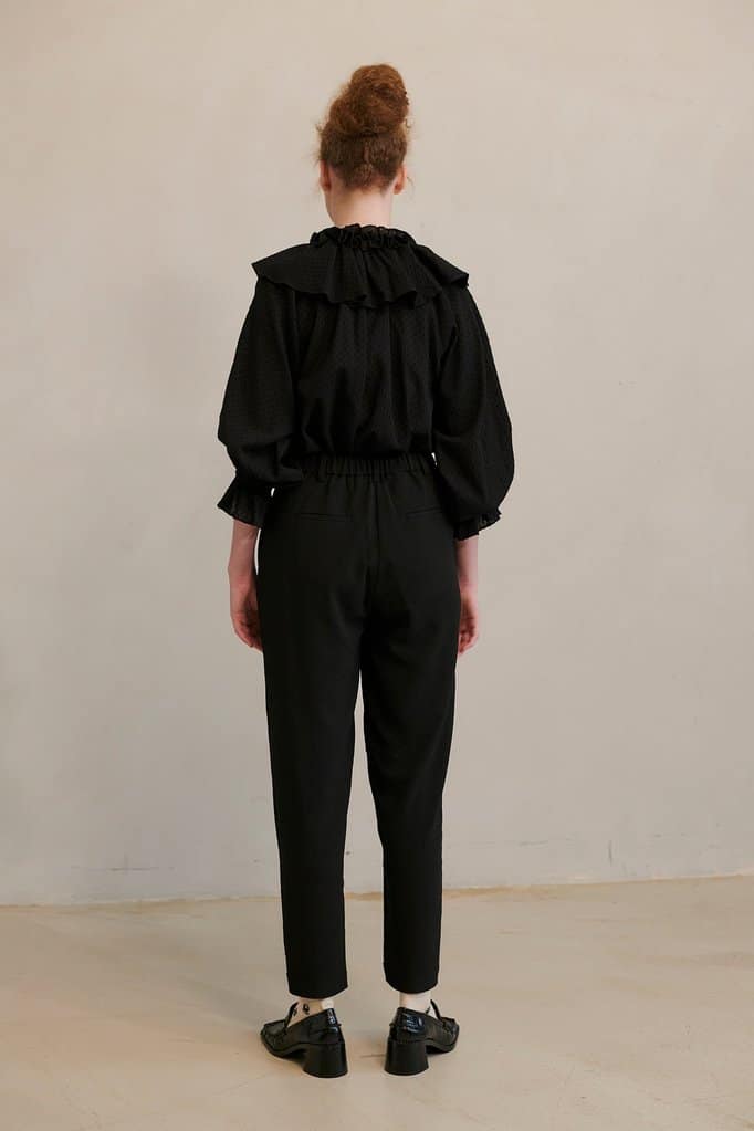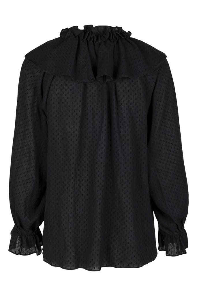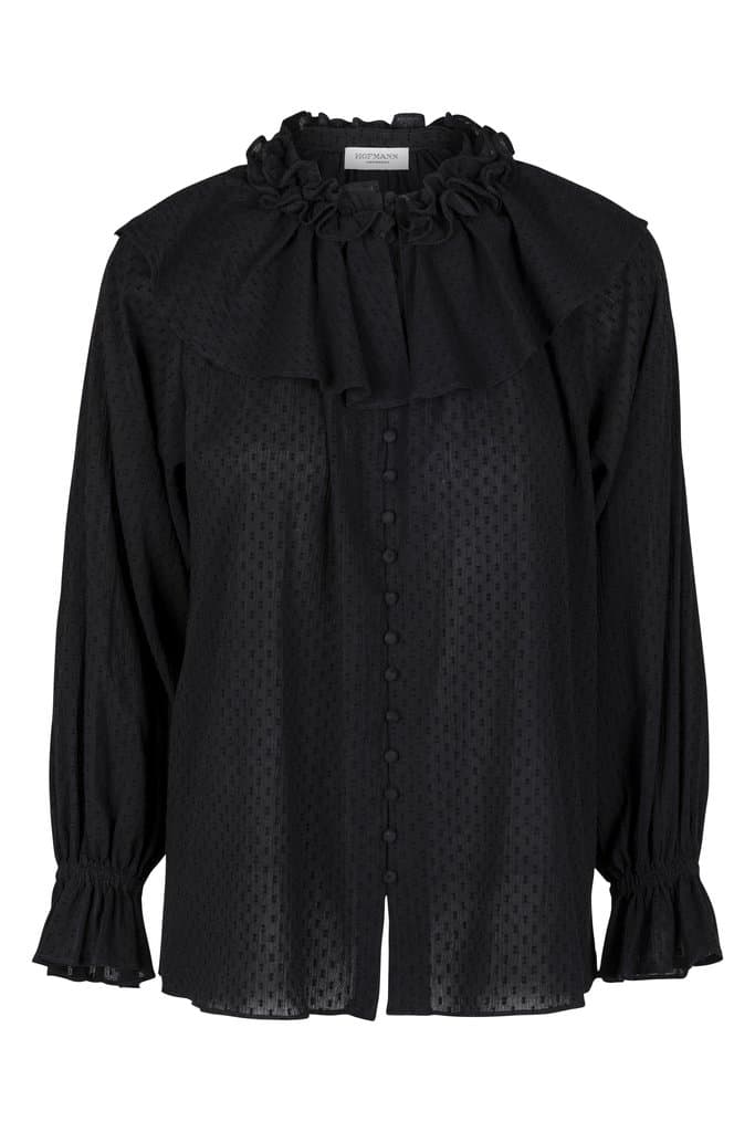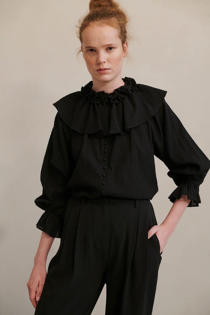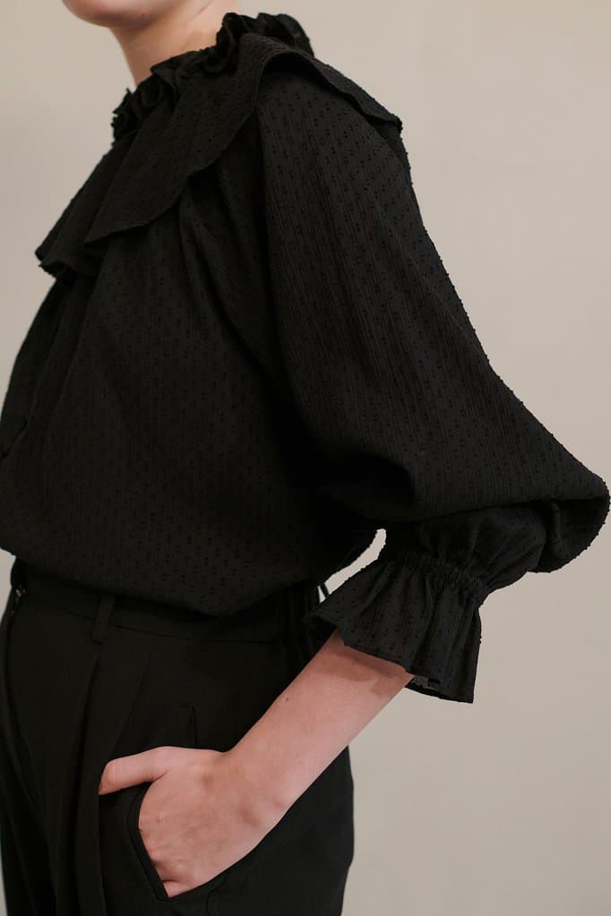 The Hofmann Copenhagen May blouse in black is simply stunning blouse with ¾ length sleeves and an exaggerated collar with a ruffle collar. The blouse is a relaxed fit and has elasticated ruffle sleeves which makes it the perfect statement blouse to wear with your favourite pair of jeans for day or night. Also available in begonia pink.